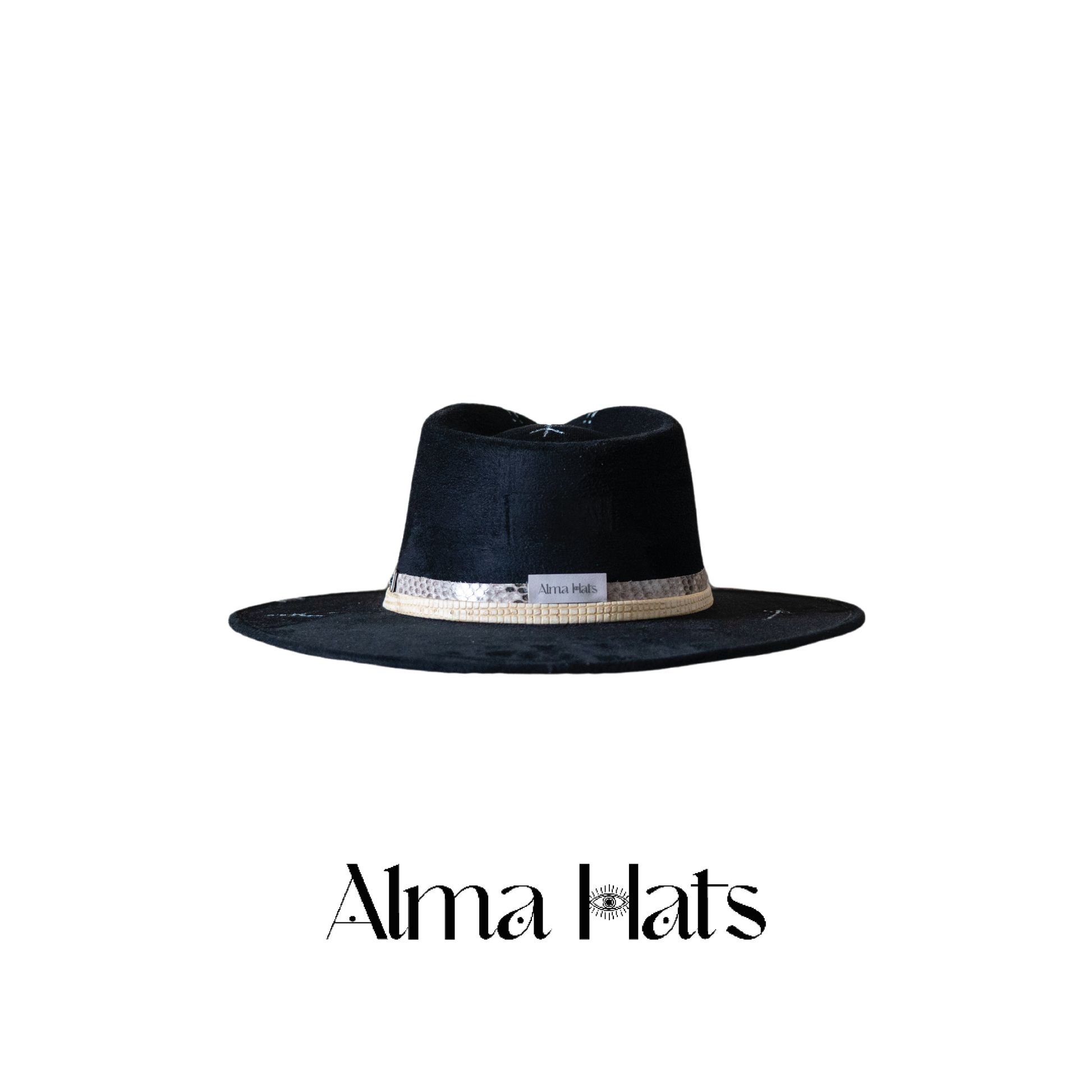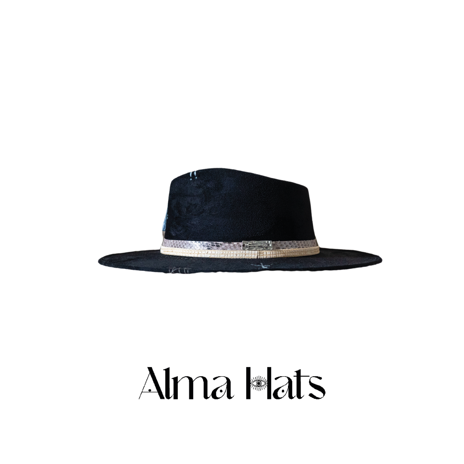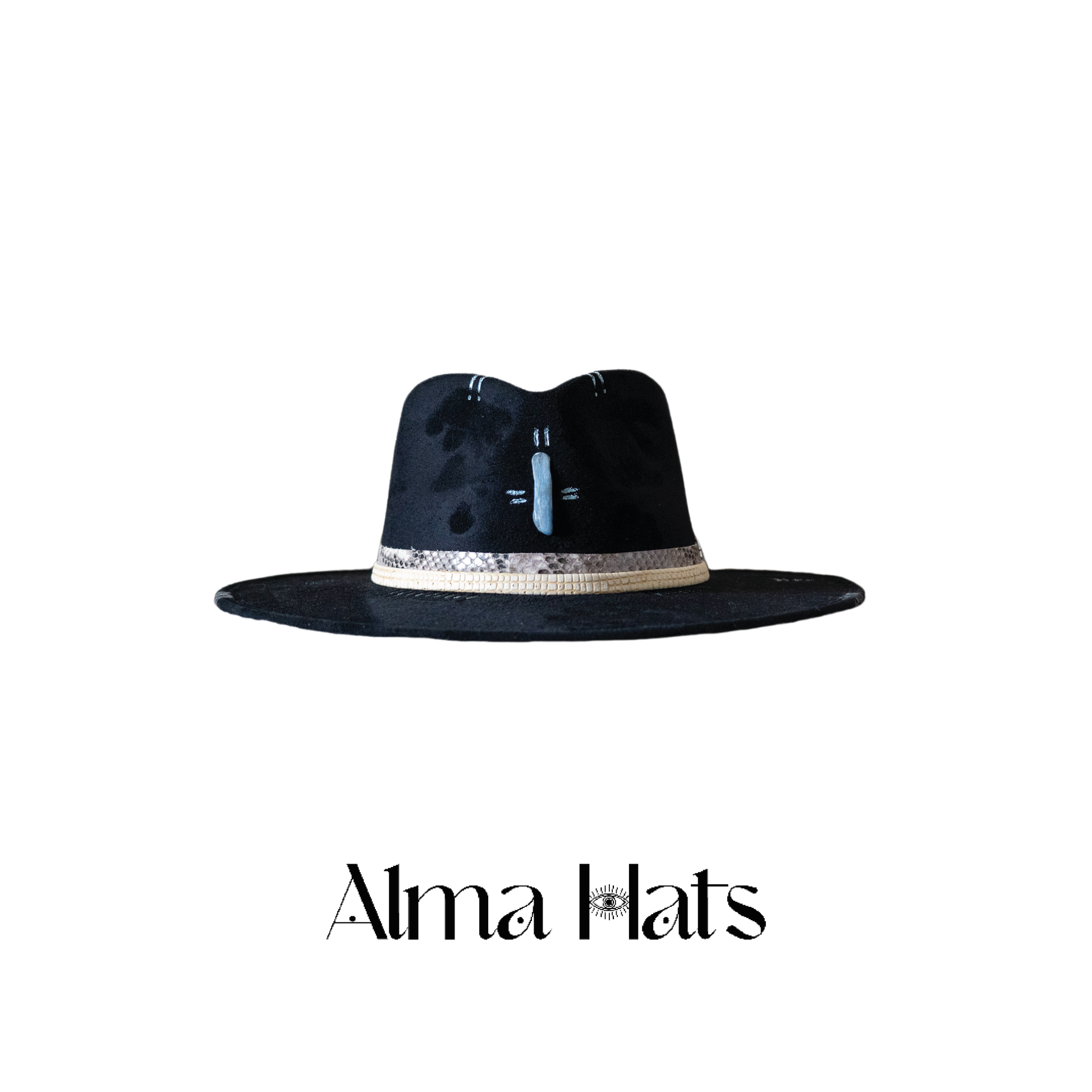 Introducing KALI, this black, one-of-a-kind handmade custom hat is a powerful and mystical creation, inspired by the fierce and transformative energy of Kali, the blue-hued Hindu goddess. Crafted in a unique drop shape, this hat is designed to make a bold statement while exuding spiritual depth and meaning.