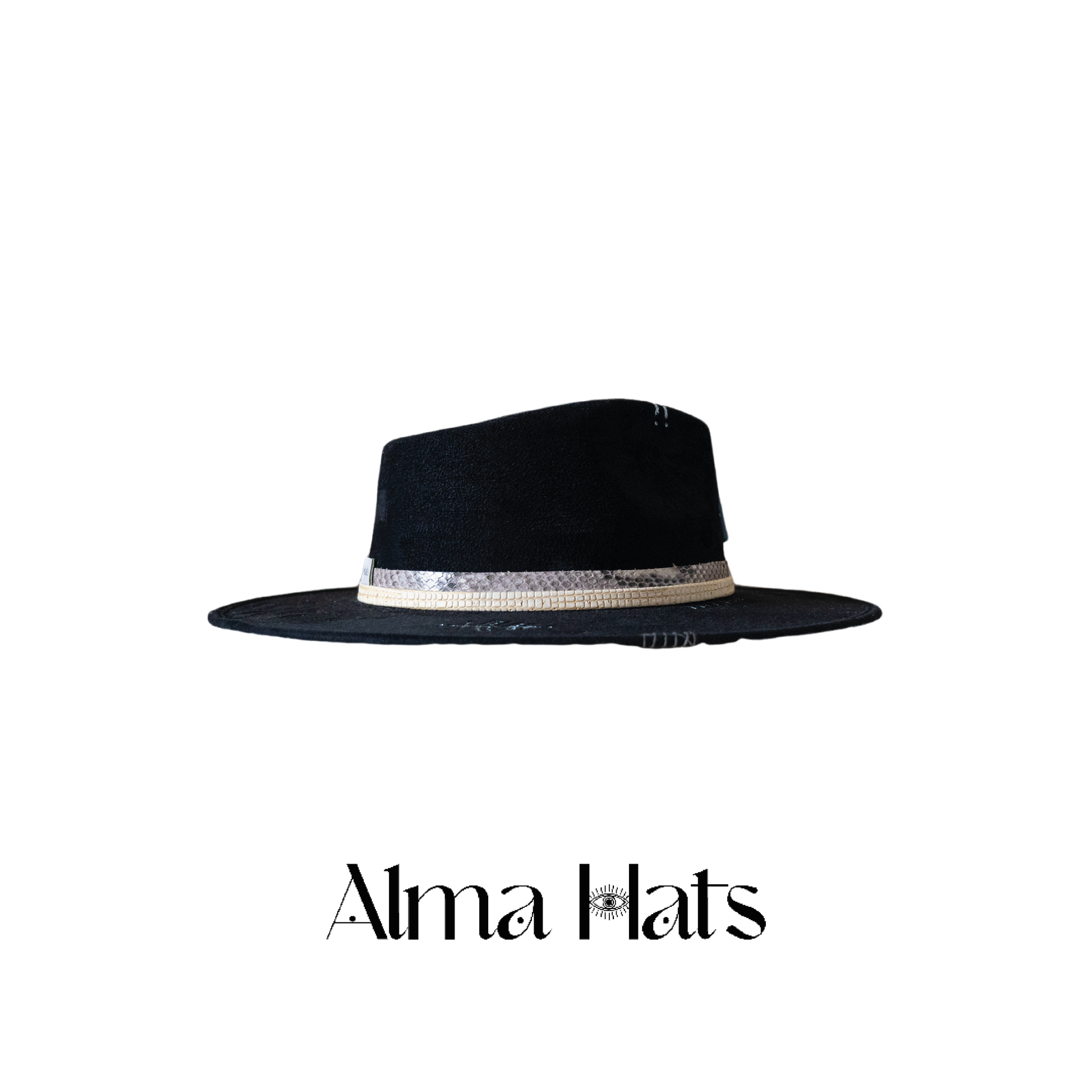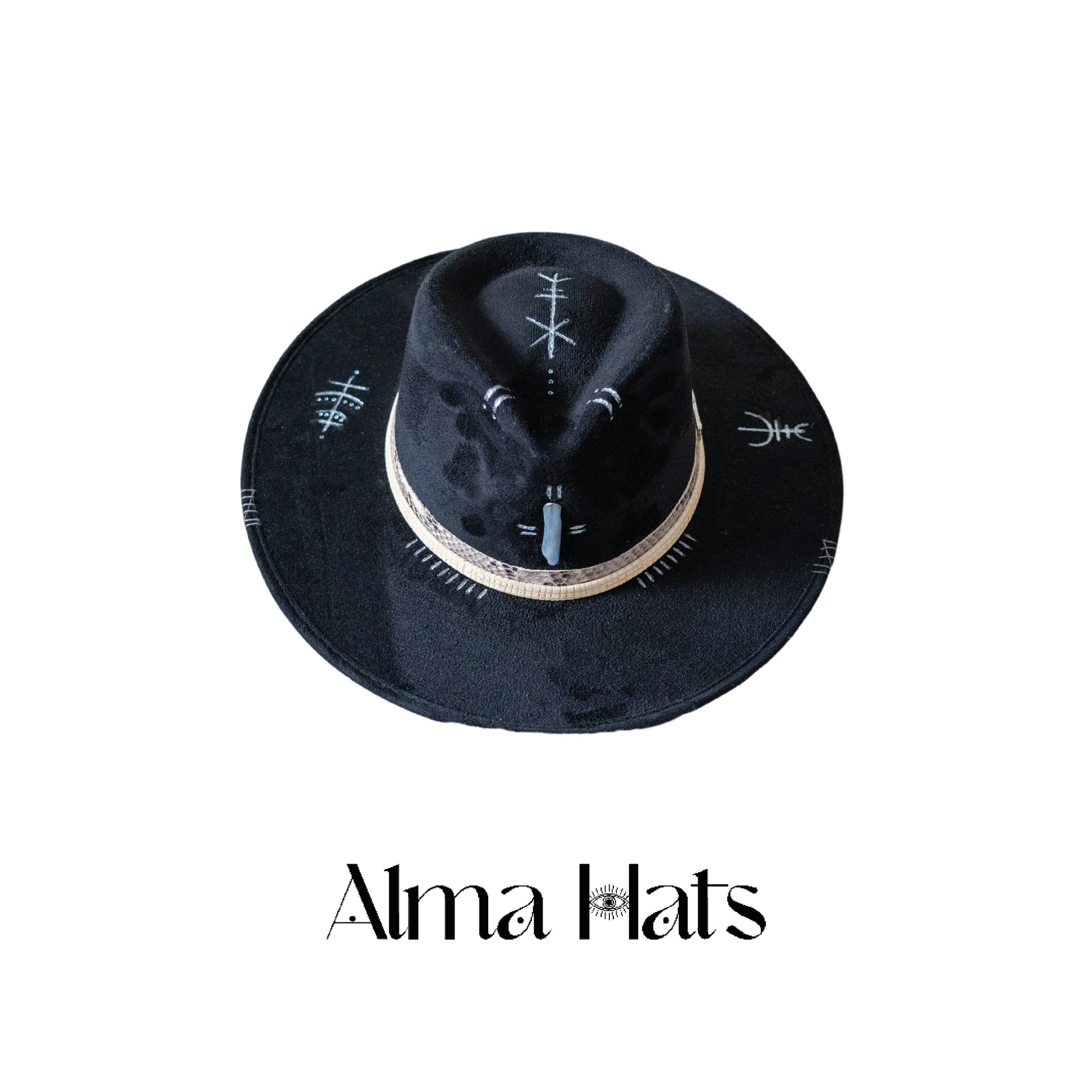 The hat’s surface features a painted and burned effect, adding layers of texture and dimension that evoke a sense of mystery and otherworldliness. This artistic treatment gives the hat an aged, almost ritualistic feel, as if it has been through sacred ceremonies or ancient rites. The smoky, charred edges contrast beautifully with the smooth black fabric, further enhancing its mystical aura.
