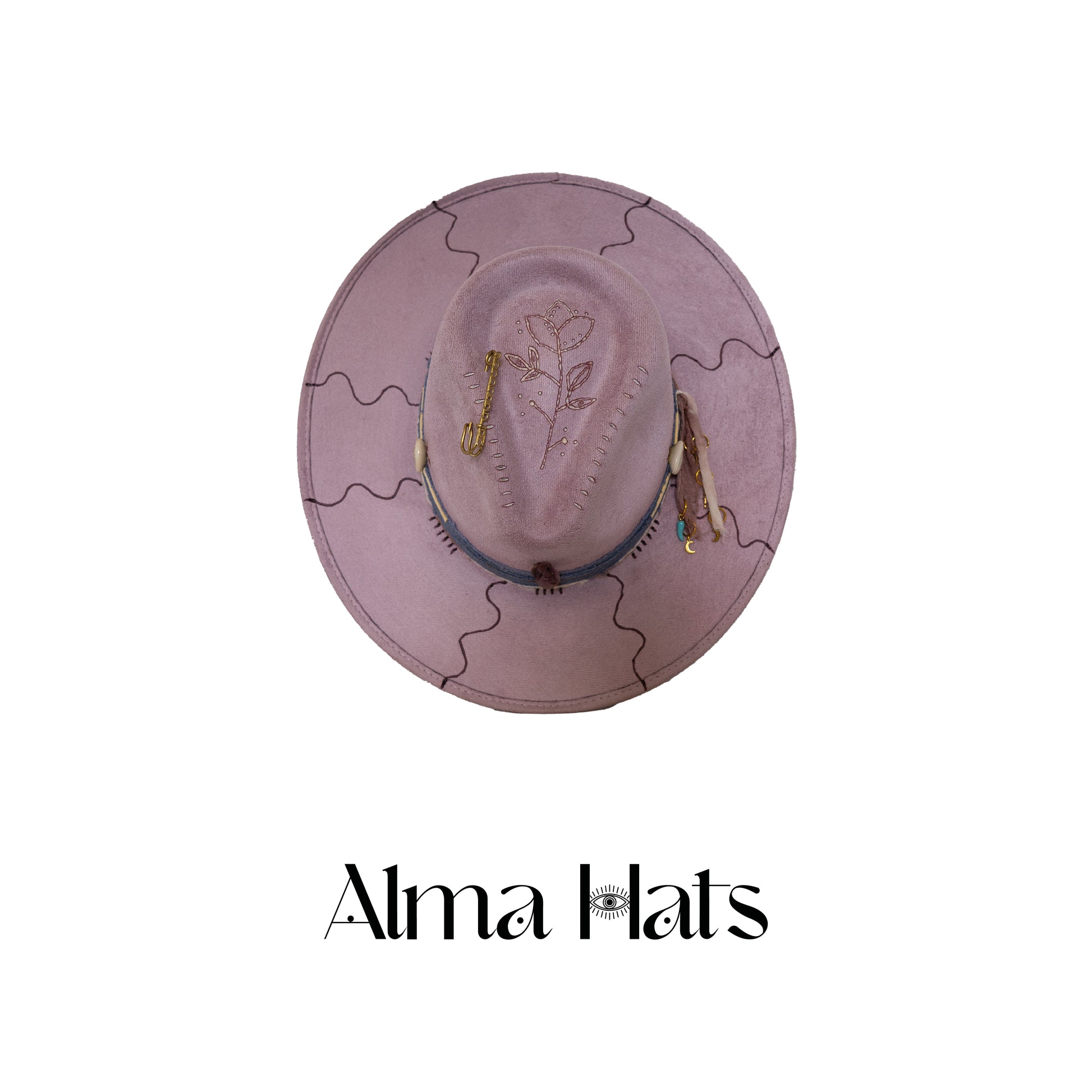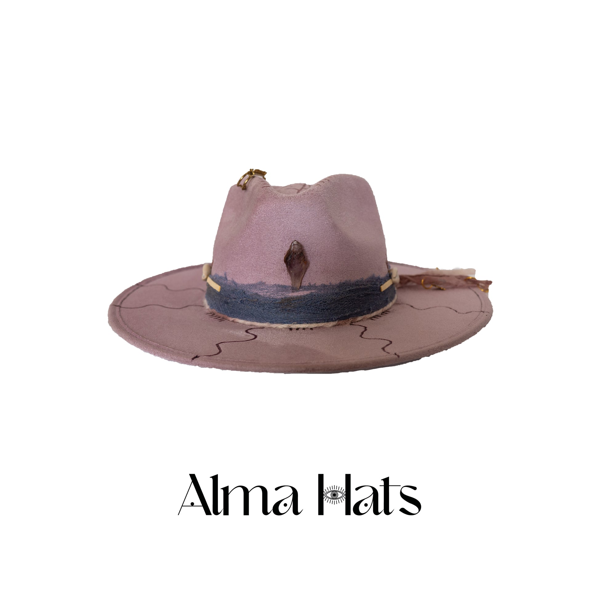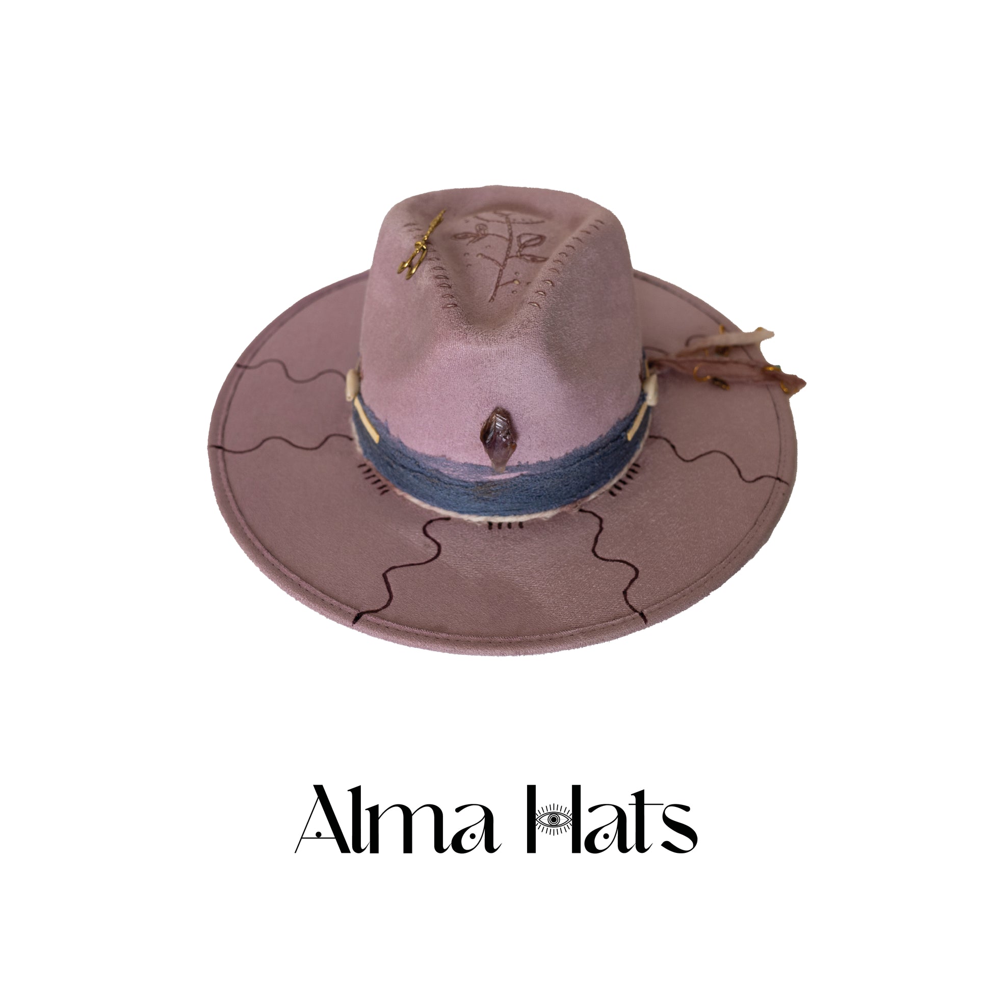 At the center, a stunning big purple stone captures the essence of spiritual connection and inner peace, while a delicate rose, burned into the top of the hat, adds an artistic touch that embodies growth and beauty. On the side, intricate details of coral designs, alongside a seashell and a hand-drawn motif, bring the essence of the ocean to life.