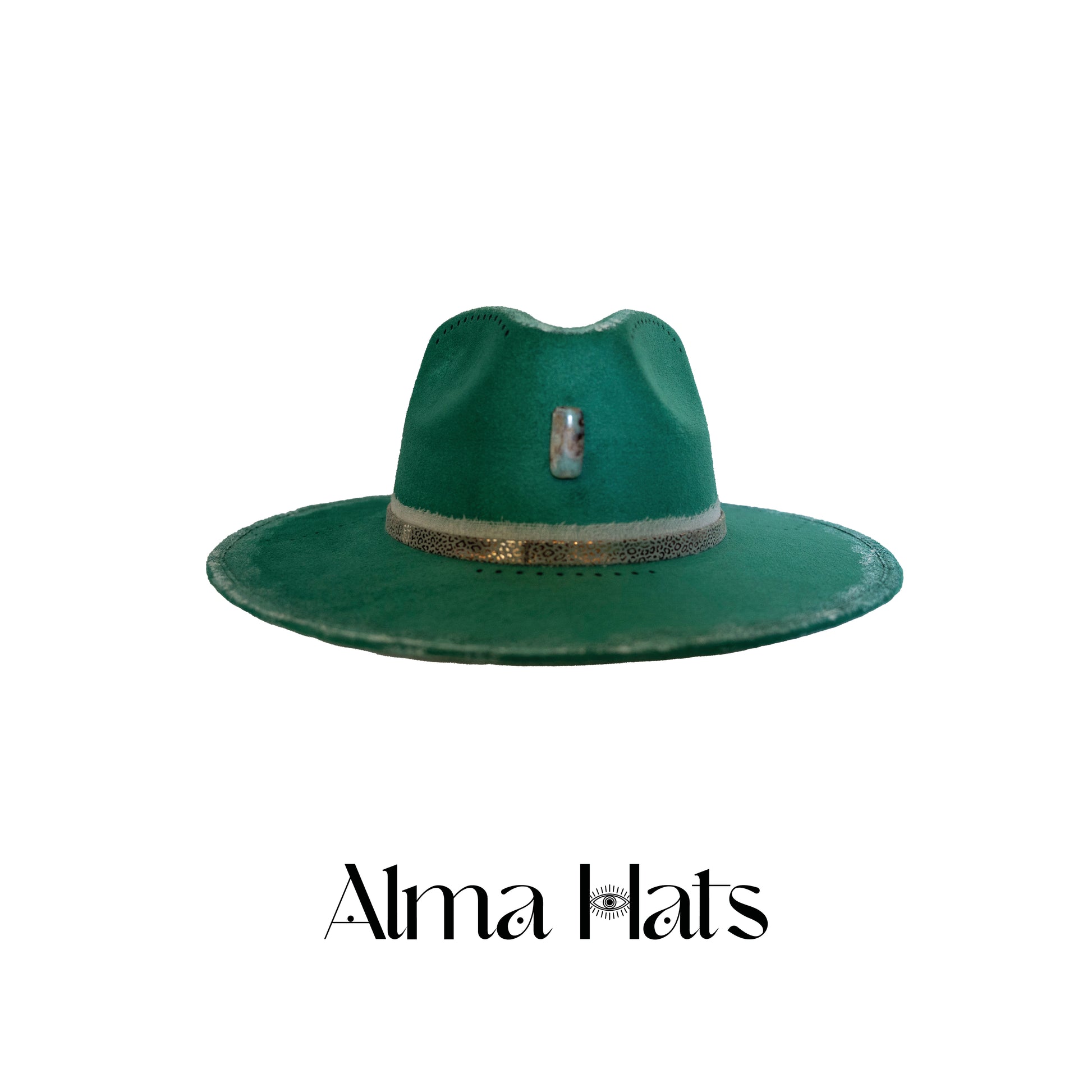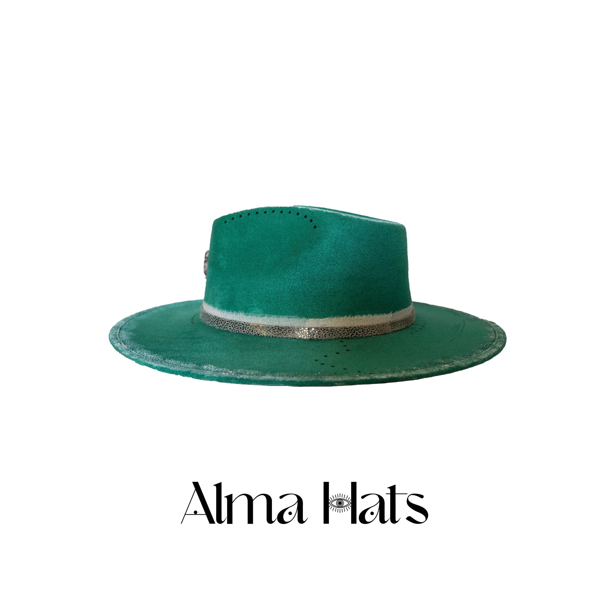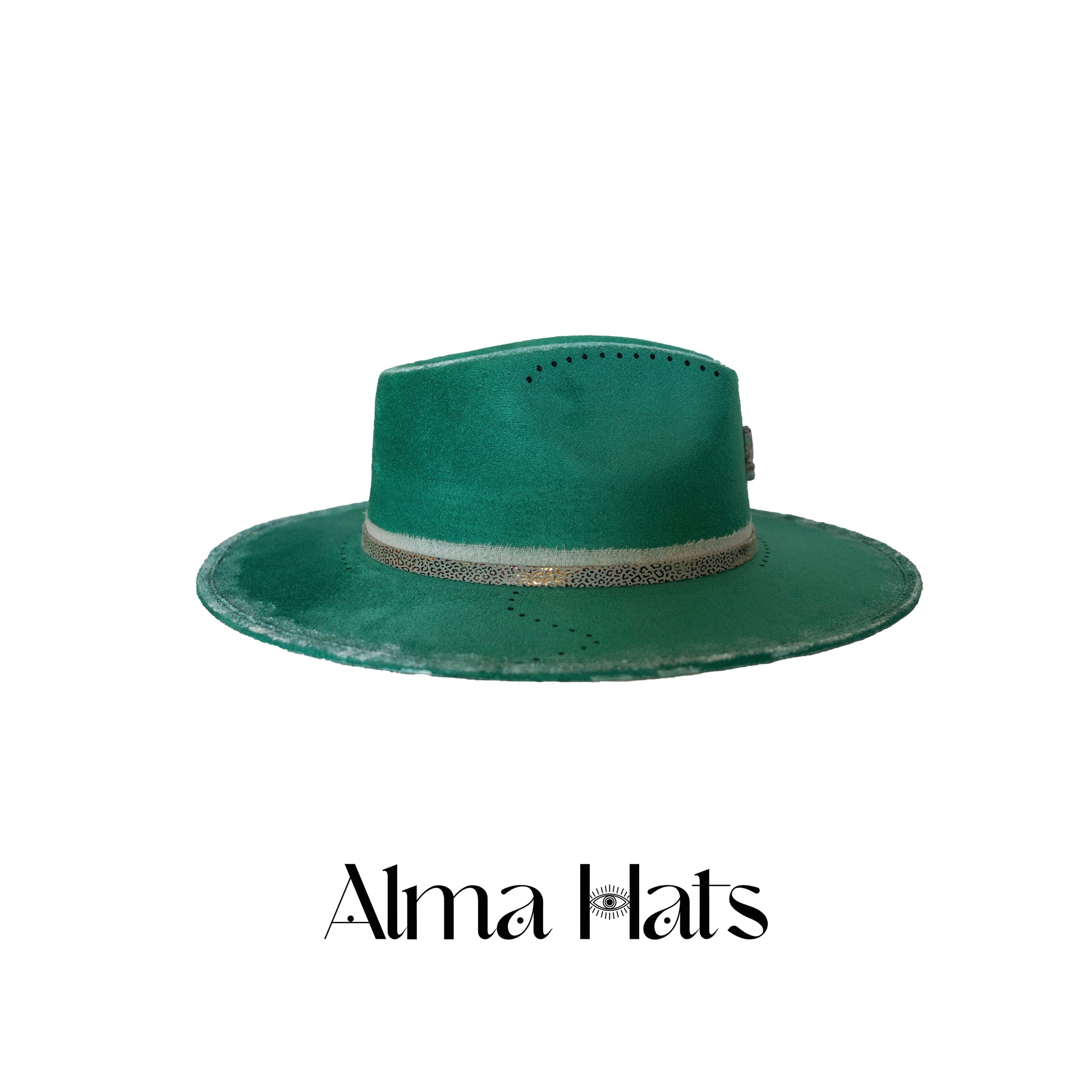 Crafted as a one-of-a-kind piece for the exclusive boutique Kurru Kurru at Cotton Beach Club, this mint green fedora captures the vibrant soul of Ibiza with an elegant, artisanal touch. Its fresh hue reflects the island’s coastal breeze and tranquil waters, while every curve and detail speaks of intention and craftsmanship.