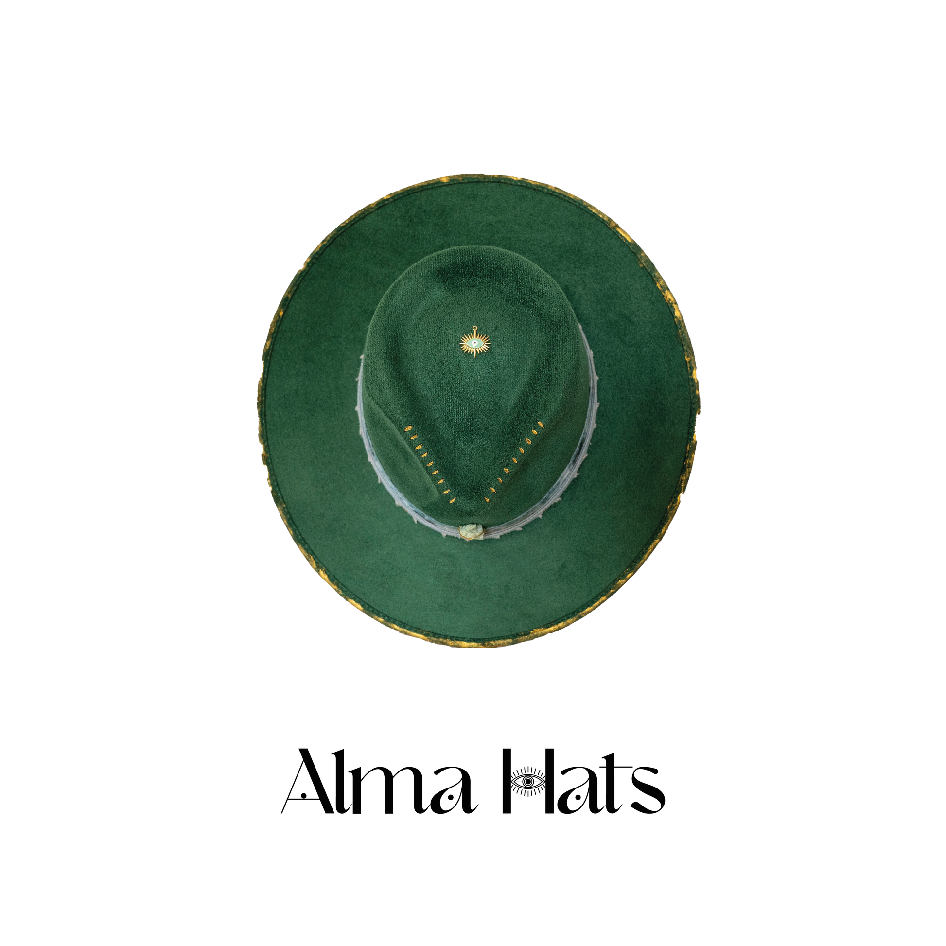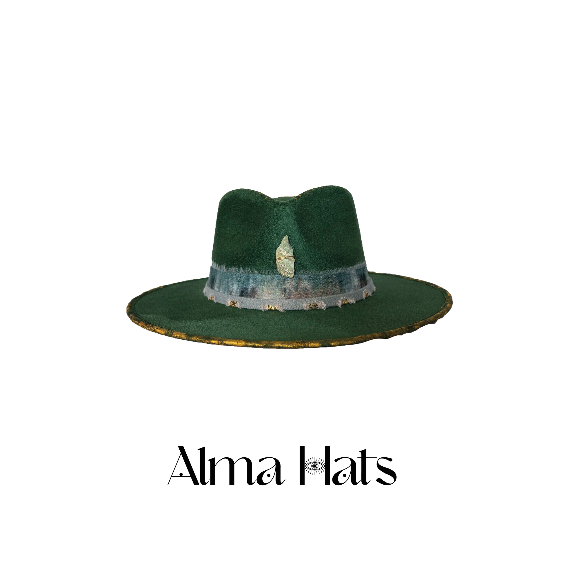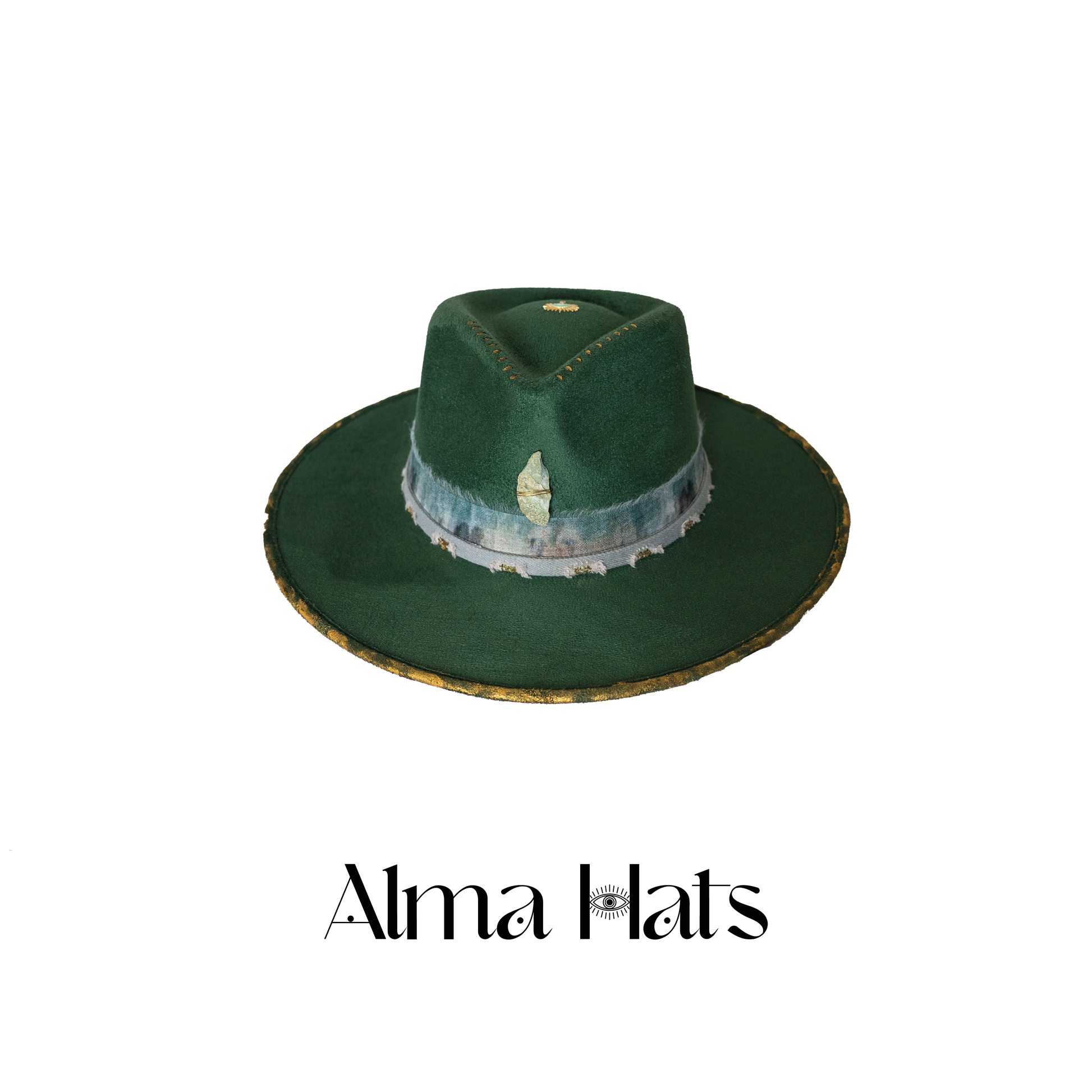 Golden Roots is a unique custom-made green fedora, designed as a symbol of grounding, growth, and inner radiance. At its heart rests a Fuchsite stone, known for its power to open the heart, accept invisible energies, and encourage emotional healing. The crown is adorned with gold paint and fine pyrography, creating organic patterns that evoke the strength and wisdom of nature. A gold pendant at the top completes the design, adding a luminous touch that celebrates connection between earth and spirit.