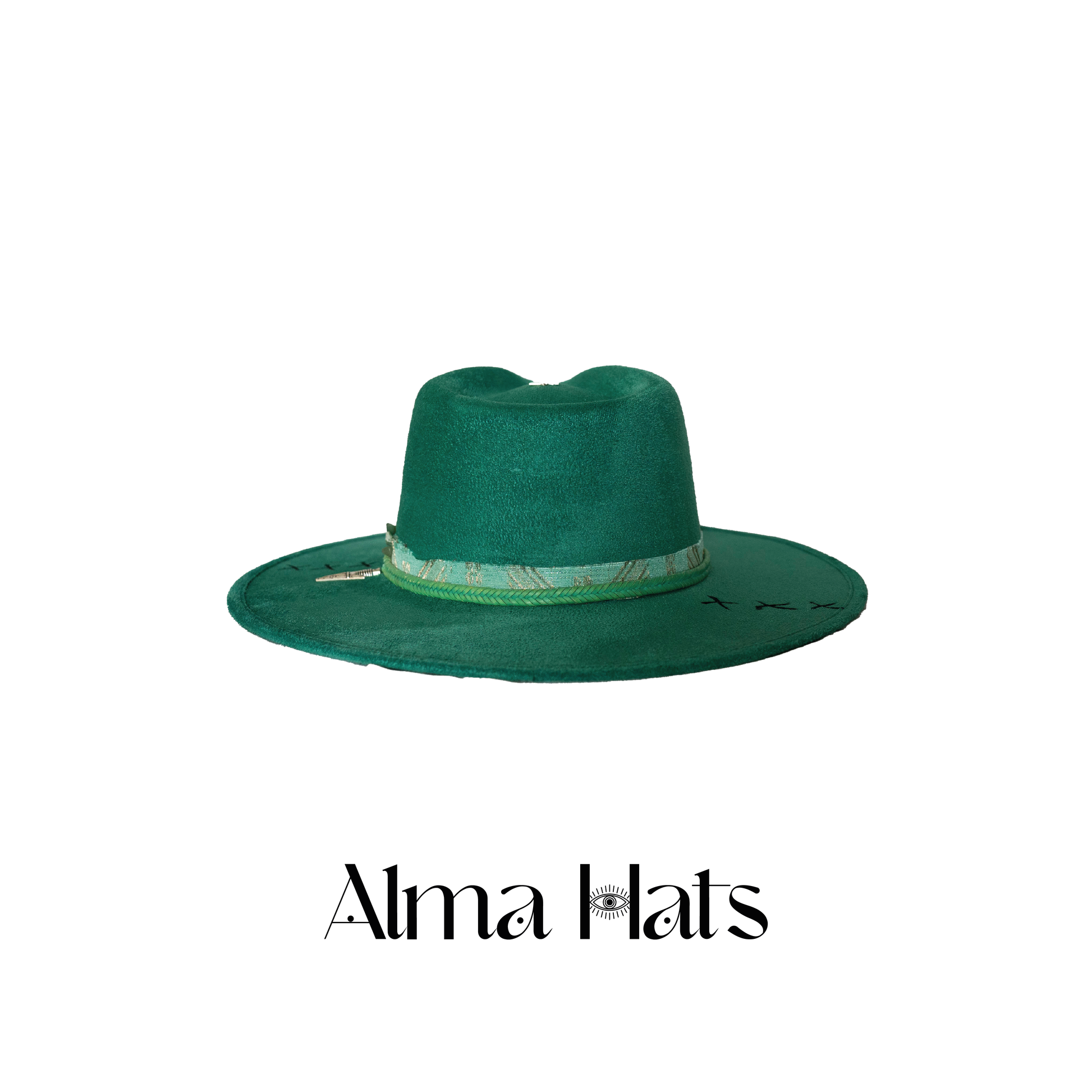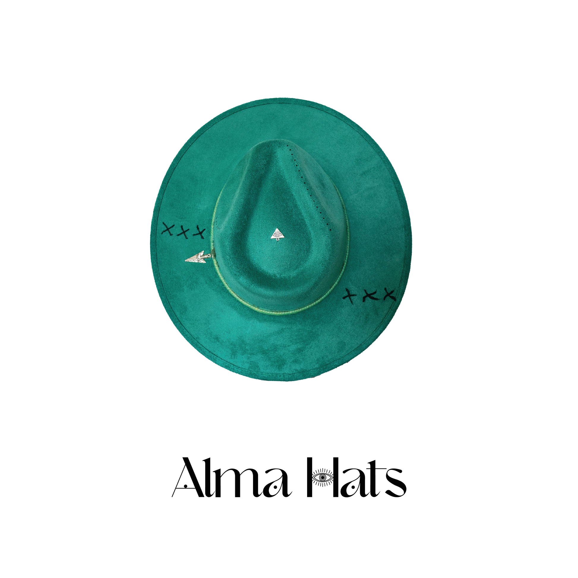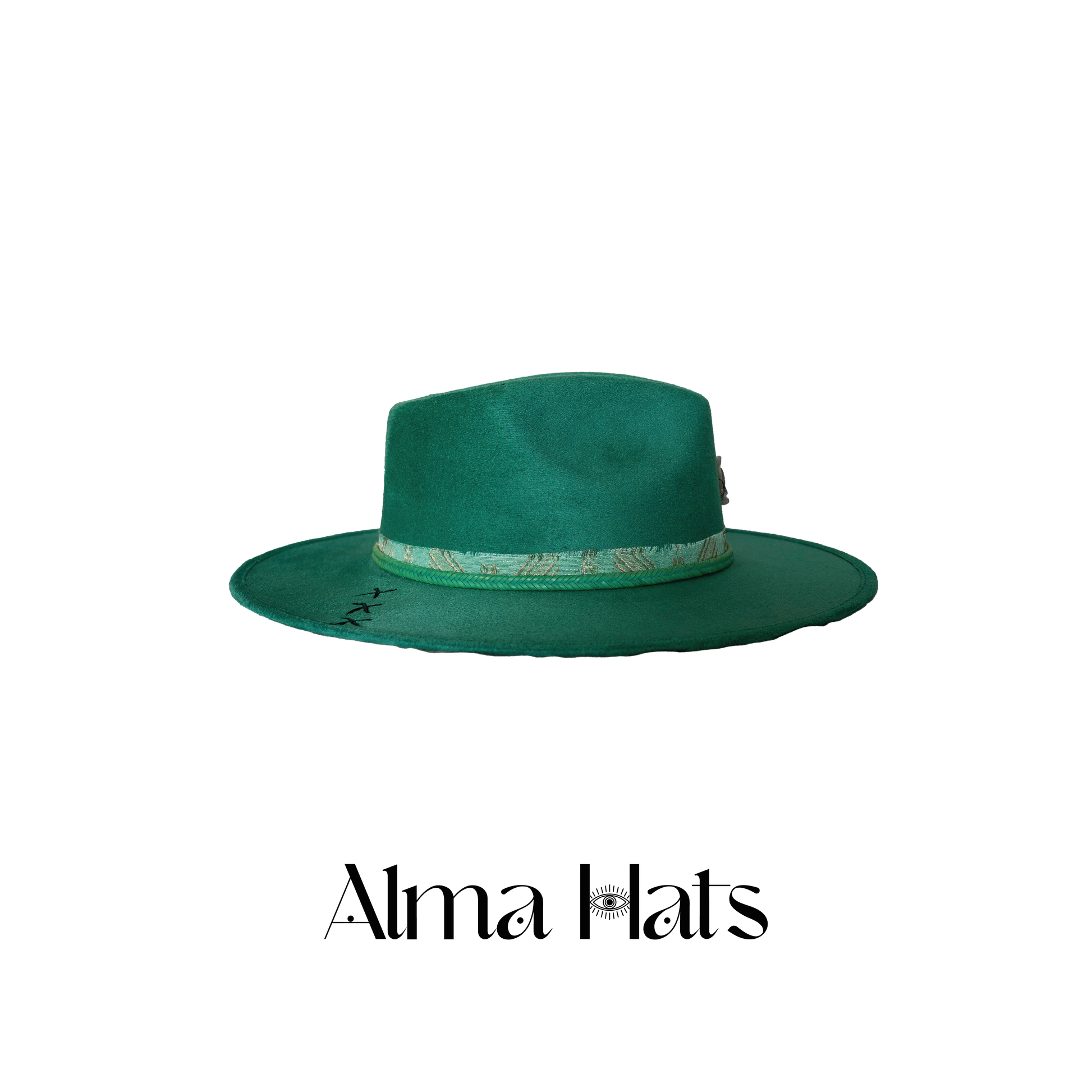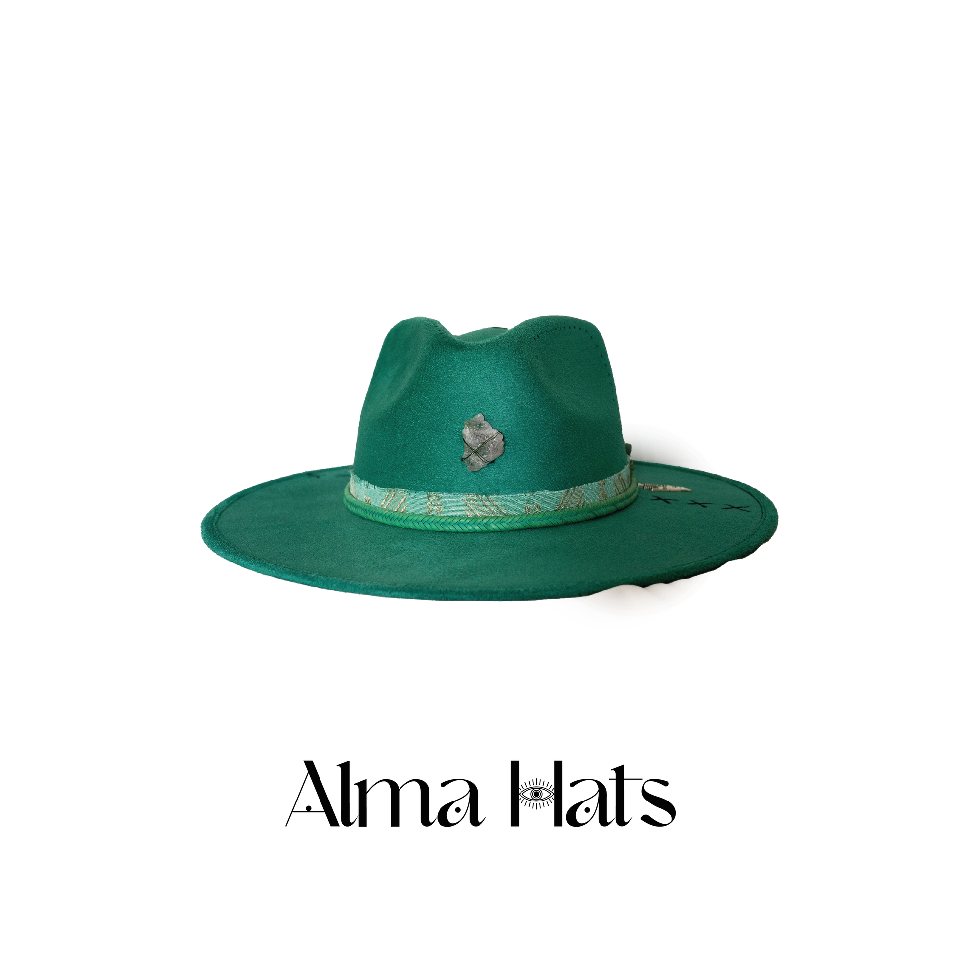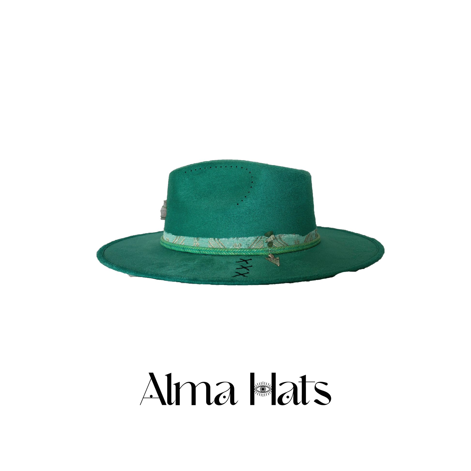 Mintera is a one-of-a-kind green mint fedora that embodies freshness, elegance, and individuality. At its center rests a pink quartz, radiating love, harmony, and positive energy. The crown is wrapped with a green mint leather cord, accented with silver pendants, creating a unique blend of subtle luxury and playful charm.