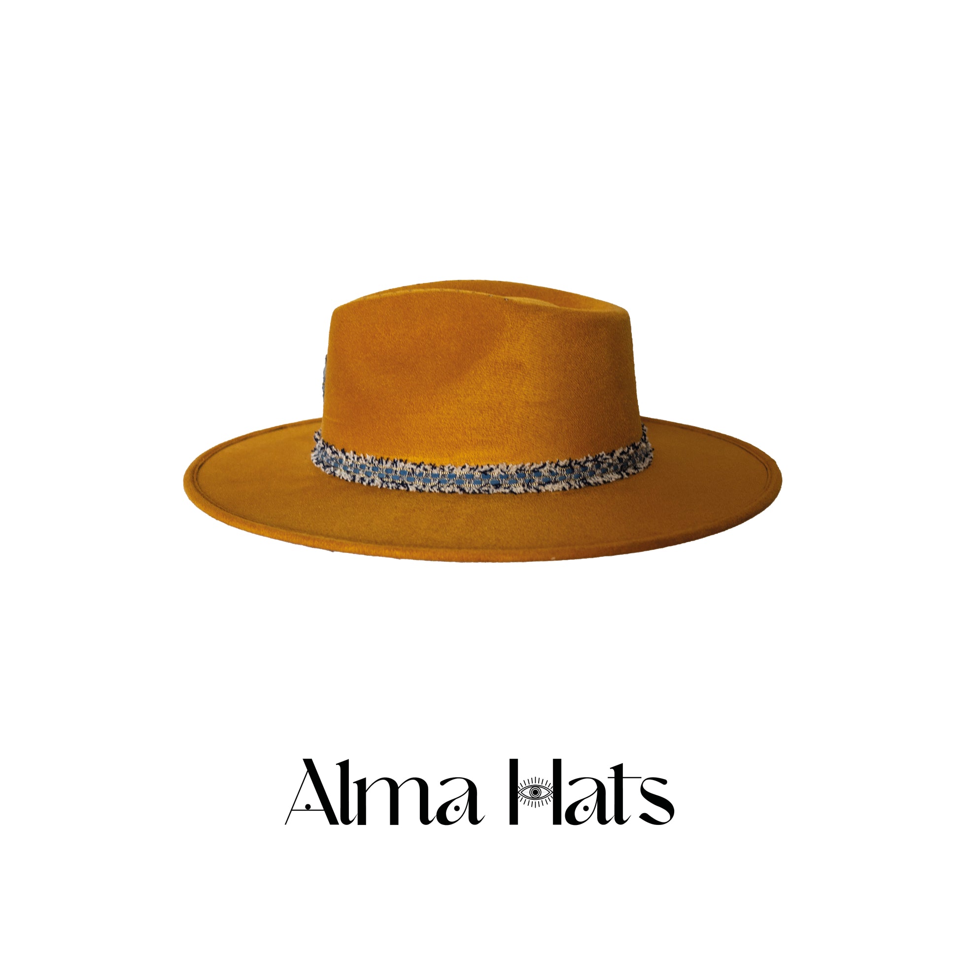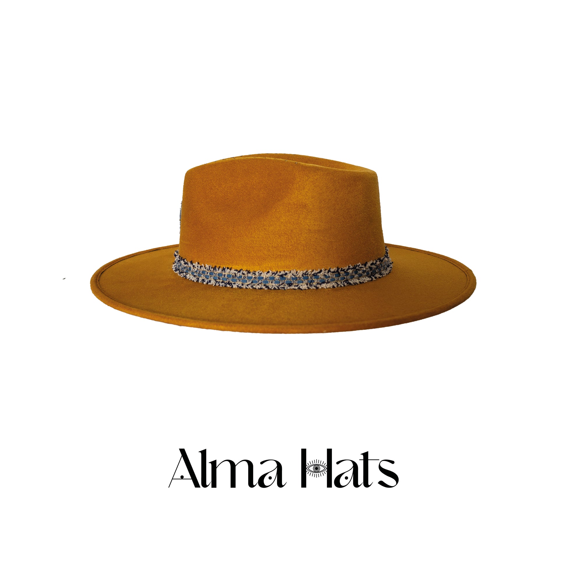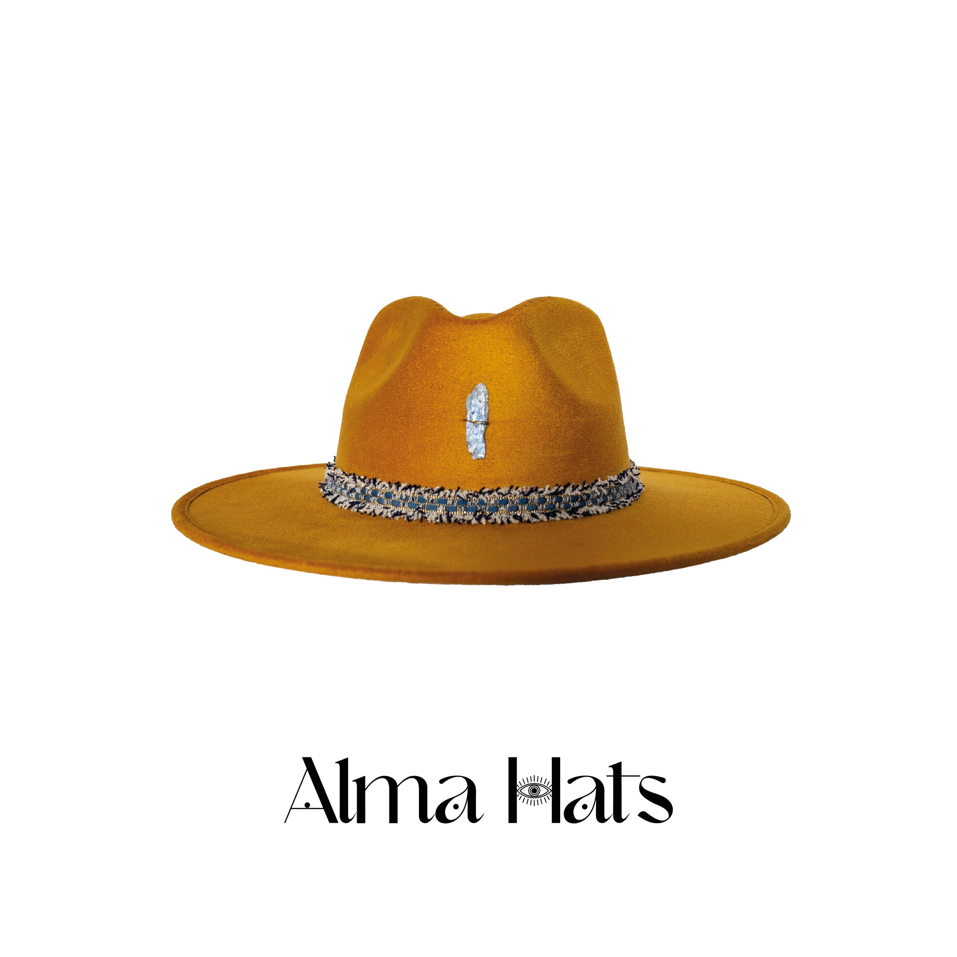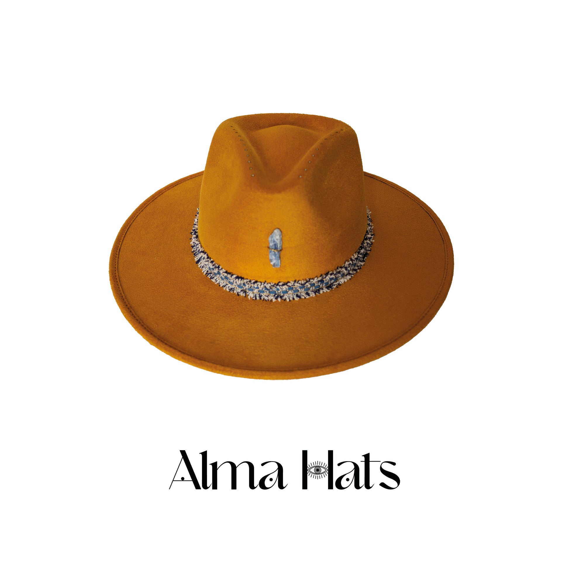 Radiant and calming, this handmade yellow fedora combines vibrant energy with serene protection. At the heart of the hat, a kyanite stone sits as a symbol of protection and energetic cleansing, known for its ability to clear blockages and balance the energy field. The kyanite’s soothing blue hue offers a perfect contrast to the warm, inviting yellow of the fedora, creating a sense of calm and inner peace.
