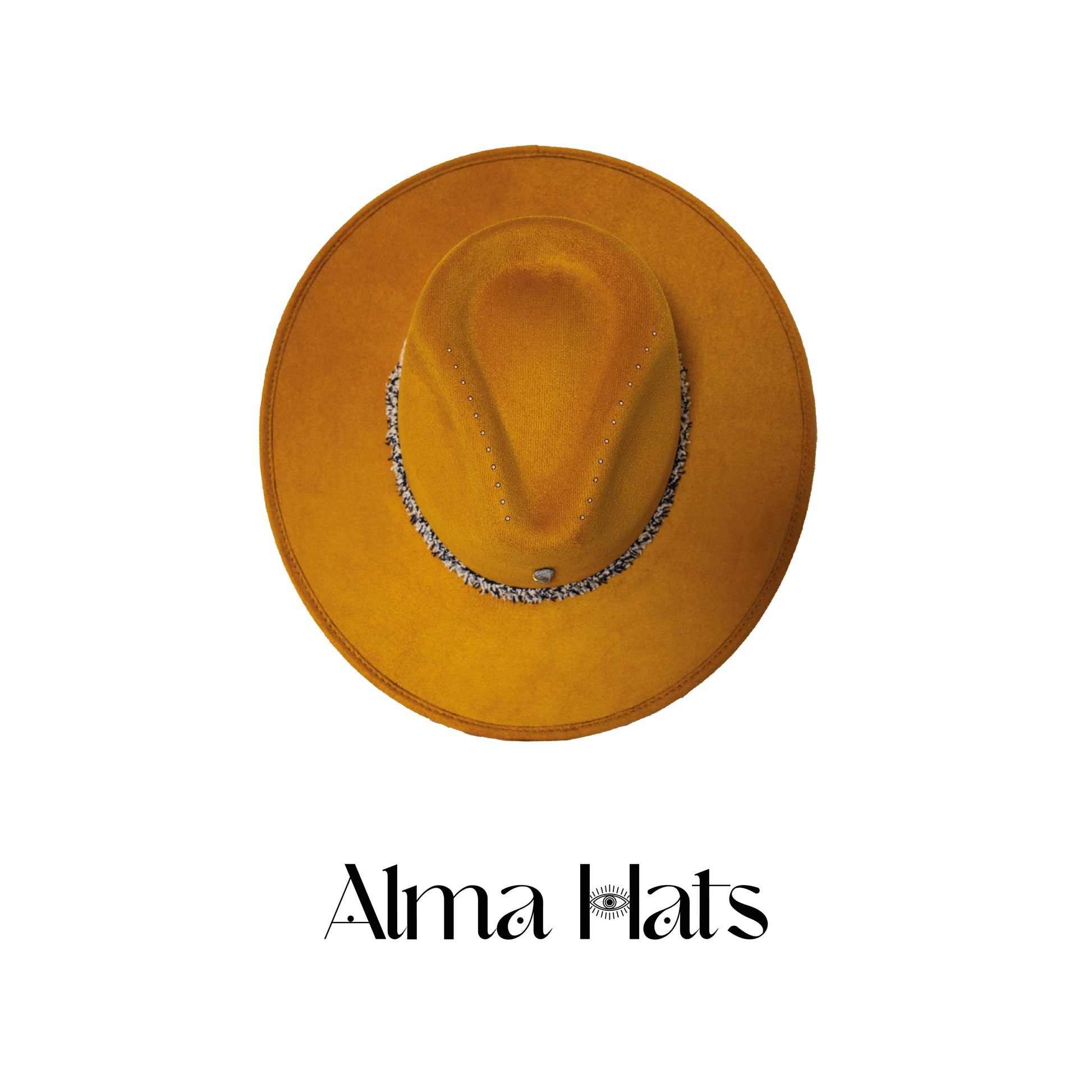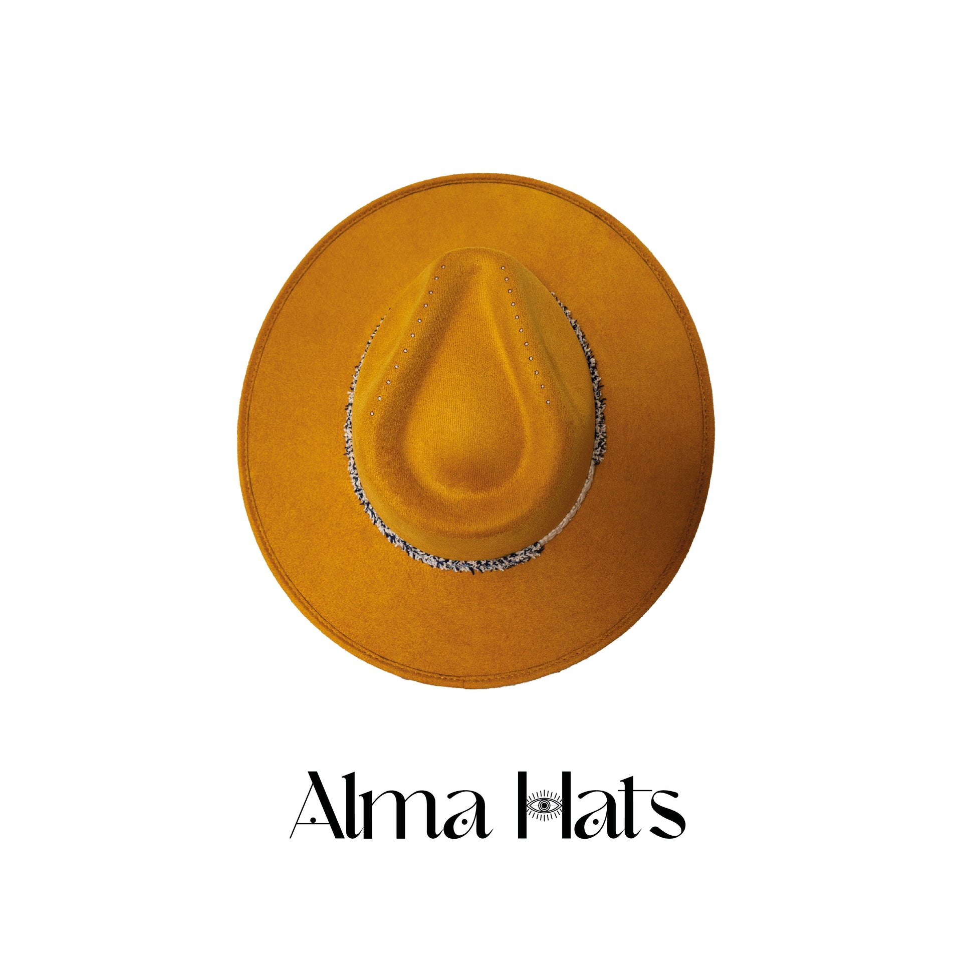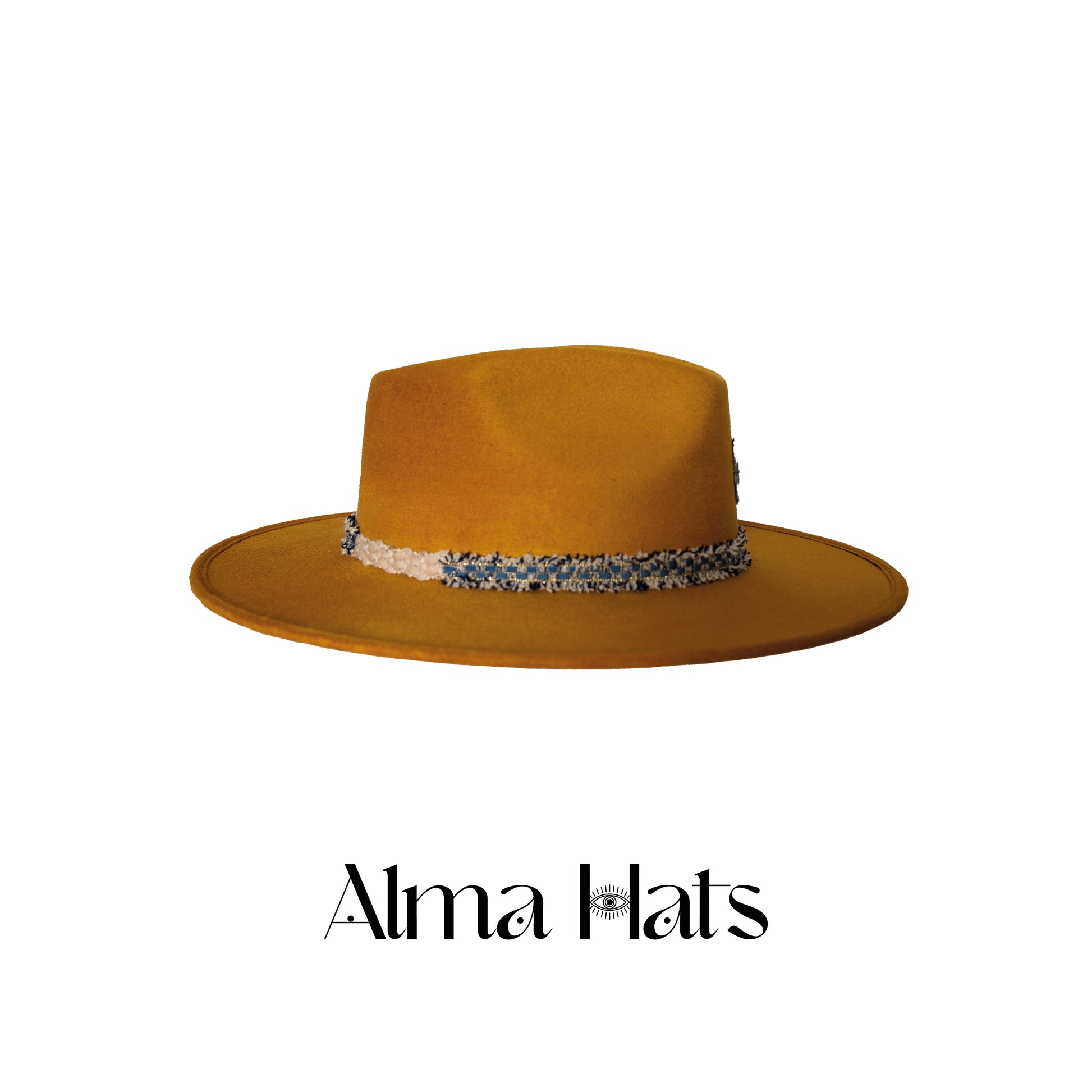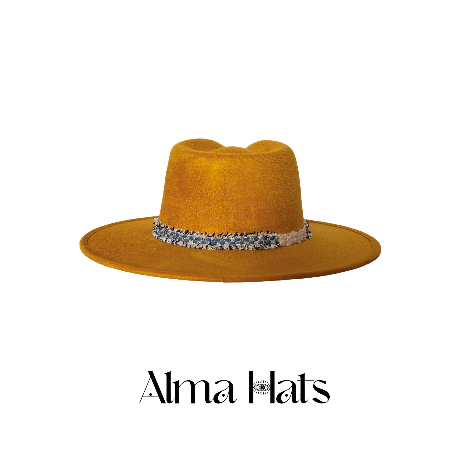 The hat’s bright yellow felt radiates positivity and creativity, while the stunning fabric strip wrapped around the base adds a touch of subtle luxury and texture. The simplicity of the design ensures the focus remains on the harmonious blend of color, energy, and elegance, creating a versatile piece that can be worn with ease and grace.