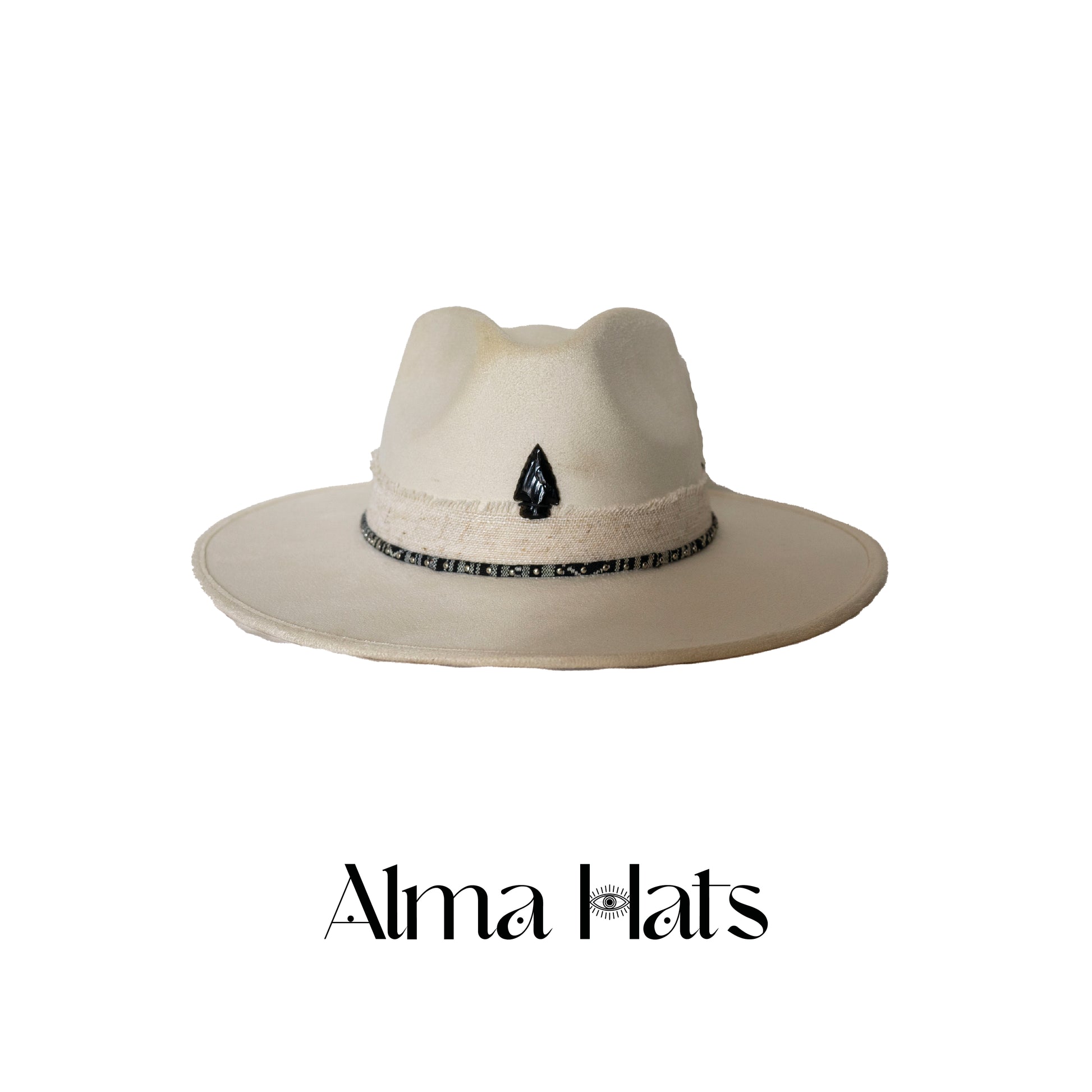 Sophisticated and timeless, this handmade white fedora exudes elegance while offering powerful protection and energetic purification. At the center, an obsidian arrow rests, a symbol of direction and clarity, known for its ability to cleanse negative energies and shield the wearer from external influences. The obsidian arrow serves as a protective talisman, grounding and focusing the wearer’s energy with strength and precision.