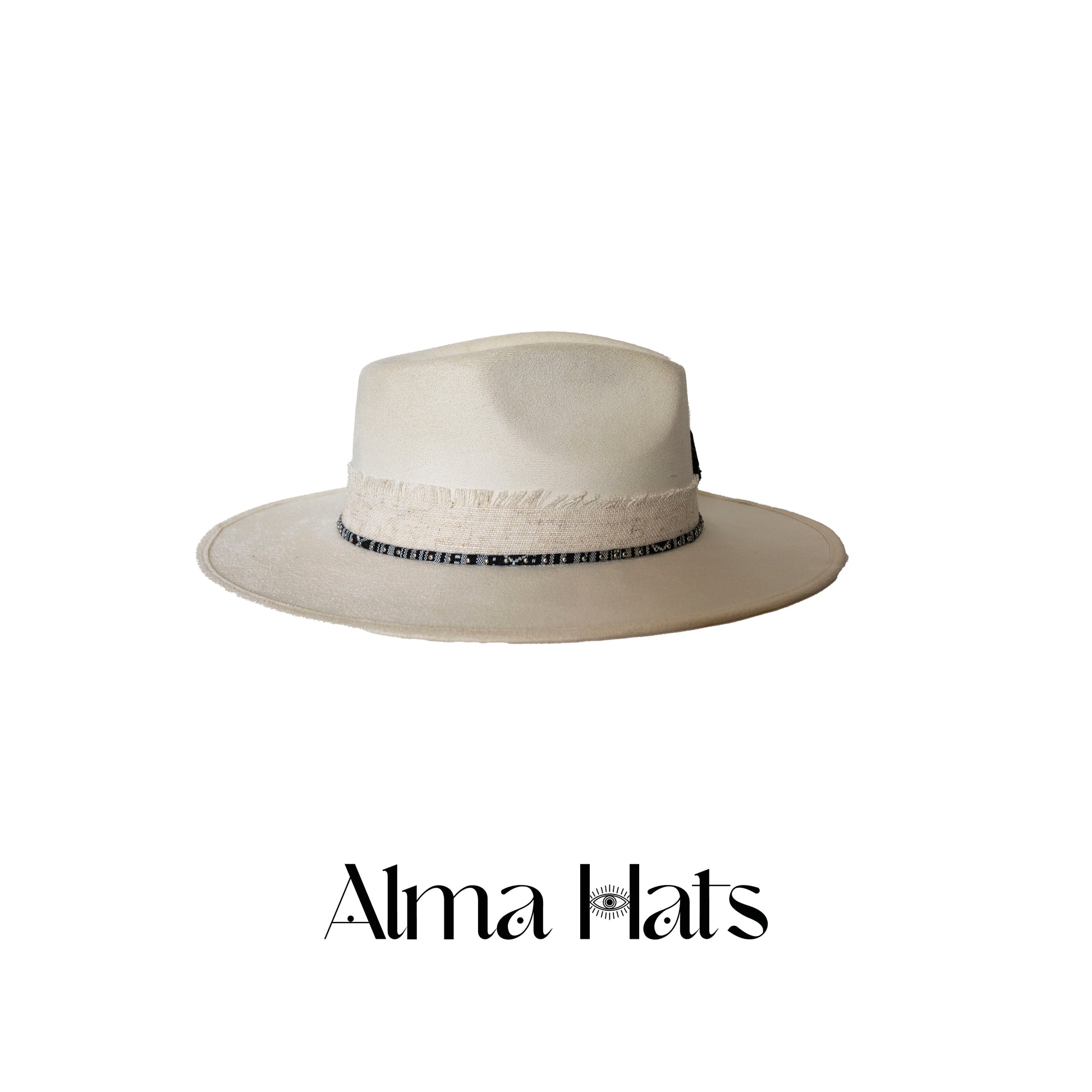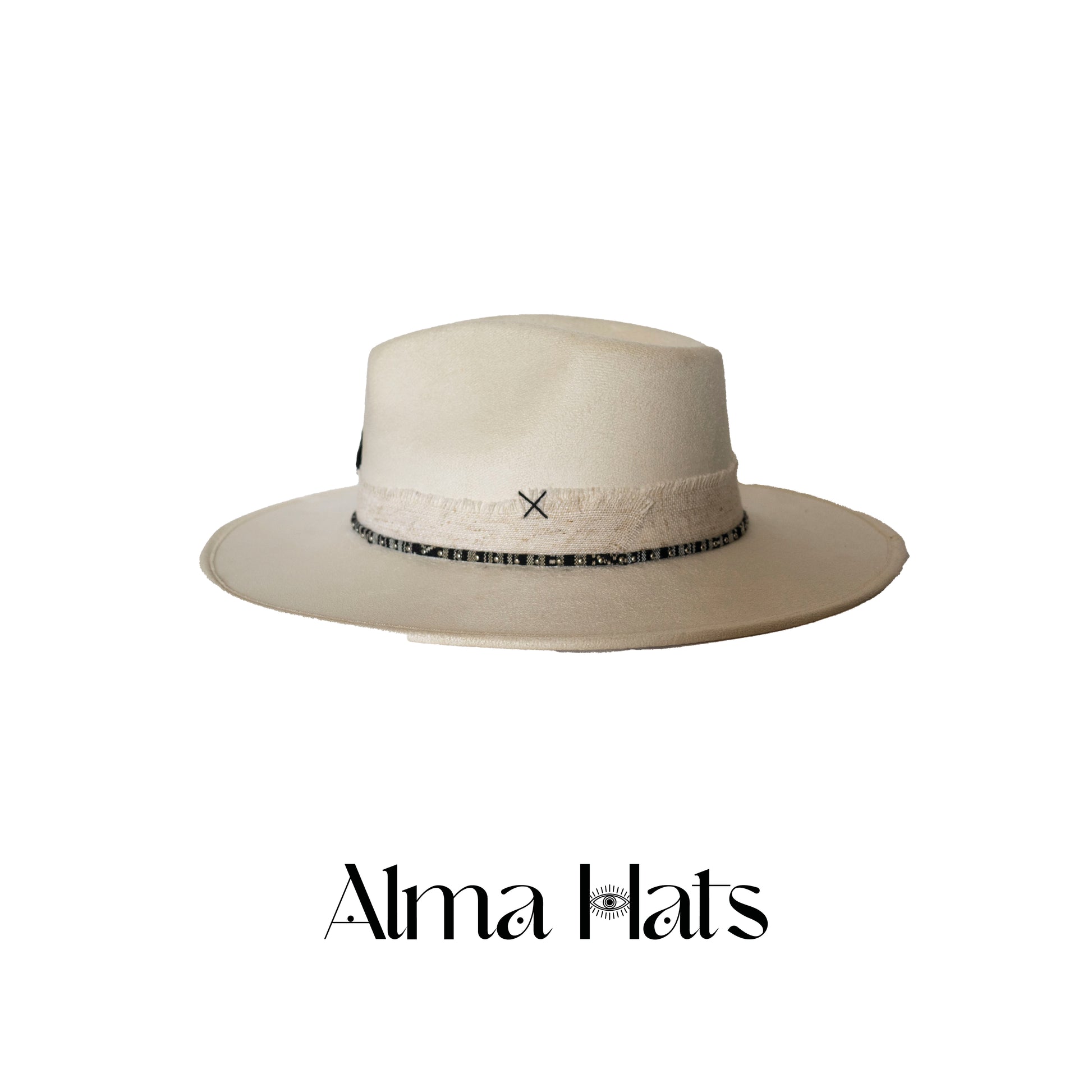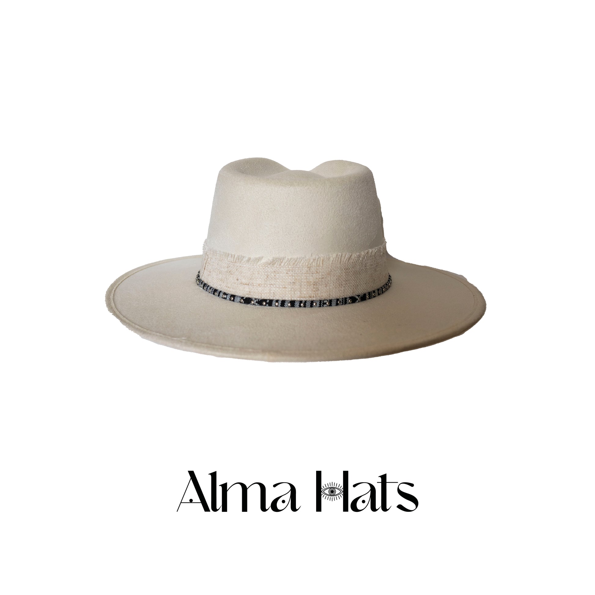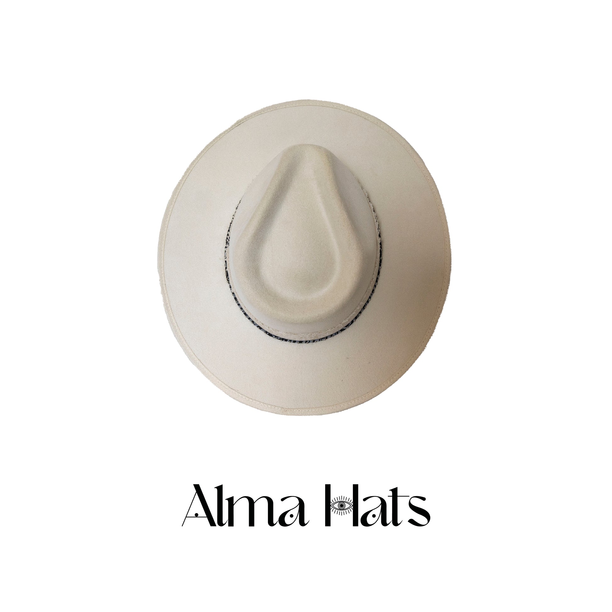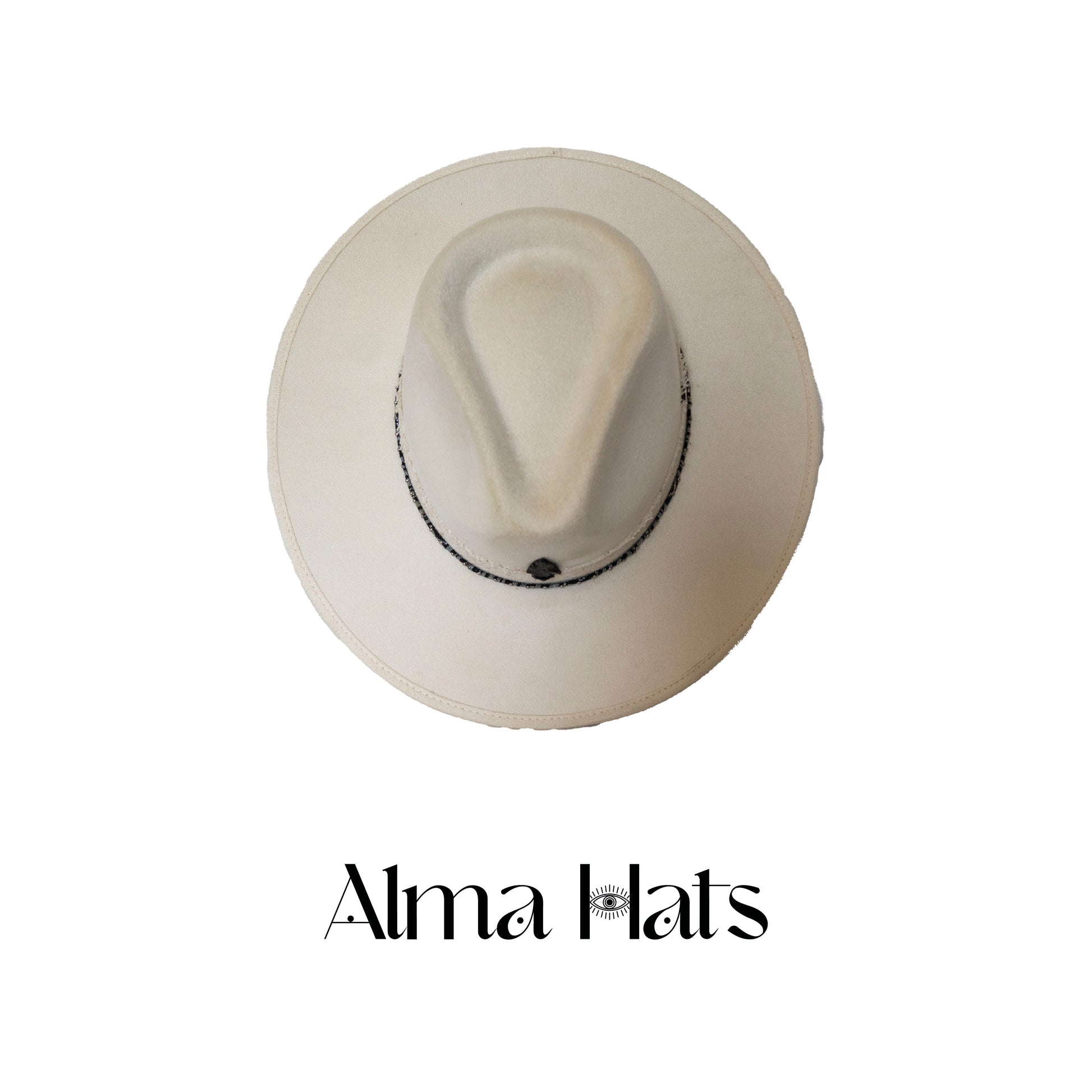 The pristine white felt provides a serene and neutral backdrop, allowing the stone to take center stage while reflecting light and balance. Complementing the simplicity of the design, a stunning fabric strip wraps around the base, adding a touch of texture and refinement to the hat. Its clean lines and understated design ensure the piece remains sophisticated and versatile for any occasion.