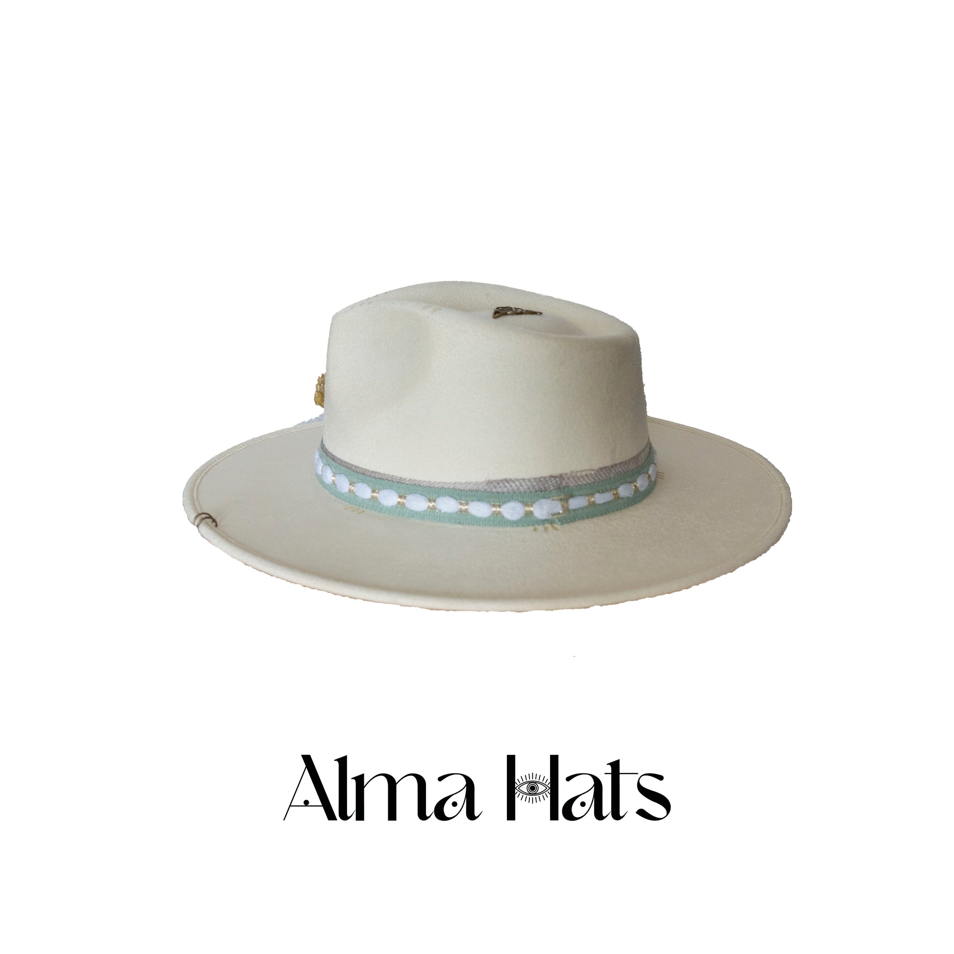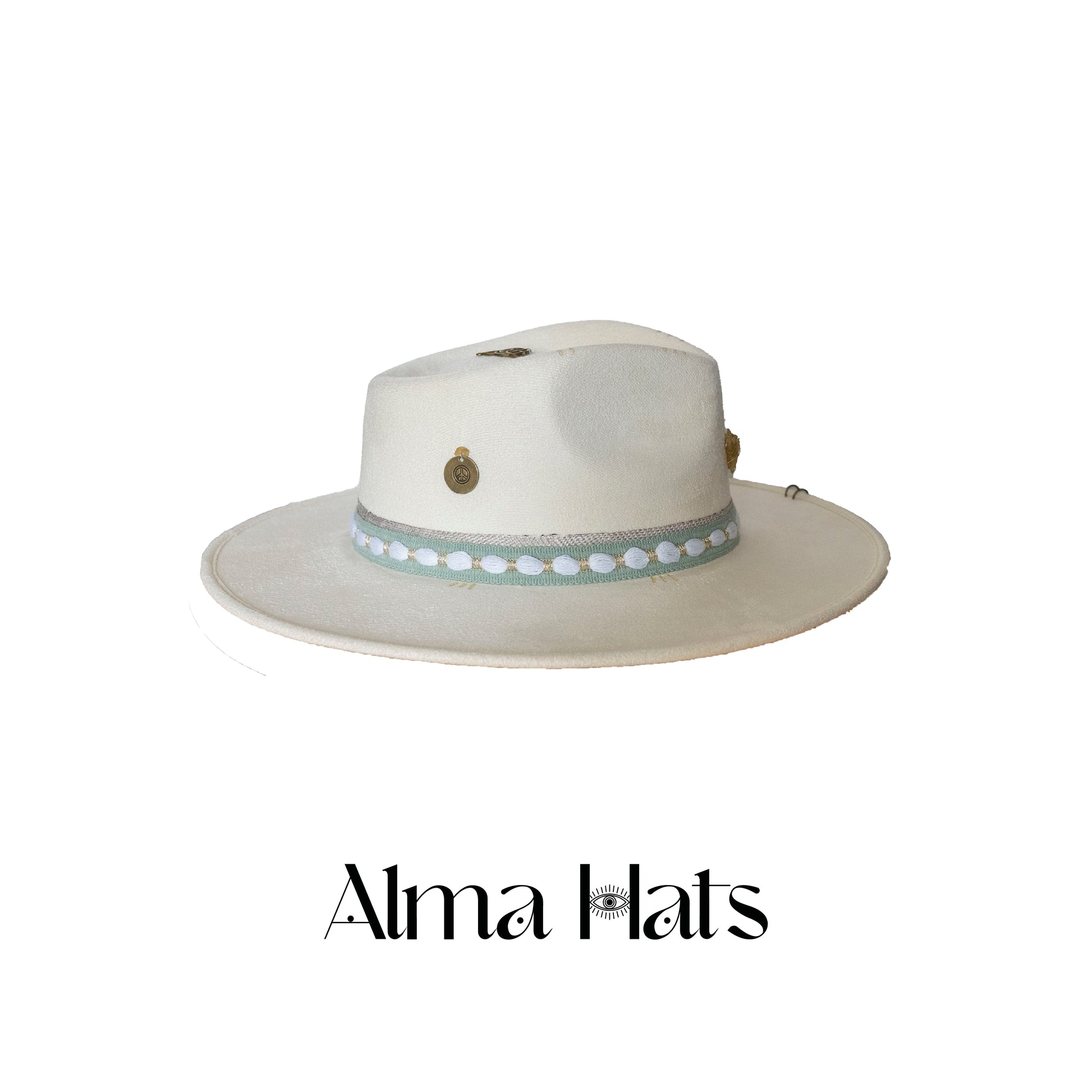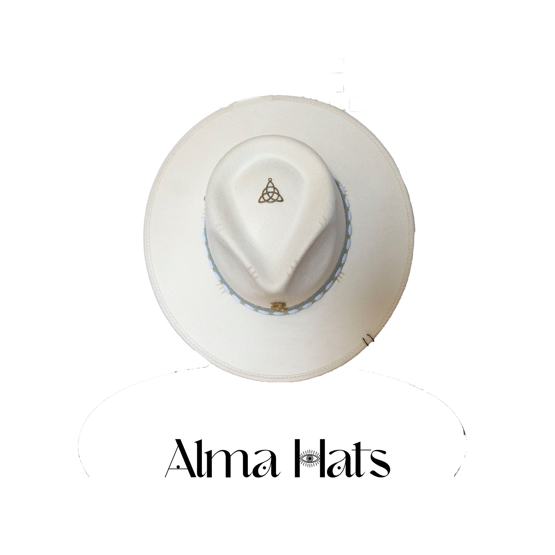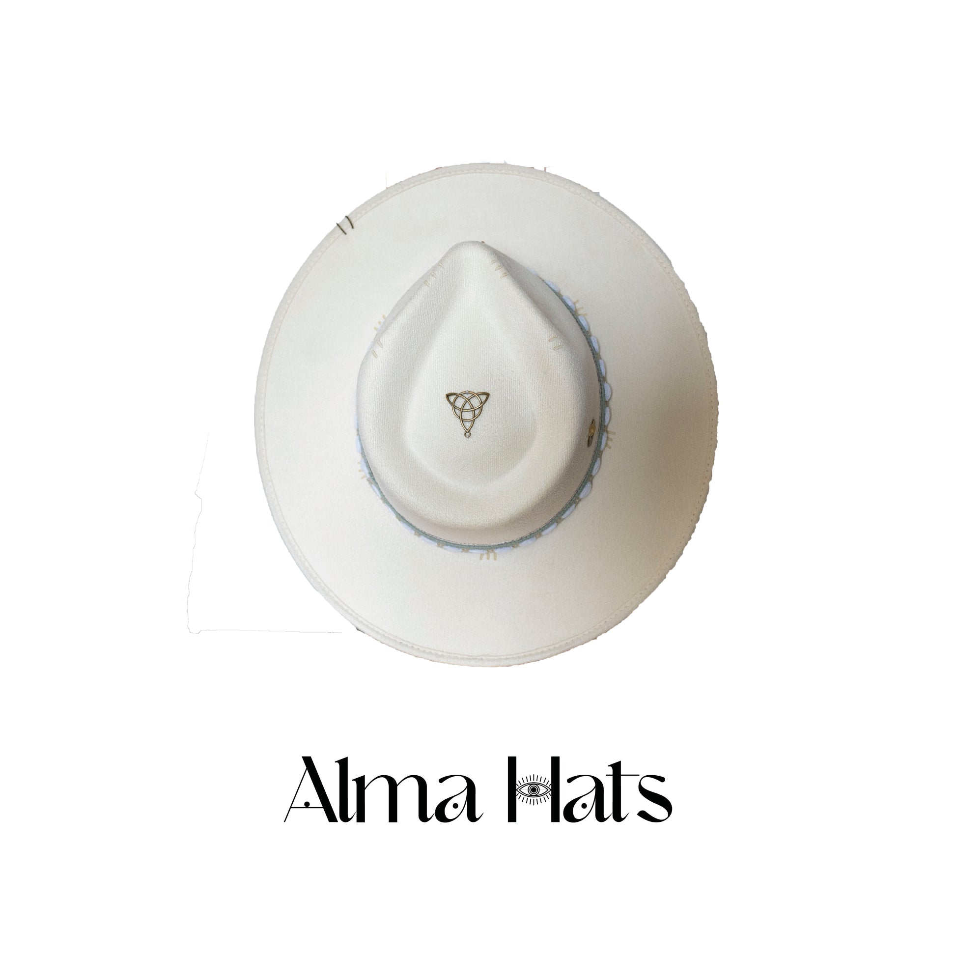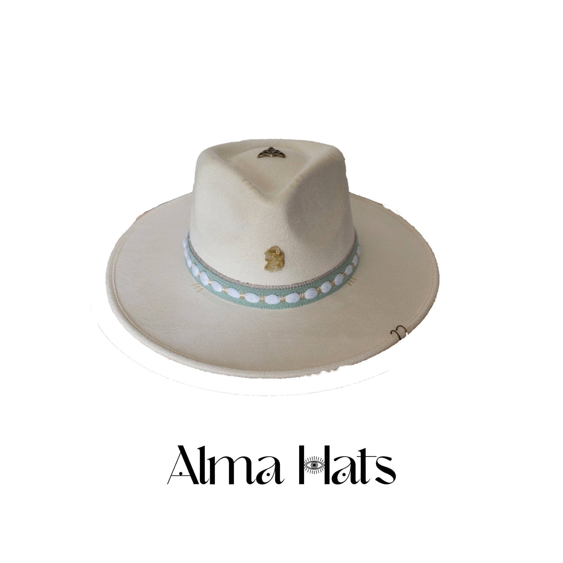 Crafted with intention and heart, this handmade white fedora is a bespoke creation designed exclusively for Justine— a true one-of-a-kind piece that radiates light, energy, and personal meaning. At its center lies a yellow calcite stone, known for its uplifting and empowering qualities, encouraging joy, confidence, and clarity.
