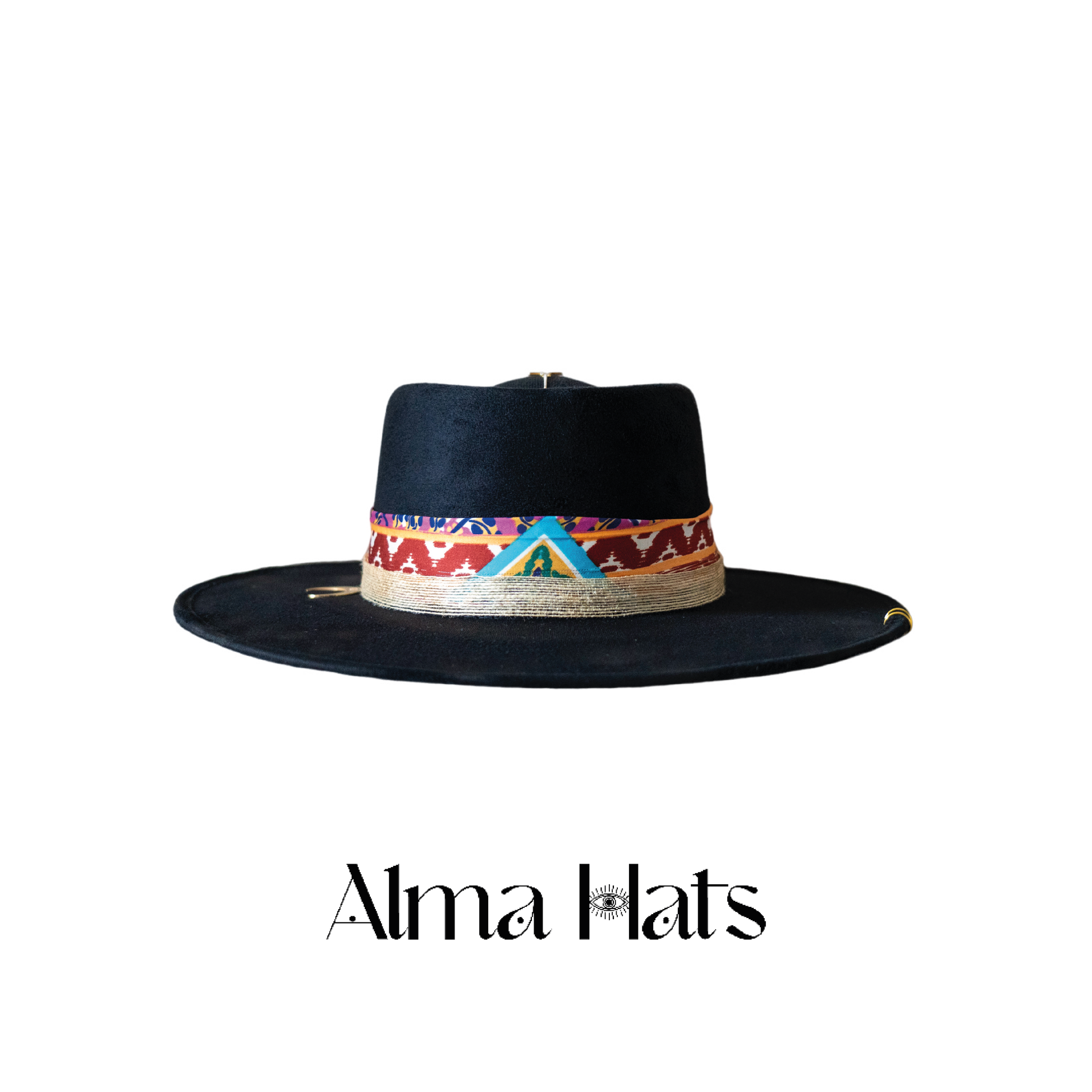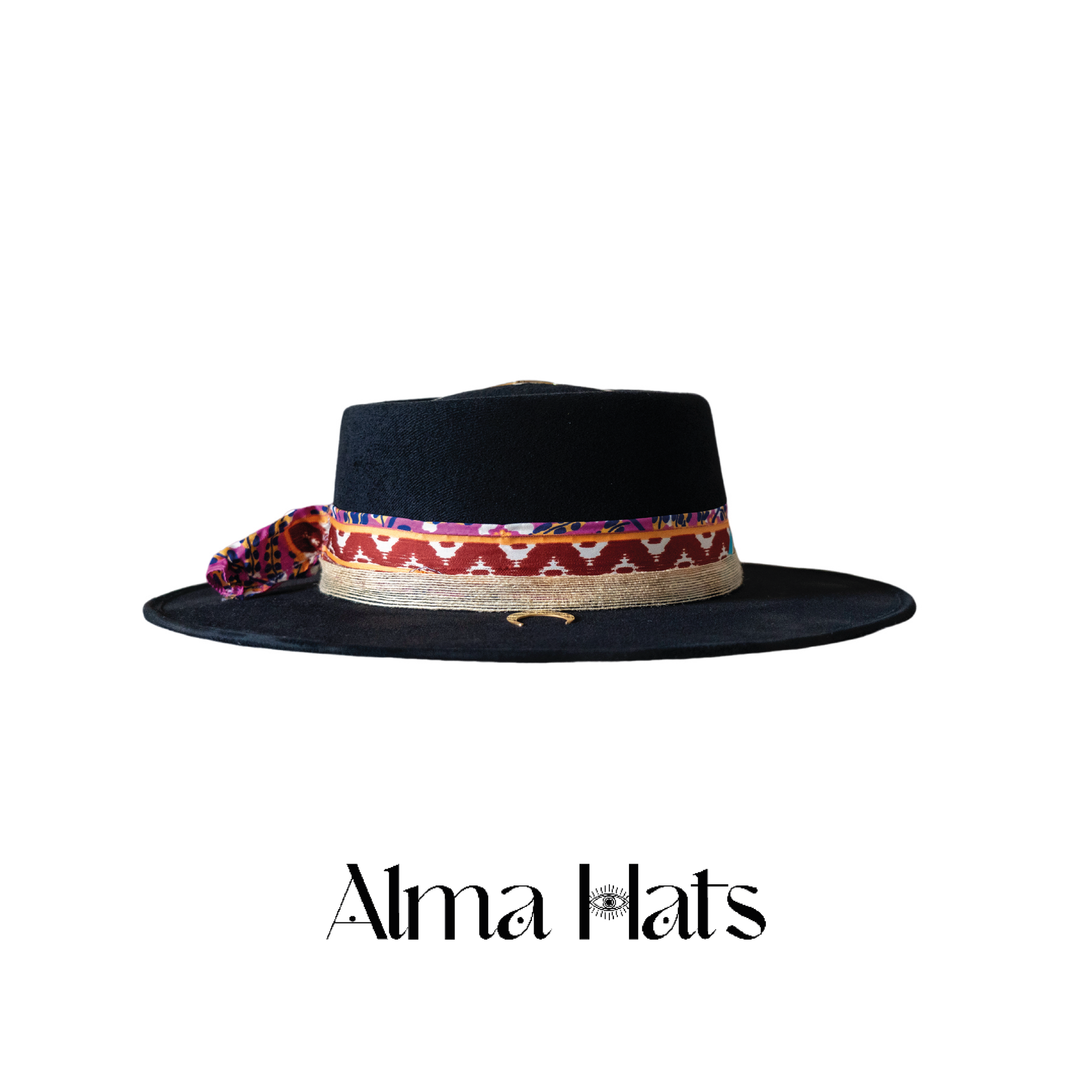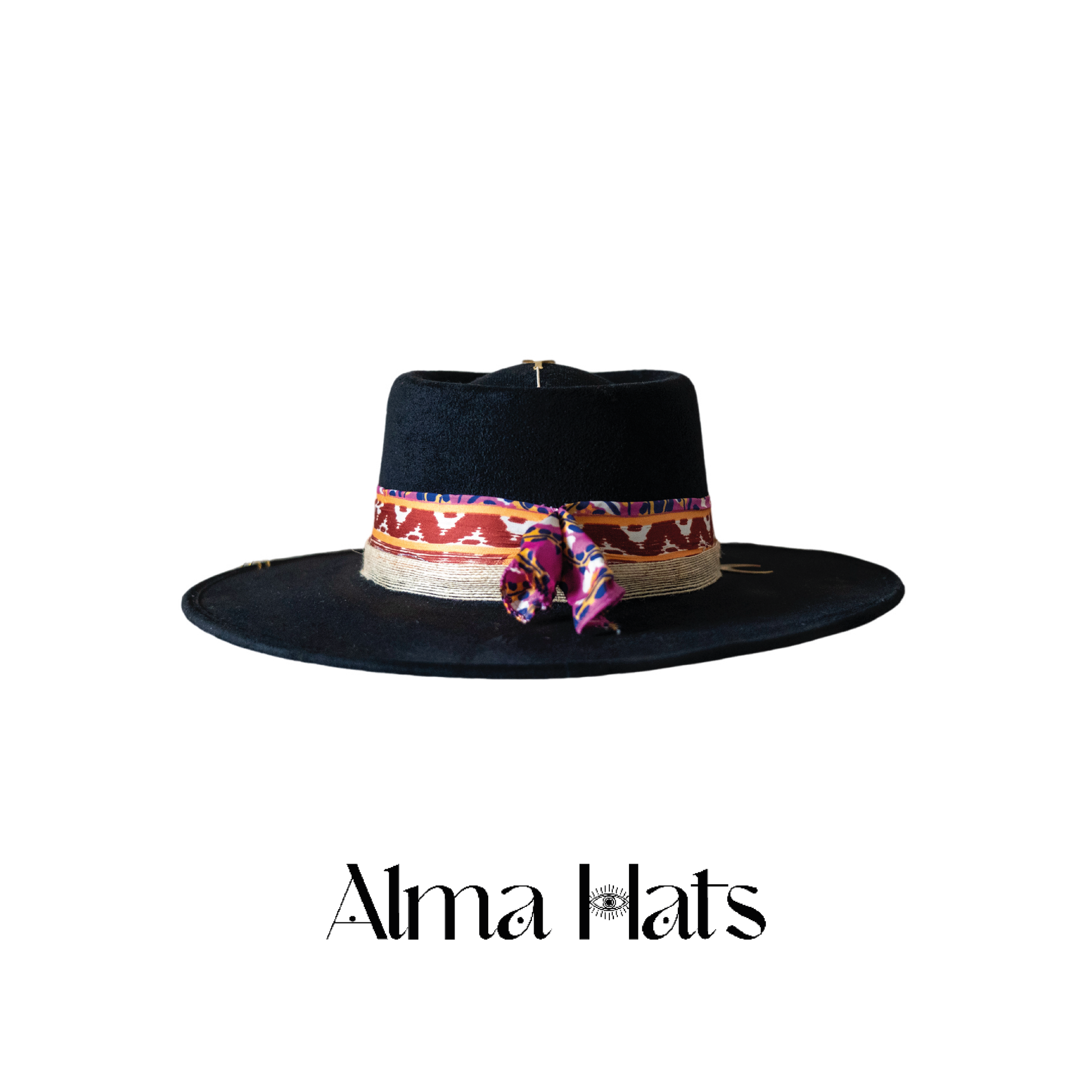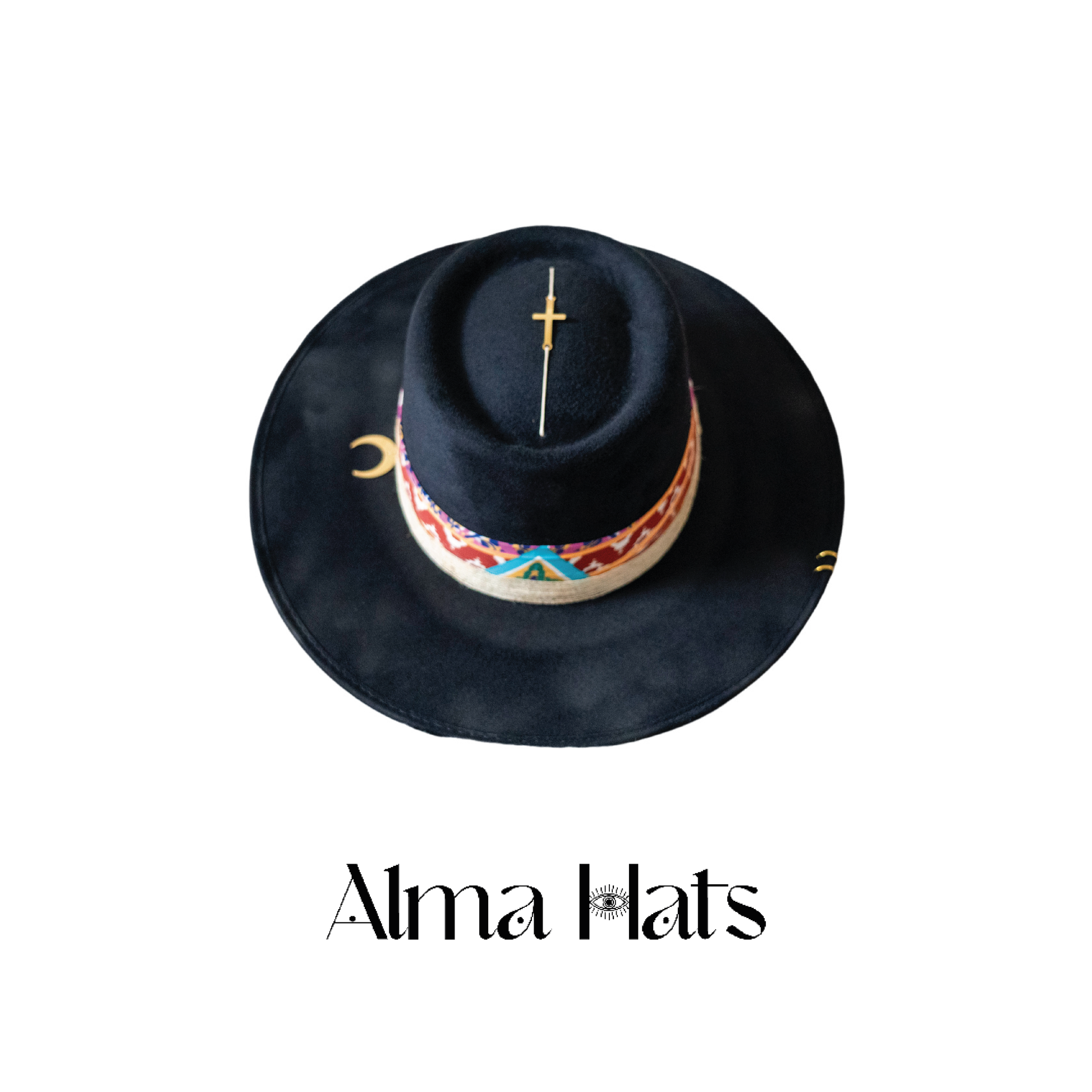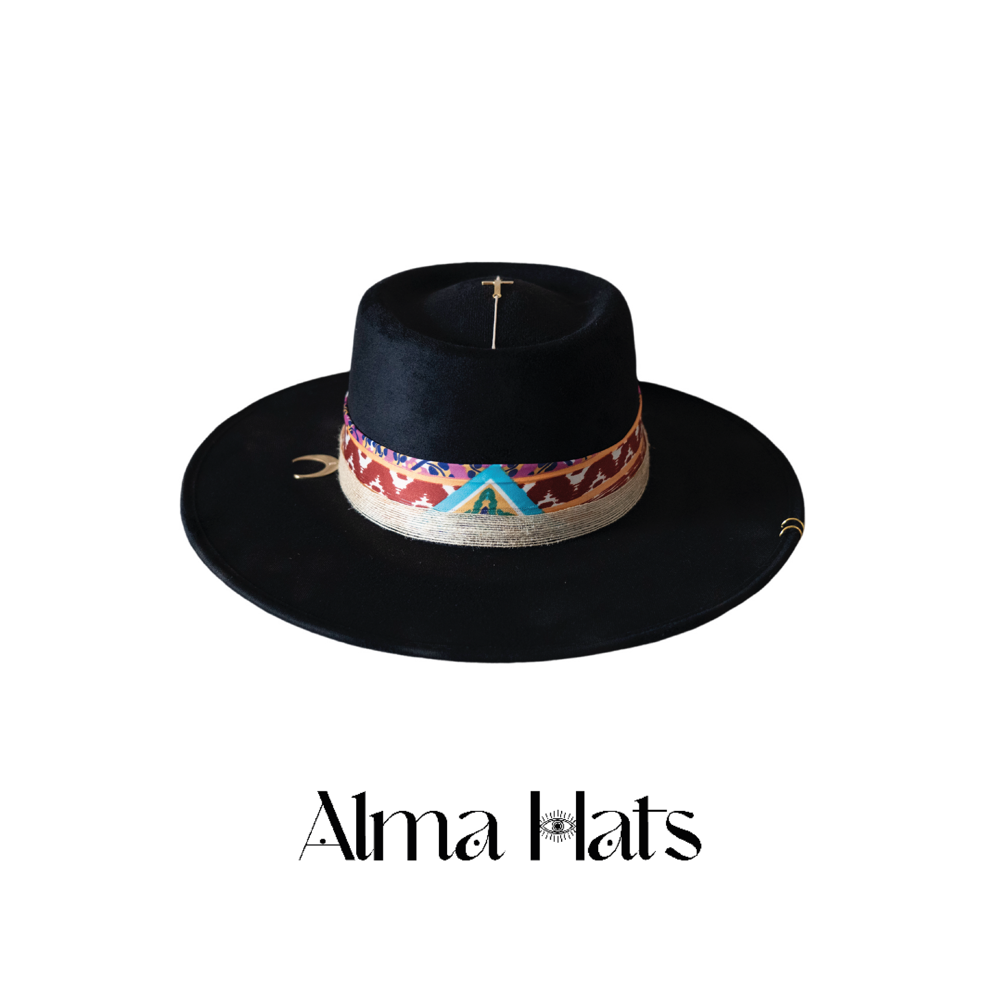Introducing FEYU, this one-of-a-kind black custom hat is a striking fusion of luxury and rustic charm, designed to stand out as a true statement piece. The hat is crafted from high-quality black fabric that serves as a bold backdrop for its ornate embellishments. Adorning the crown are gleaming gold rings, artfully arranged to create a captivating contrast against the dark base. Scattered across the hat are gold medals, each one a unique design, lending an air of prestige and history to the piece.