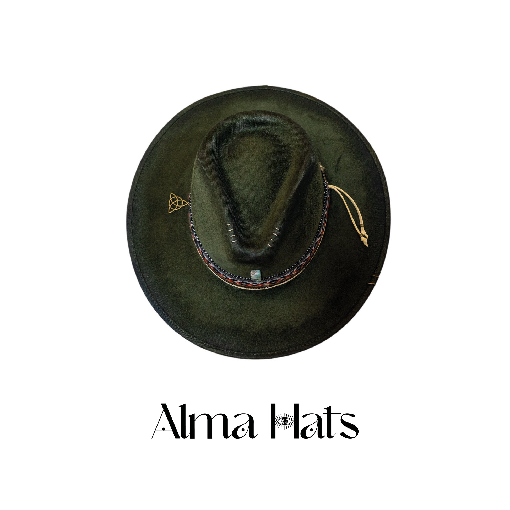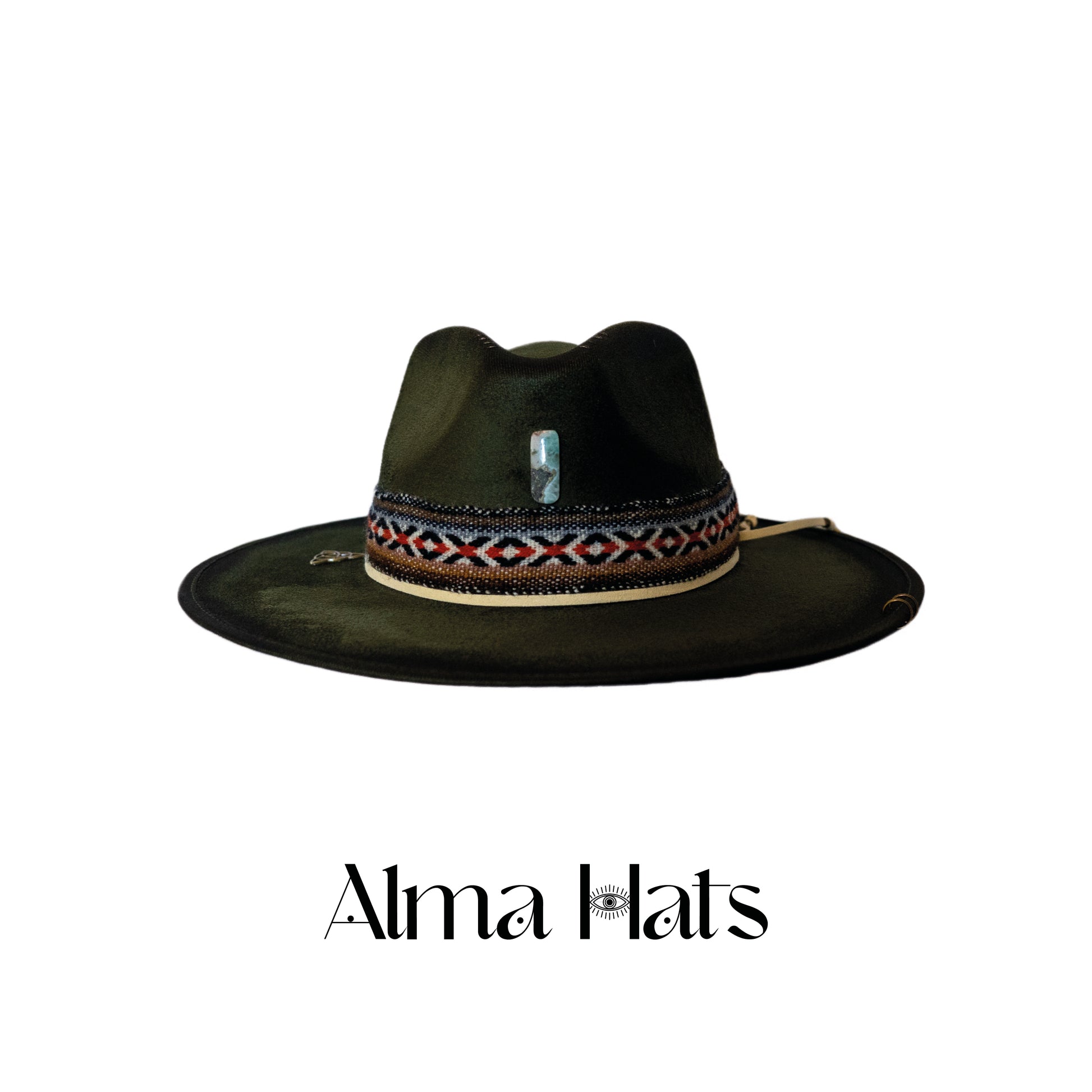 The handmade band wrapped around the hat reflects traditional craftsmanship, carrying with it a sense of history and a link to the spiritual. At the heart of the design lies a beautiful turquoise stone, known for its healing properties and symbolic ties to tranquility and protection. To the side, a pyramid accent adds an element of ancient wisdom, transforming the hat into a true unique model.