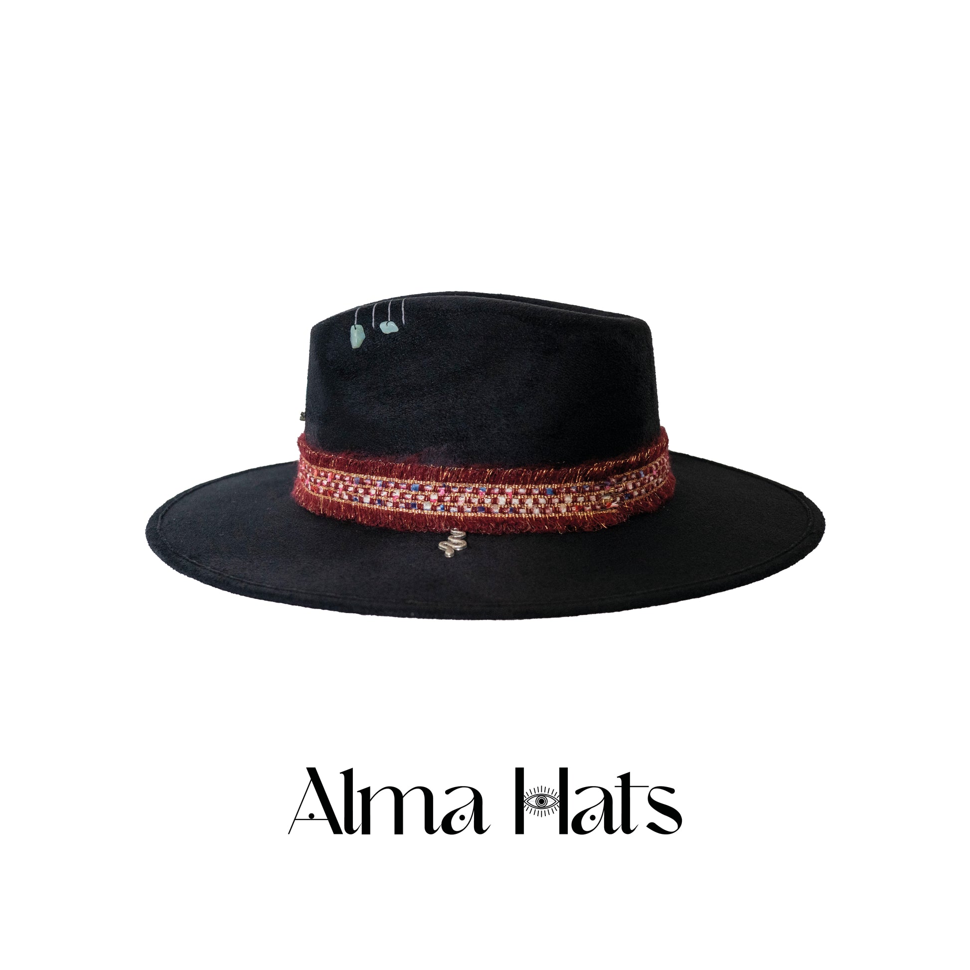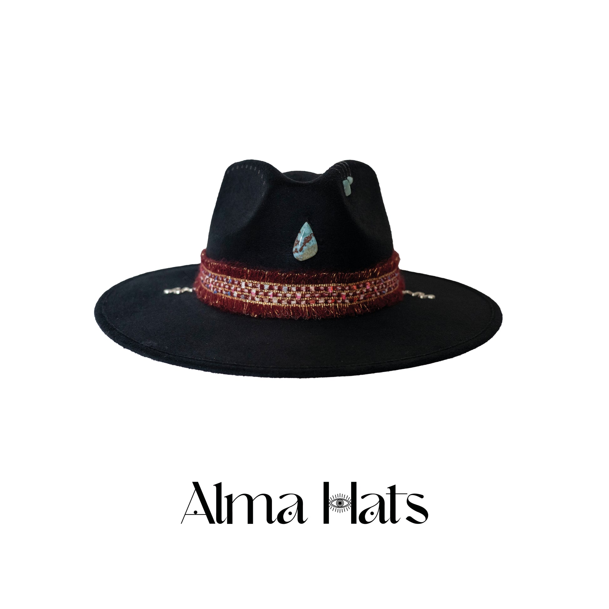 Mysterious, powerful, and deeply symbolic — this handmade black fedora is a one-of-a-kind creation, crafted for those who move through life with intention and inner fire. At the center sits a genuine Larimar stone, a rare gem of serene blue, known to activate the throat chakra and awaken divine feminine energy.