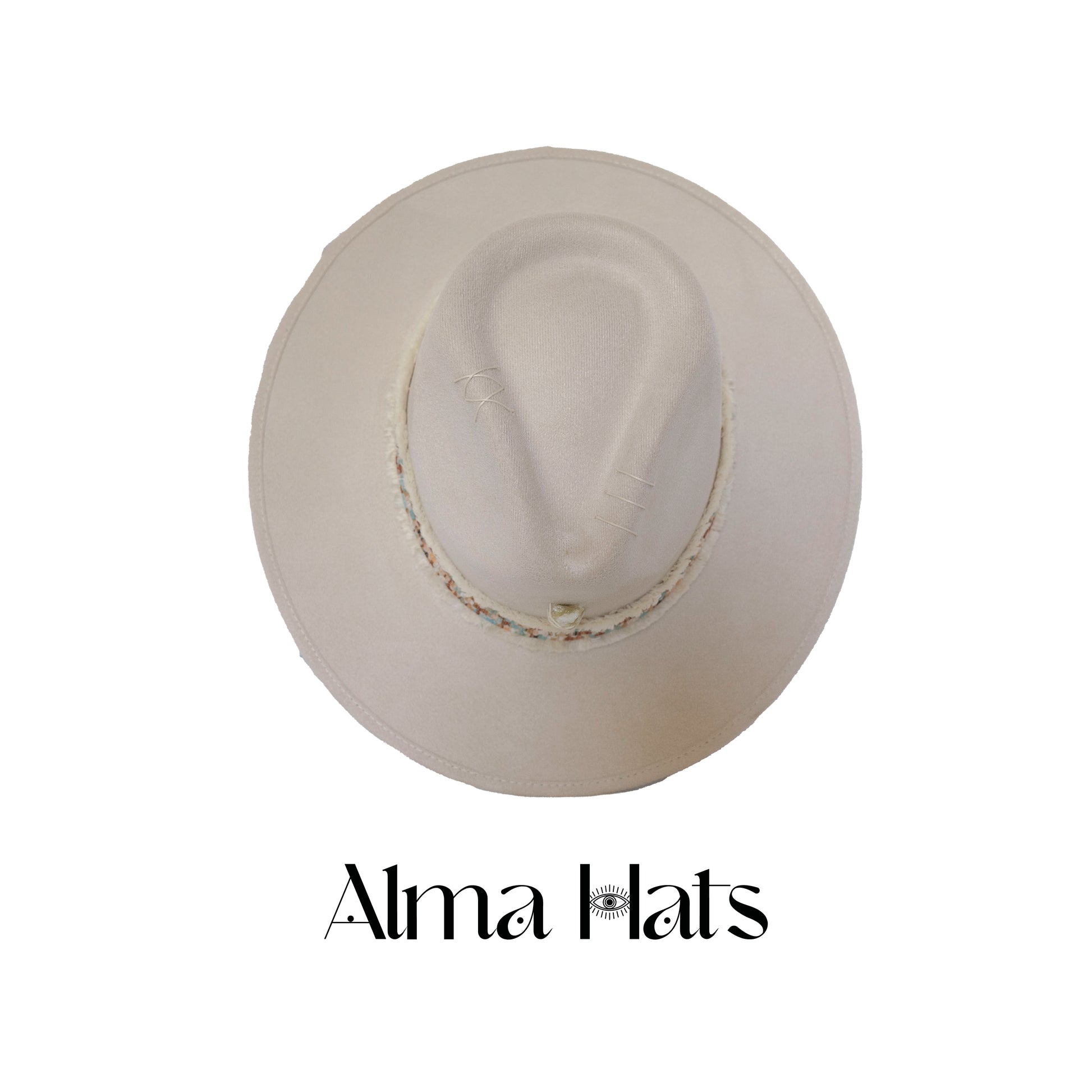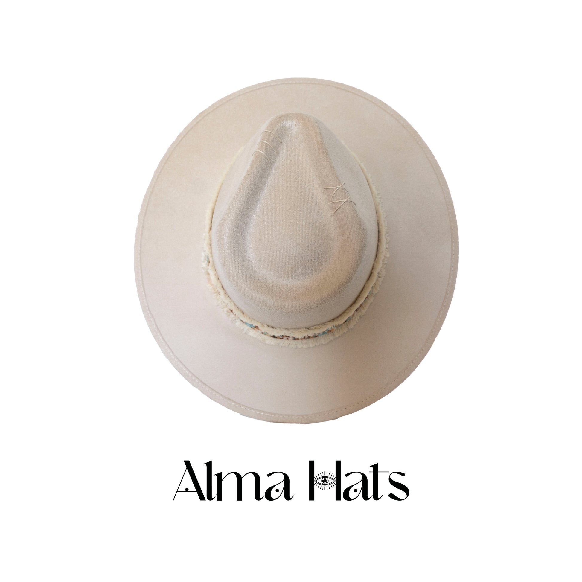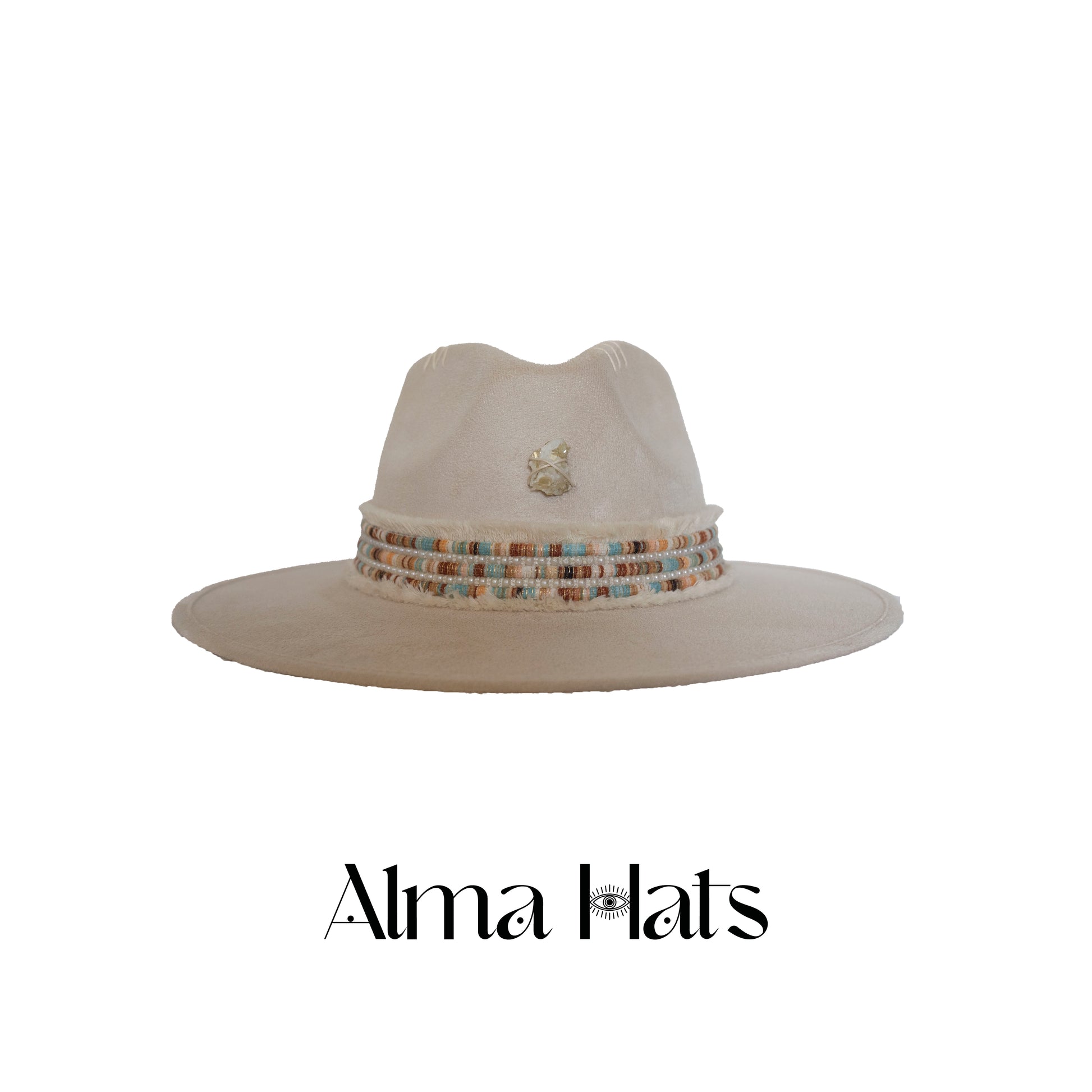 Elegant, luminous, and crafted with soul, the “Moonlight Muse” fedora is a custom-made treasure created exclusively for Kurru Kurru at Cotton Beach Club in Cala Tarida. Its crisp white hue evokes purity, light, and the serene beauty of Ibiza’s moonlit shores.