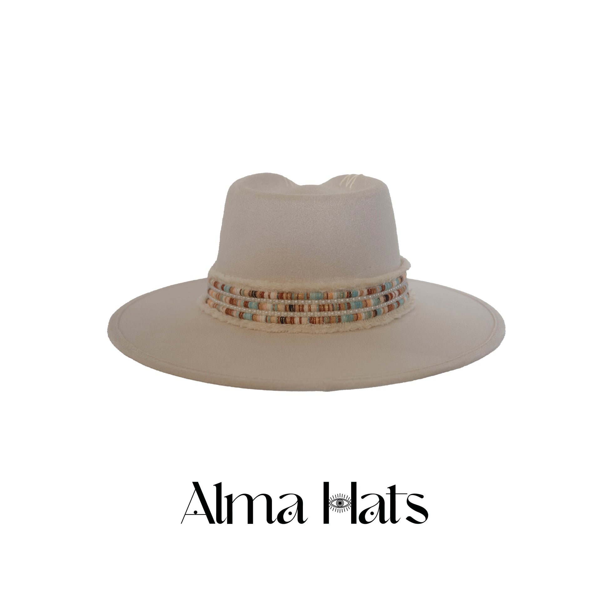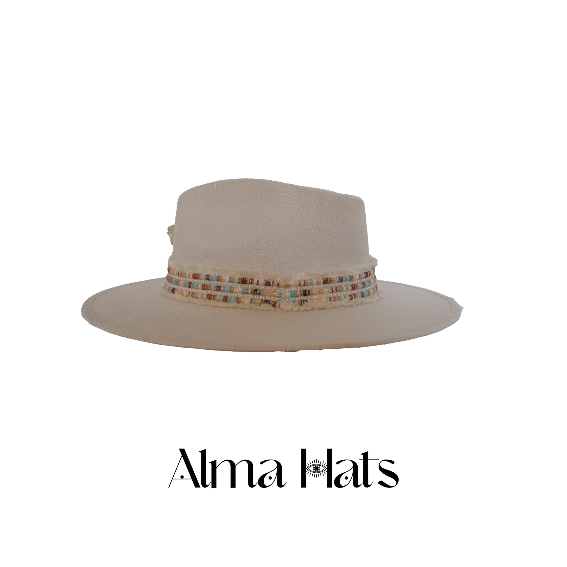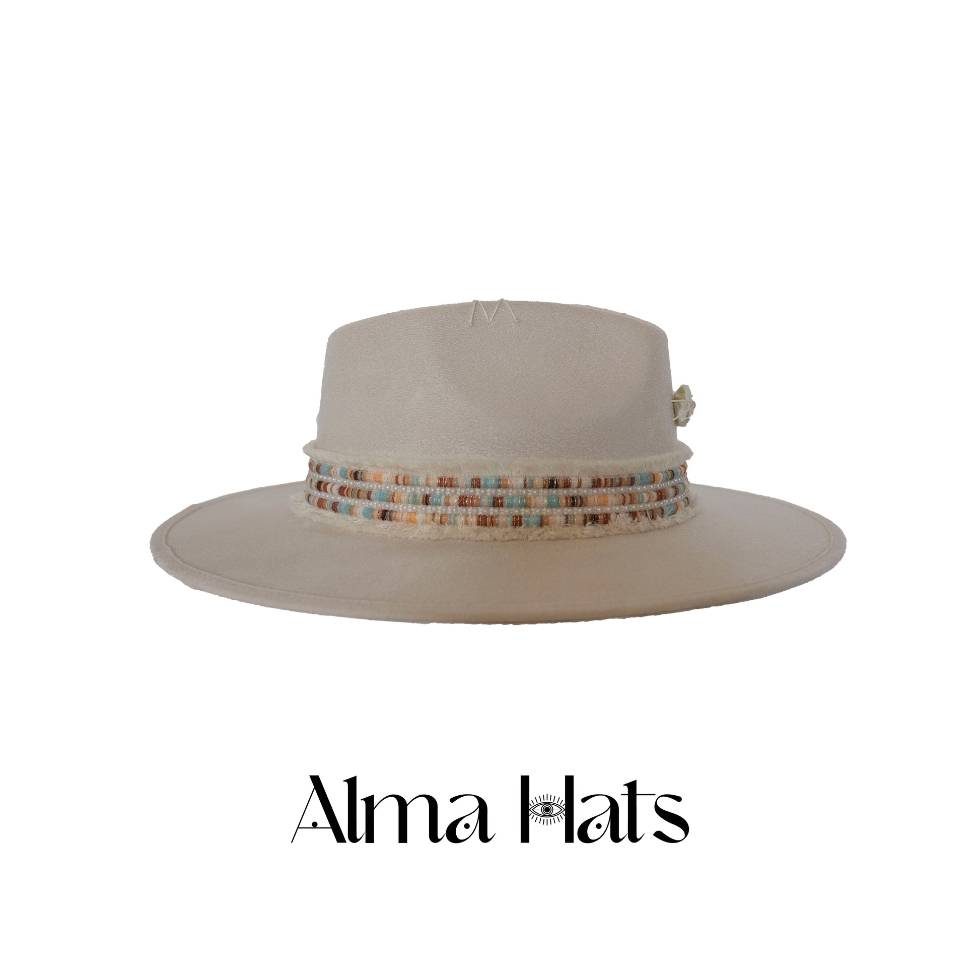 Elegant, luminous, and crafted with soul, the “Moonlight Muse” fedora is a custom-made treasure created exclusively for Kurru Kurru at Cotton Beach Club in Cala Tarida. Its crisp white hue evokes purity, light, and the serene beauty of Ibiza’s moonlit shores.