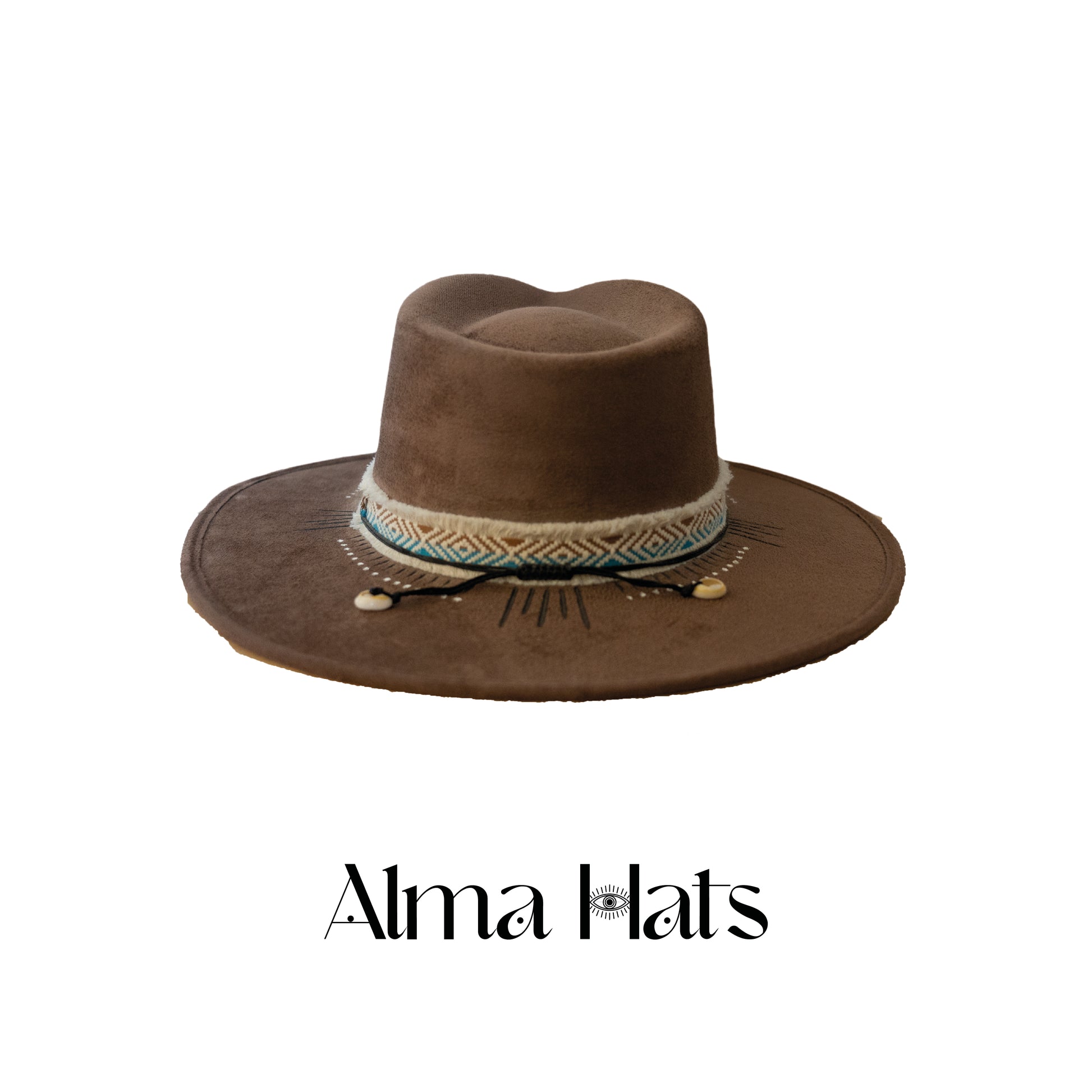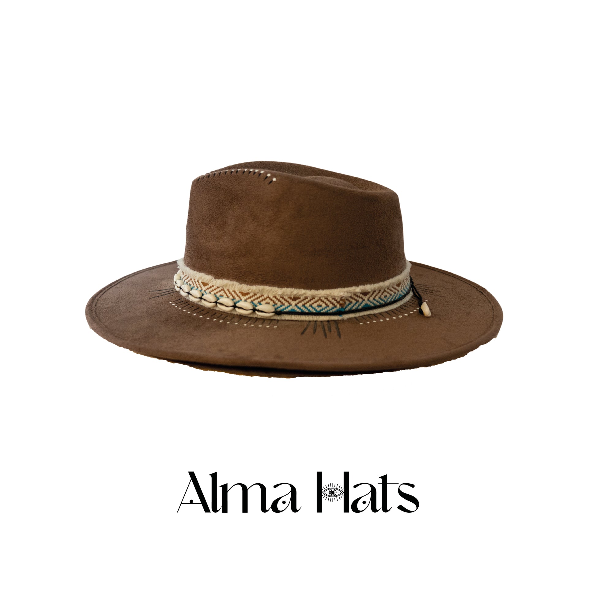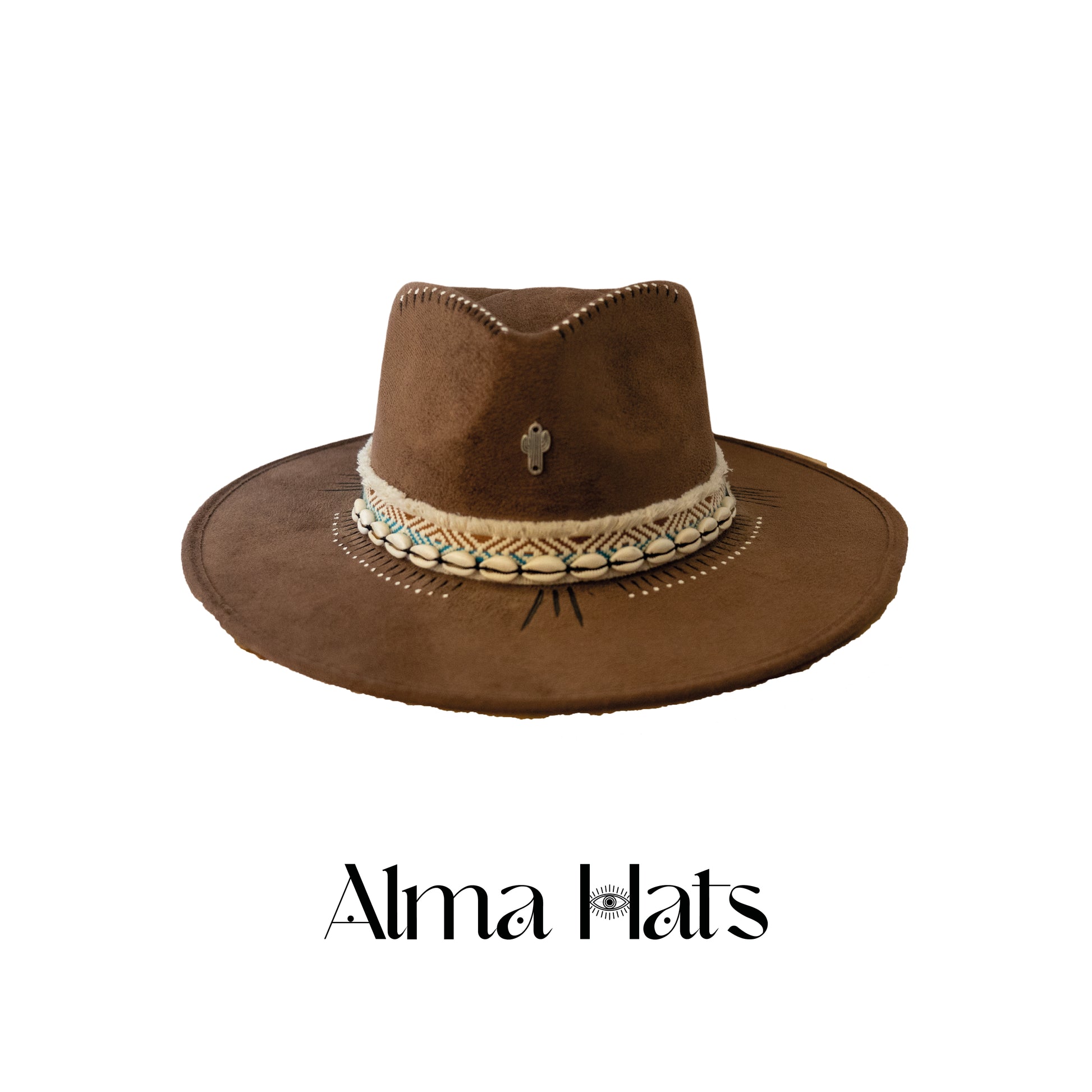 Introducing Deserta, , this one-of-a-kind brown custom hat, crafted in a distinctive drop shape, is inspired by the raw beauty of the desert. At its center, a delicate cactus pendant symbolizes resilience and the enduring spirit of nature. Sea shells encircle the hat, bringing a harmonious contrast of desert and sea, while intricate dots art adds a touch of artisanal elegance.