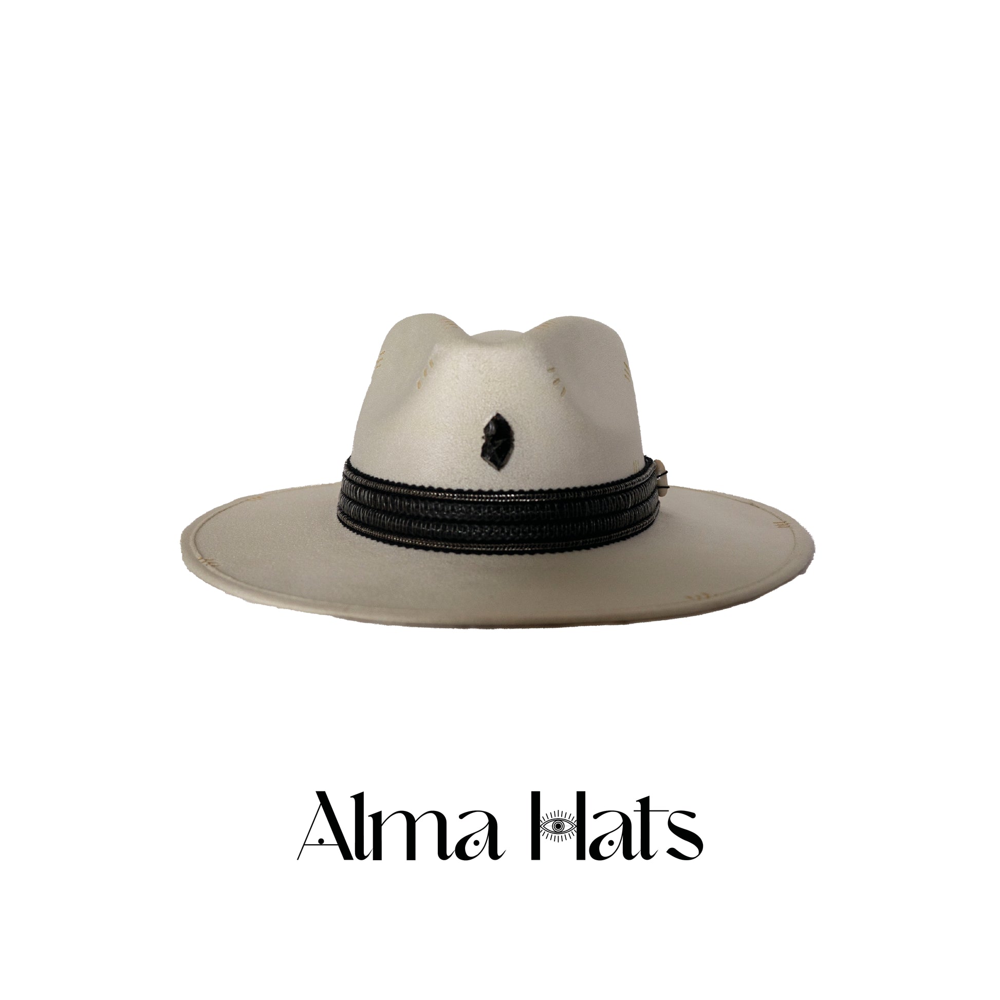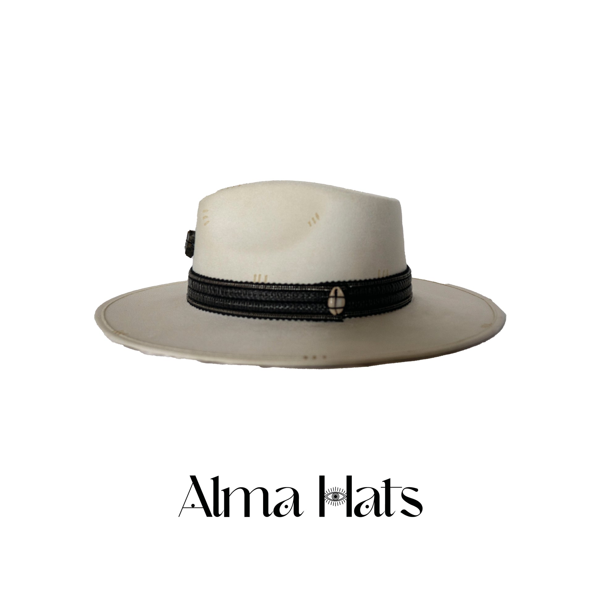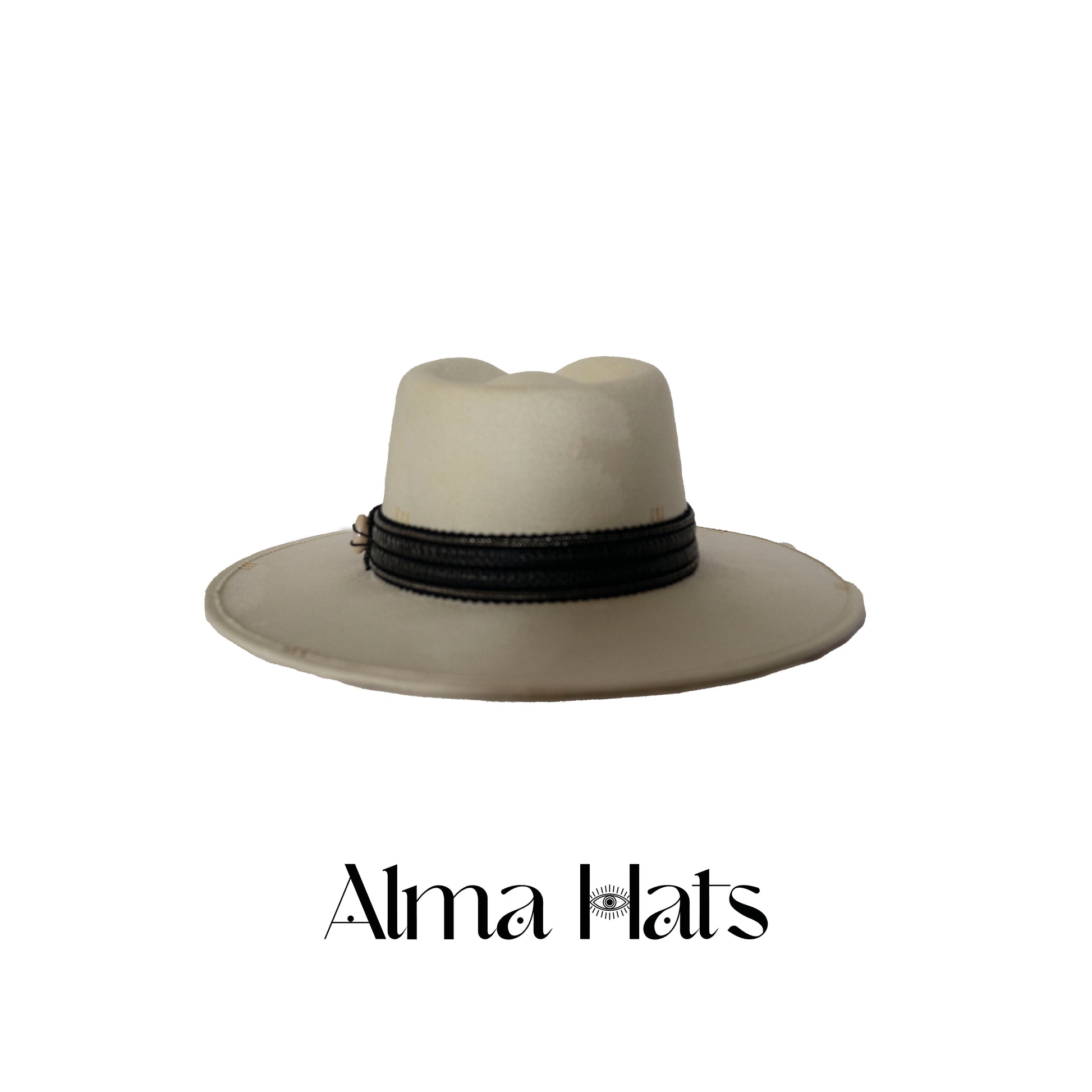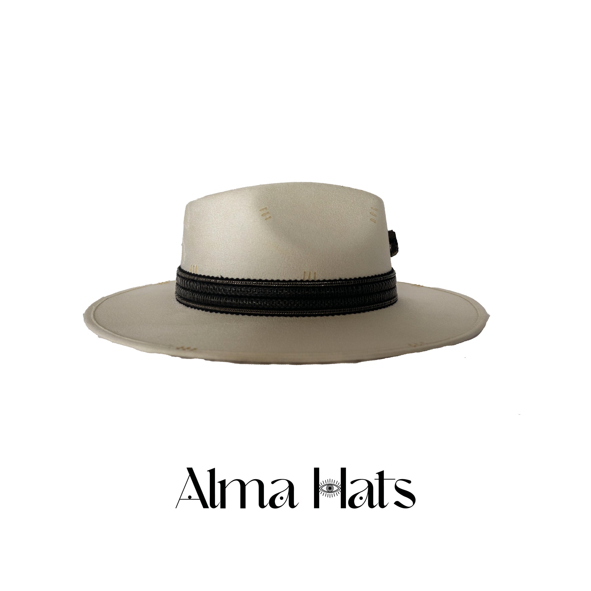 This custom-made white fedora is a singular piece of elegance, inspired by the refined spirit of Alma Hats. Crafted with precision and grace, it features a sleek black band that adds contrast and timeless sophistication, while soft feminine touches elevate its presence with quiet strength.