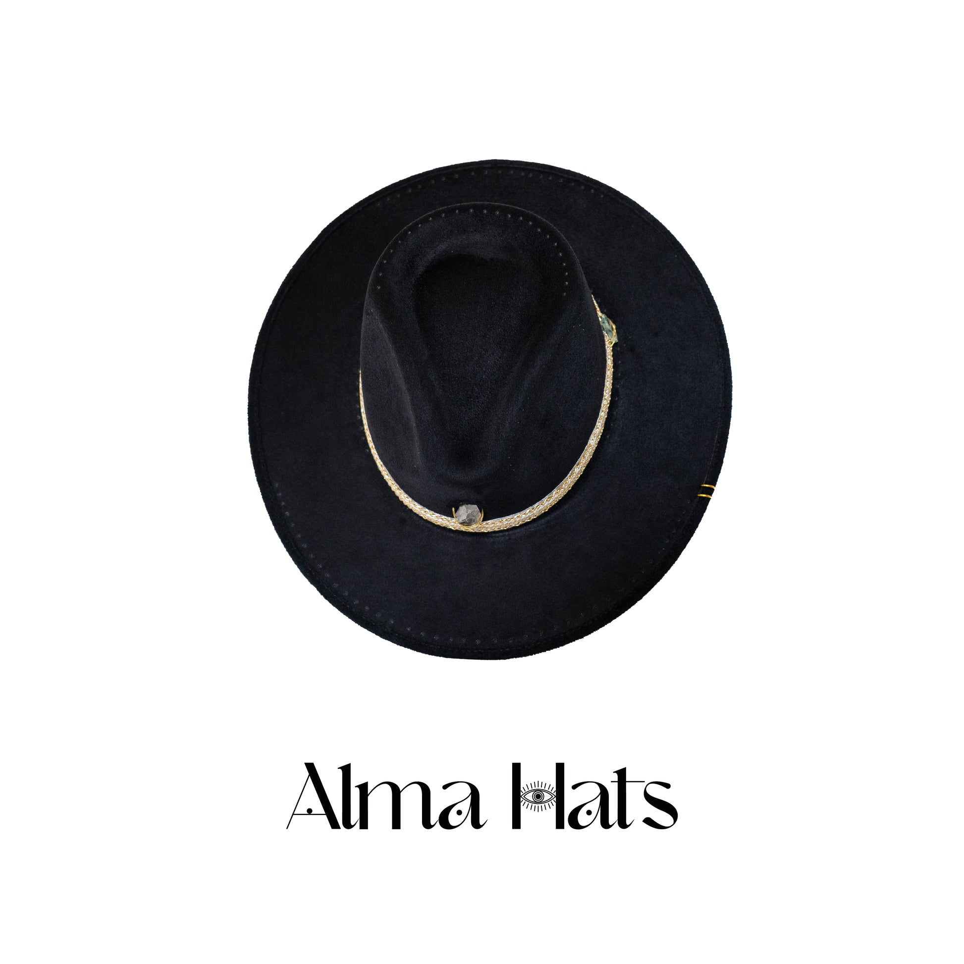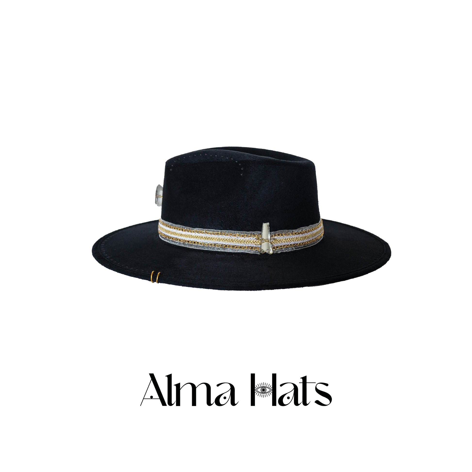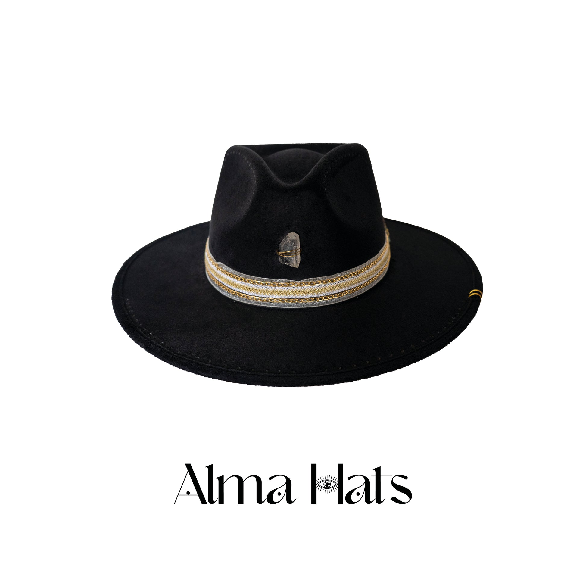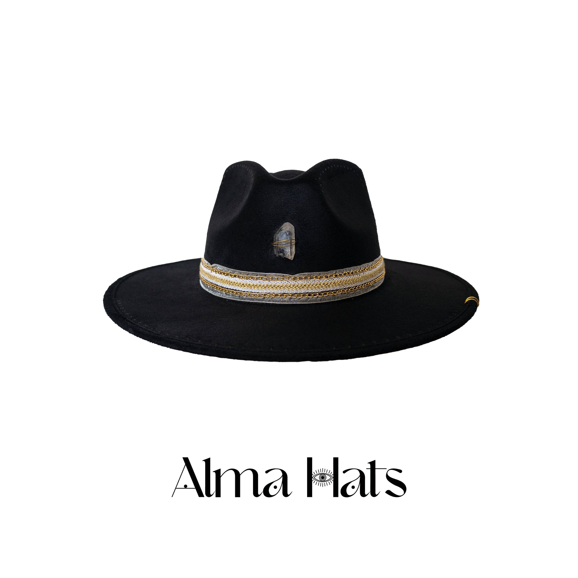 Bold, mysterious, and energetically charged — this handmade black fedora is a true one-of-a-kind creation, designed for those who walk with presence and purpose. At the crown, a clear quartz stone anchors the piece, radiating clarity, amplification, and alignment.