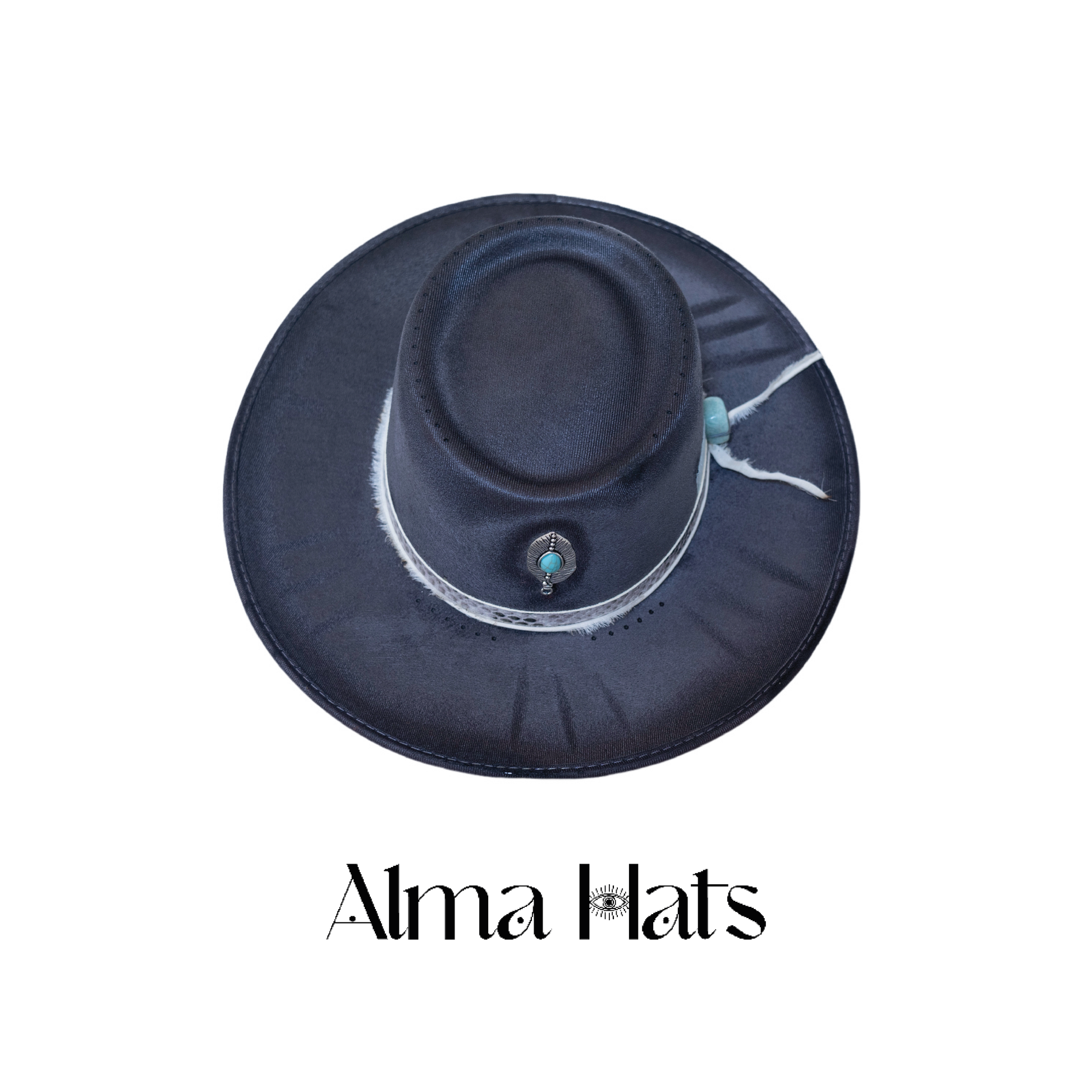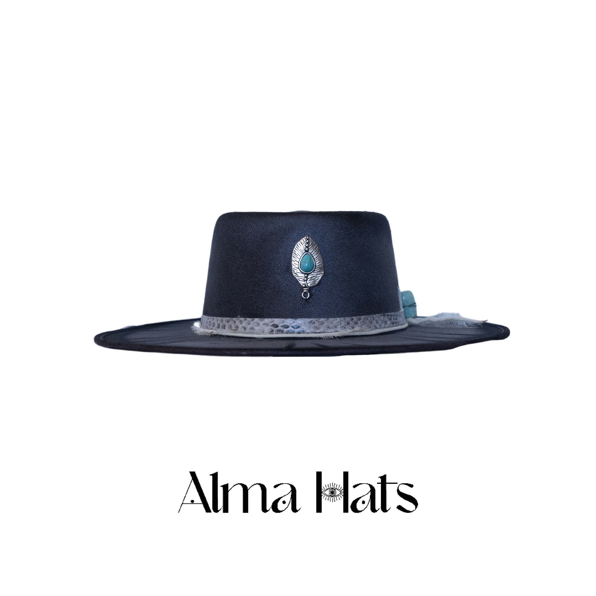 To further enhance its unique character, the hat is finished with carefully applied burn effects. These effects give the GEMA a rugged, vintage look, adding depth and a sense of history to the piece. The combination of the turquoise gem stone medal, the side gemstone, the snake leather band, and the burn effects makes the GEMA hat a standout piece, perfect for those who appreciate a blend of elegance, uniqueness, and a touch of the extraordinary in their style.