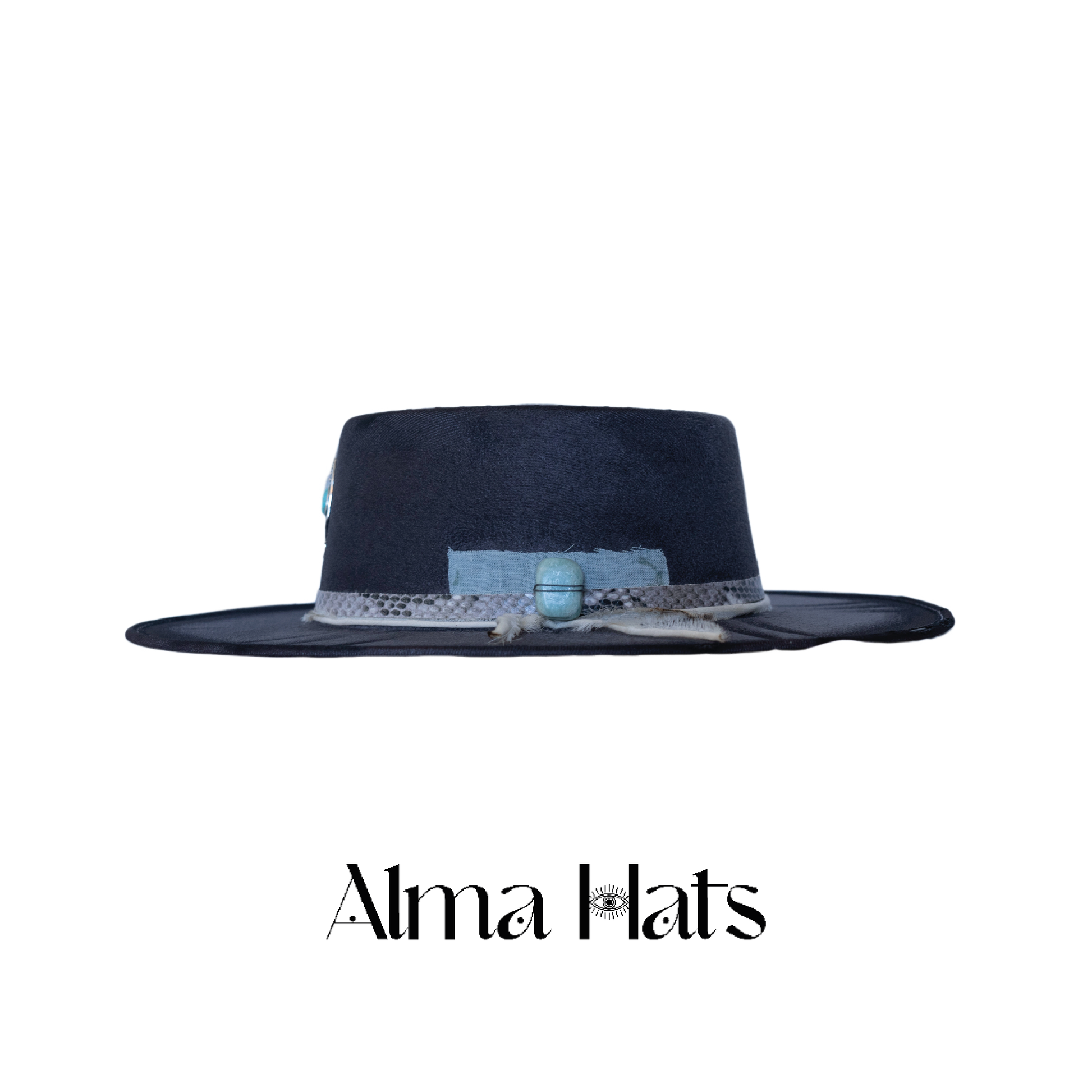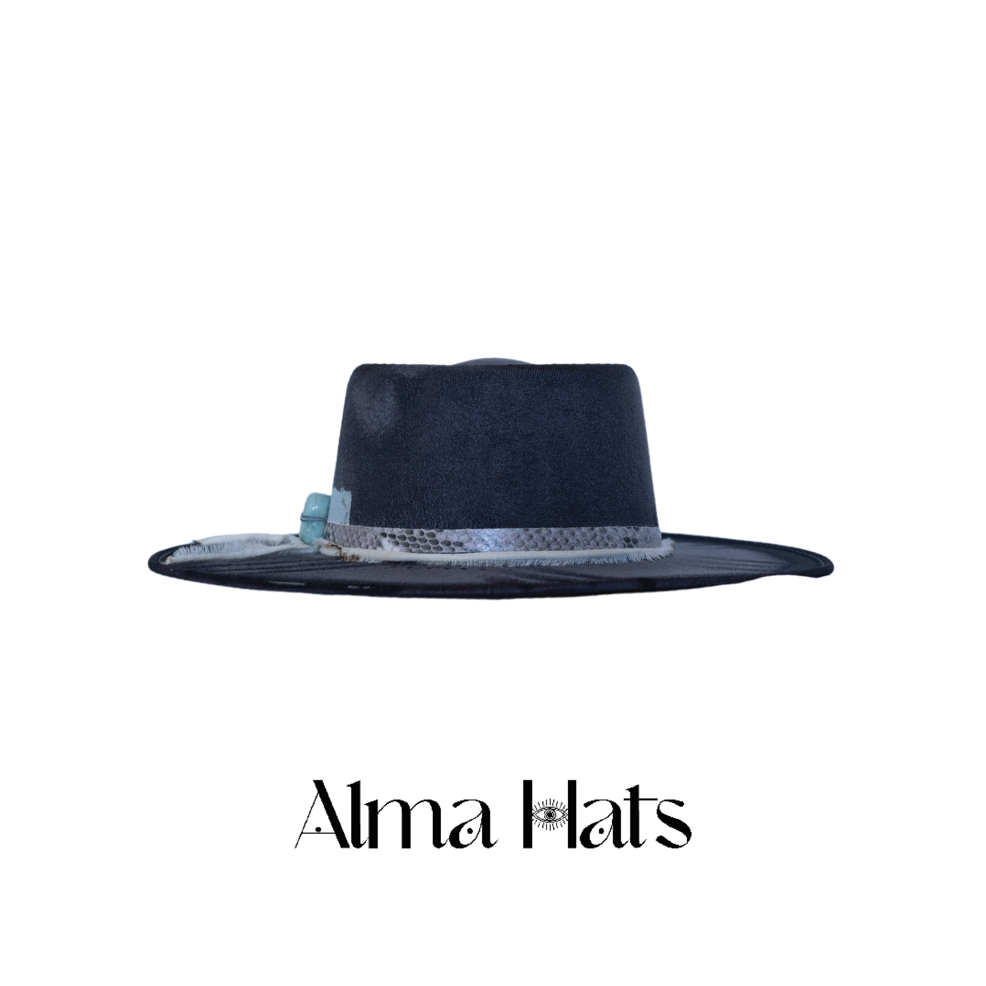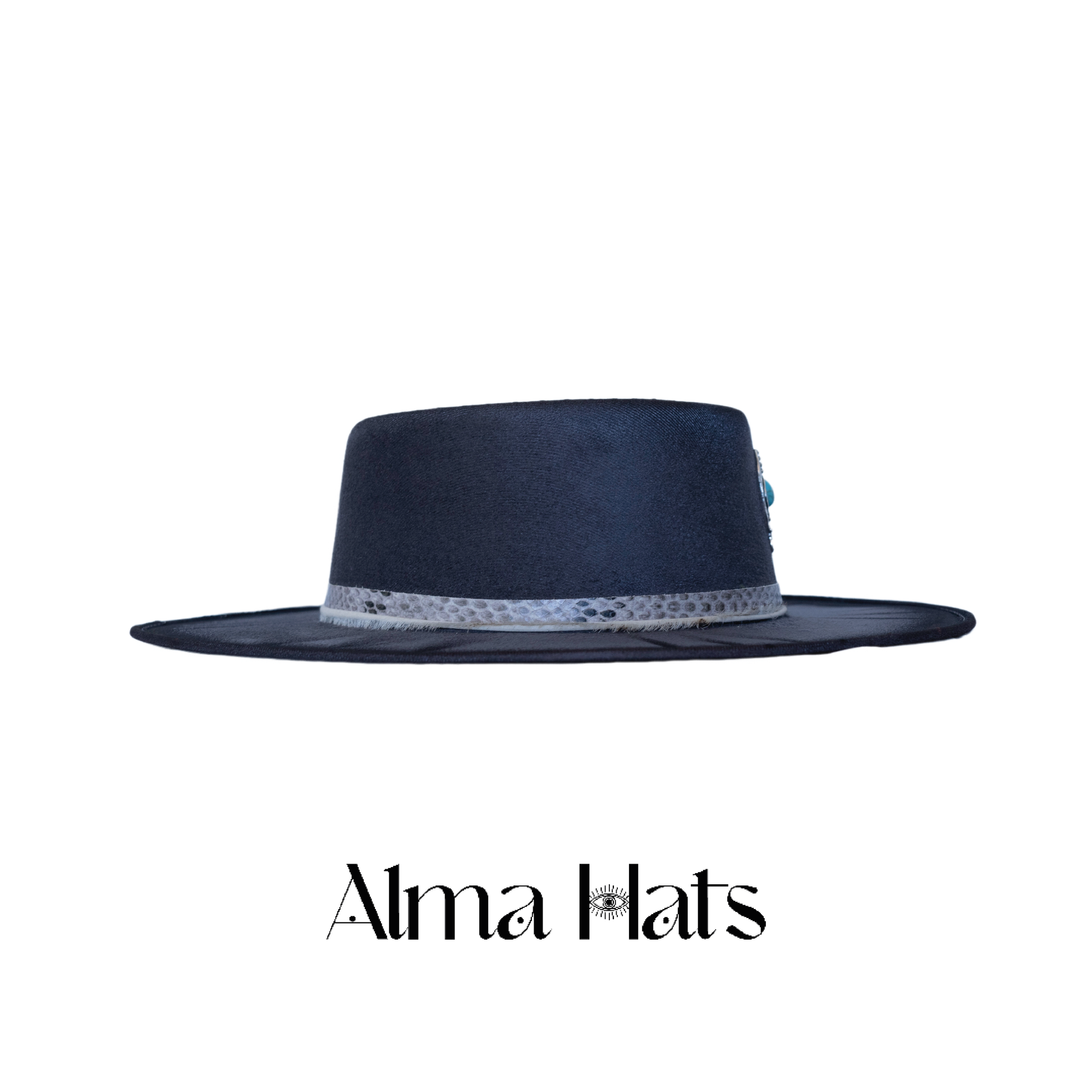 Encircling the hat is a handmade snake leather strip band, a unique element that adds texture and an exotic flair to the design. The snake leather, with its distinct pattern and luxurious feel, provides a bold contrast to the smooth fabric of the hat, making the GEMA not just an accessory, but a statement of style.