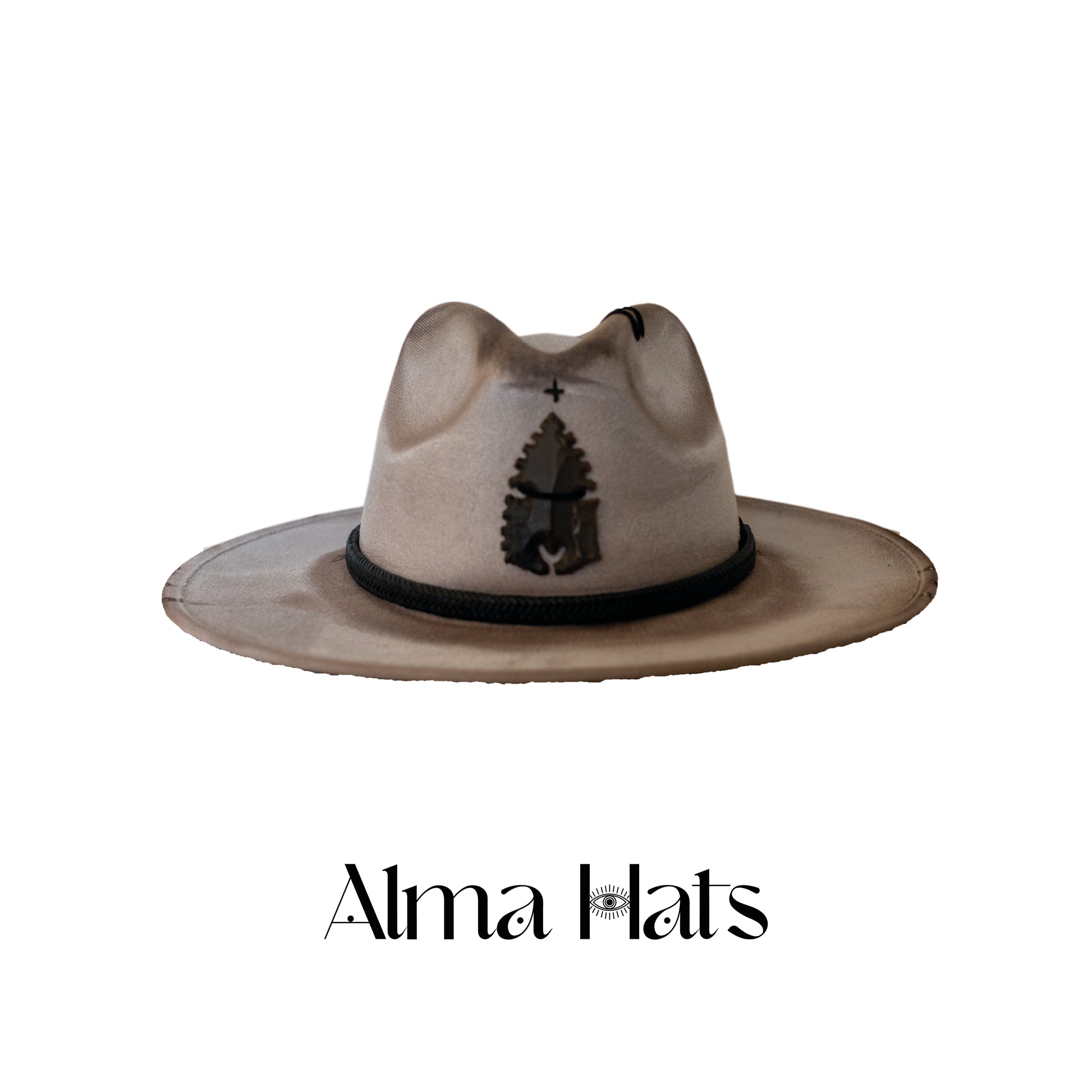 Introducing Fossil, this one-of-a-kind grey custom hat, designed in an Indiana-inspired shape, is a striking blend of heritage and artistry. At its center lies a fossil arrow stone, symbolizing strength and ancient wisdom, while black leather cords encircle the hat, adding a rugged and timeless touch.