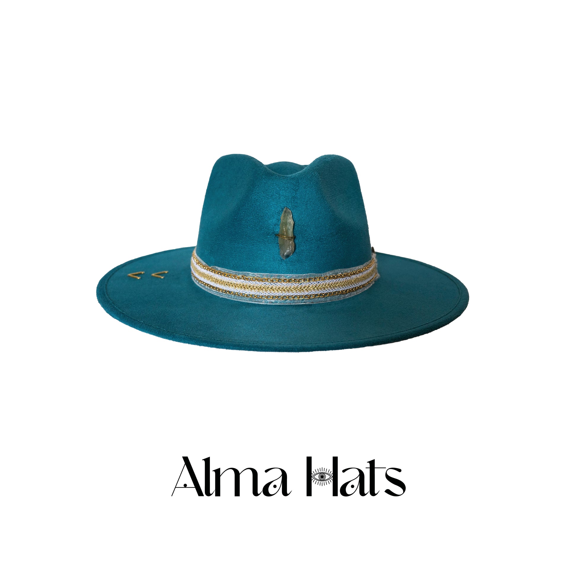 Radiant and deeply protective, this handmade turquoise fedora is a one-of-a-kind creation, designed to balance beauty with powerful healing energies. At the center, a quartz stone serves as a beacon of purification and protection, known for its ability to cleanse negative energies and amplify positive vibrations. This crystal’s clarity and strength offer a deep sense of calm and energetic restoration, making it an ideal centerpiece for this remarkable design.
