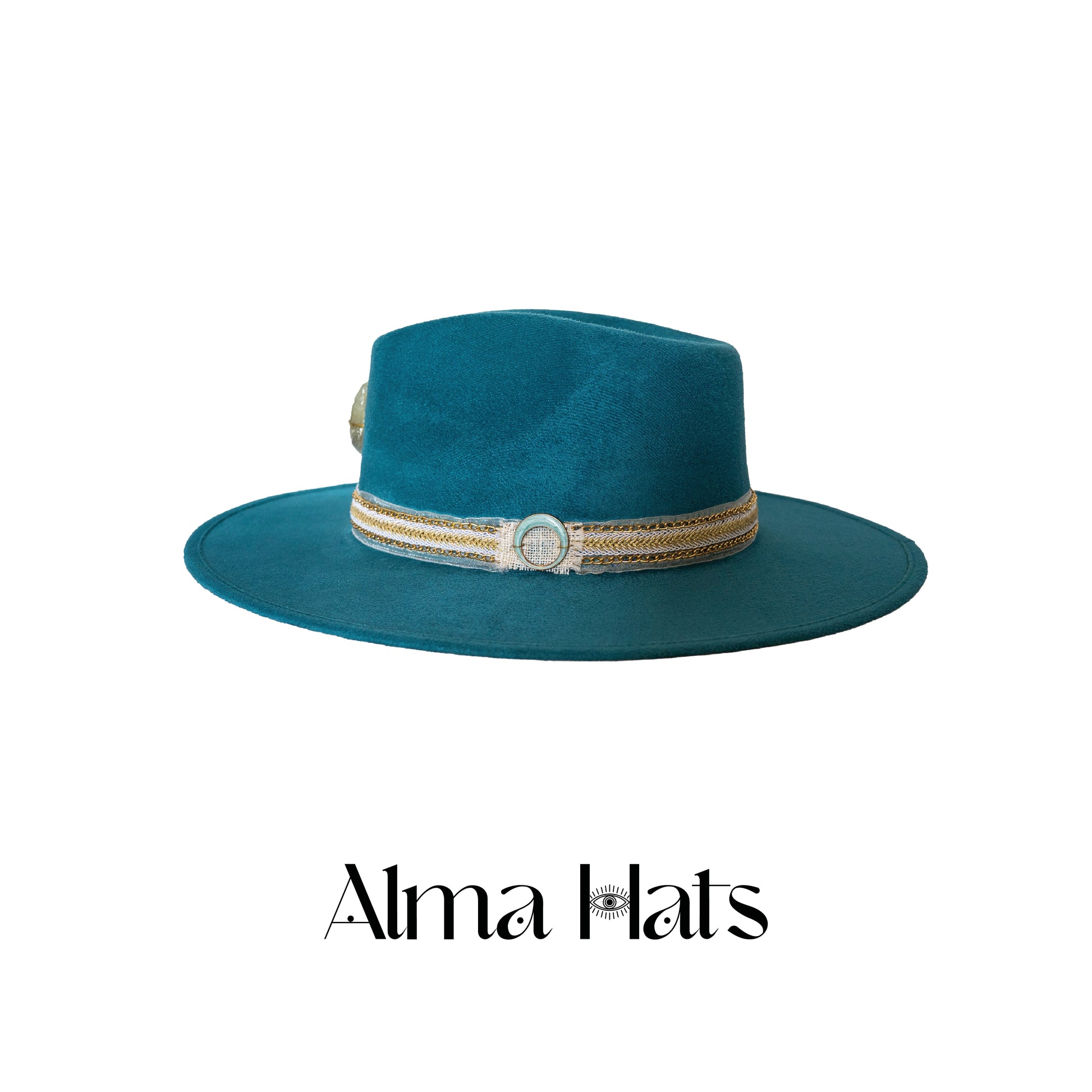 Handmade Turquoise Fedora with Quartz Stone, Golden Charms & Stunning Fabric Strip – One of a Kind