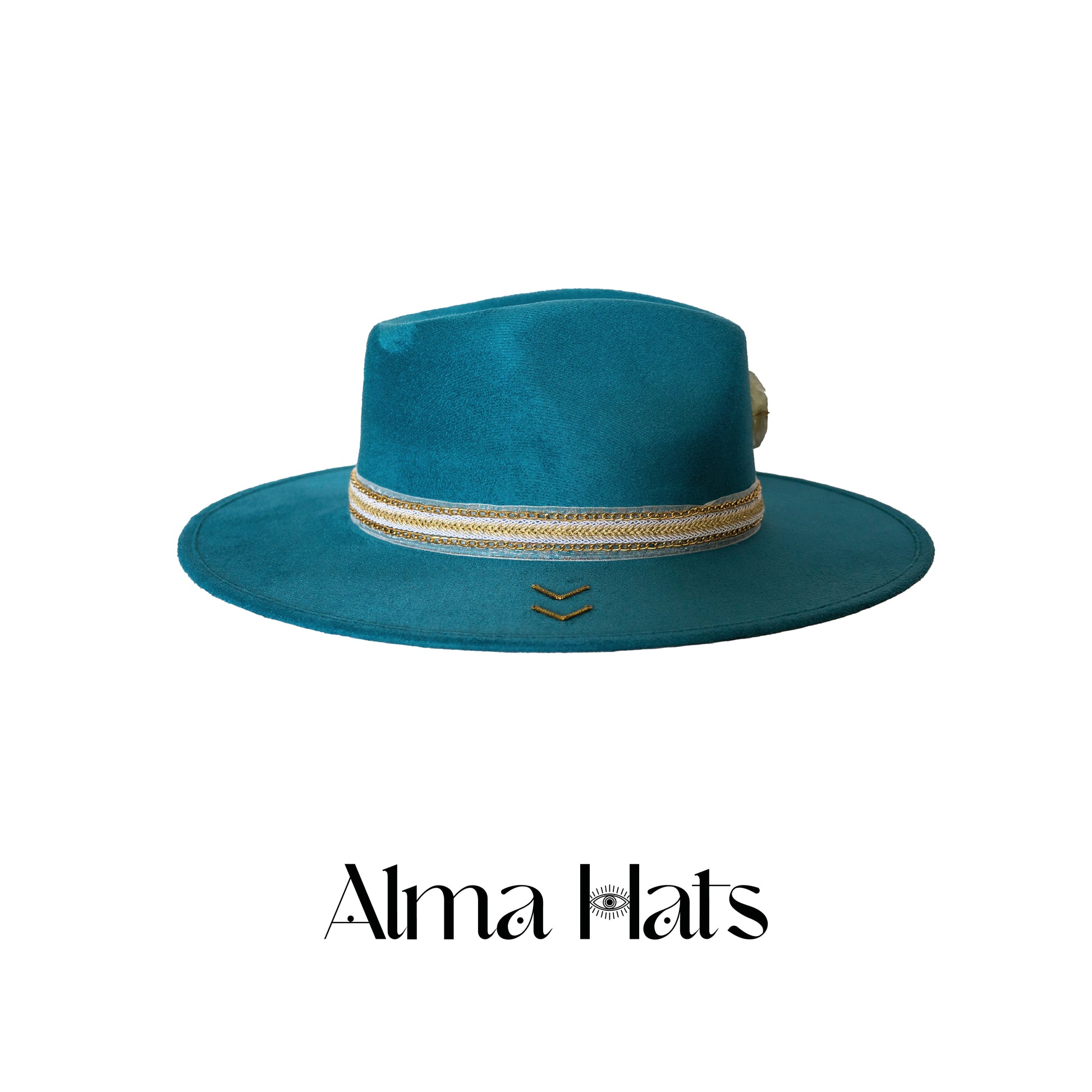Wrapped around the base of the fedora, a stunning fabric strip adds texture and sophistication, beautifully complementing the turquoise hue with its intricate design. The fabric’s rich detail enhances the overall aesthetic, elevating the hat with a touch of luxury and artistry.