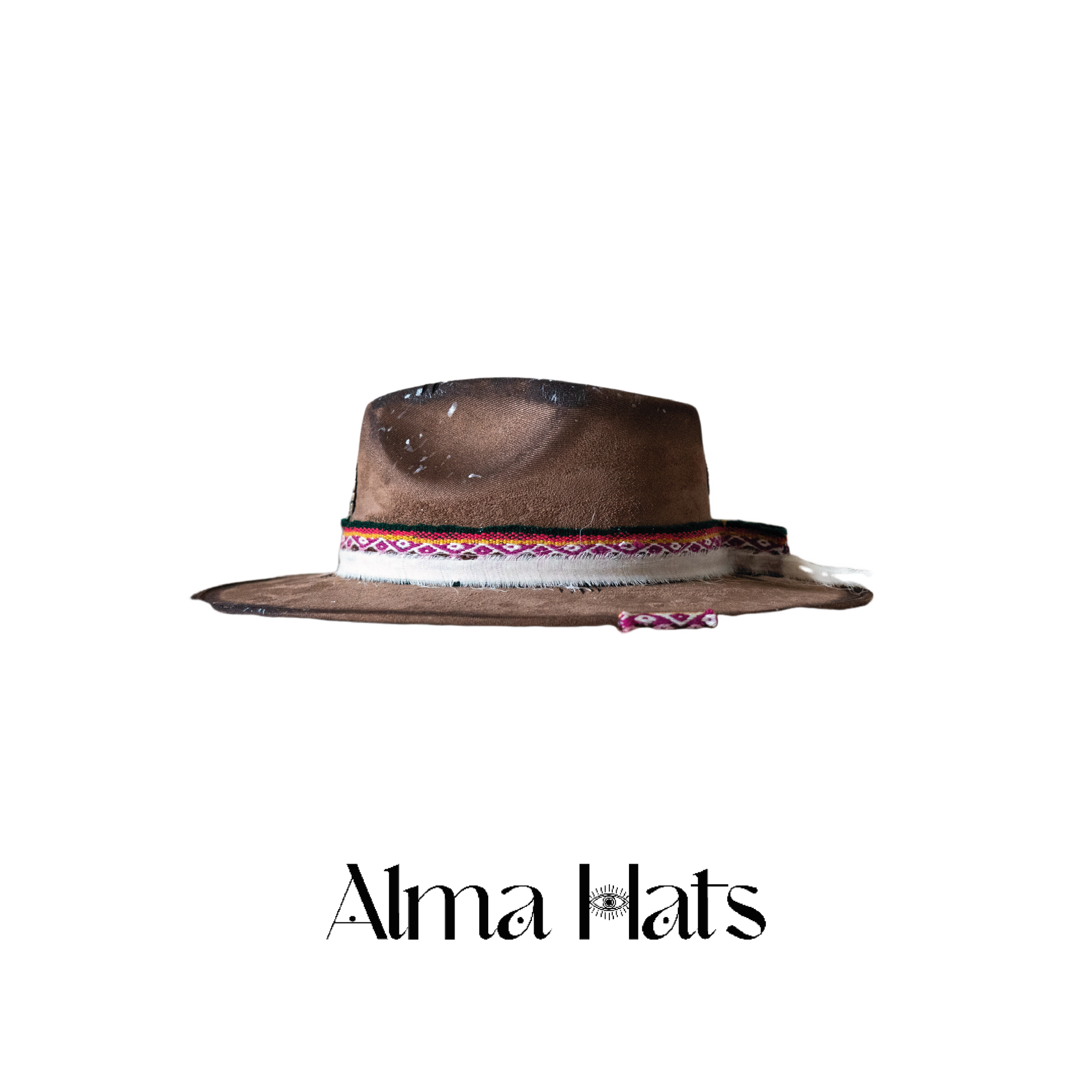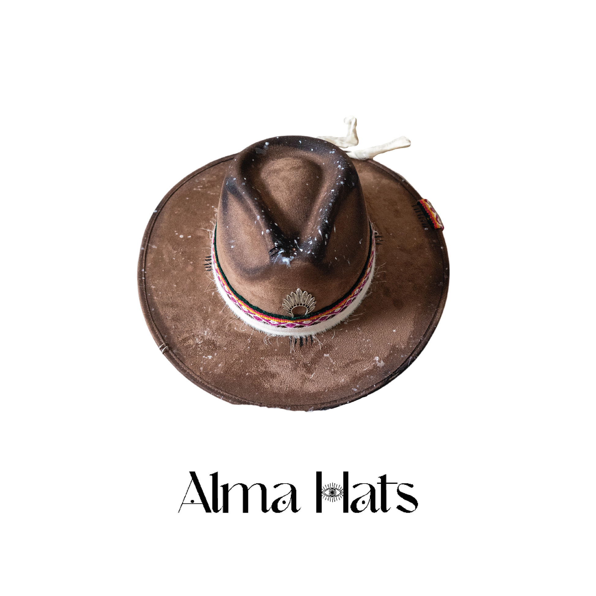 The hat also features a distinctive white-painted and burned effect, giving it a rugged, yet artistic finish. This effect adds texture and depth, creating a sense of history and character, as if the hat has been through countless adventures. The white accents stand out vividly against the brown, creating a dynamic visual interplay between light and dark.