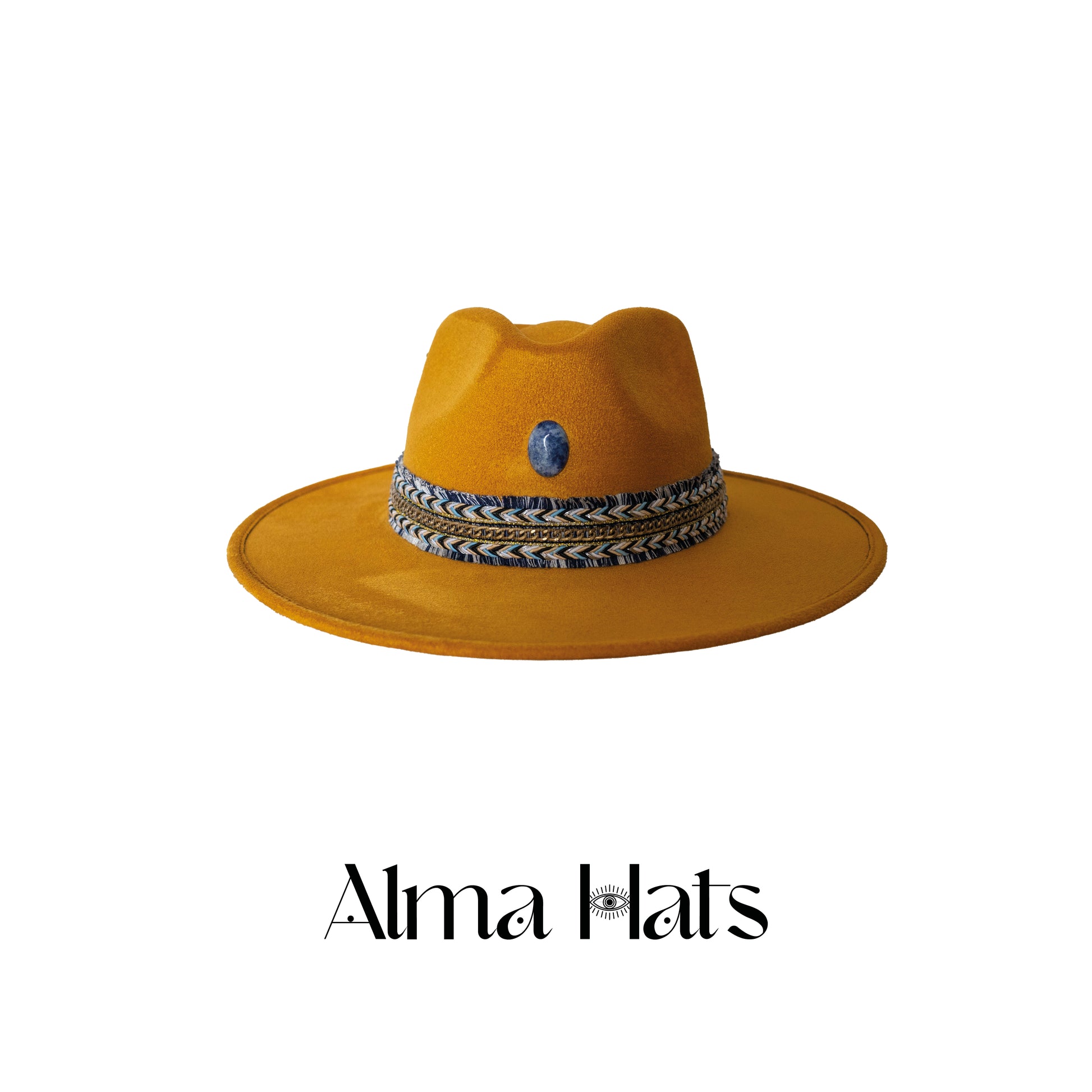 Step into radiant self-expression with this unique, handmade yellow hat, infused with creativity and soul. At its heart lies a genuine Larimar stone, a rare gem of the Caribbean known for its calming, oceanic energy and connection to divine feminine wisdom.