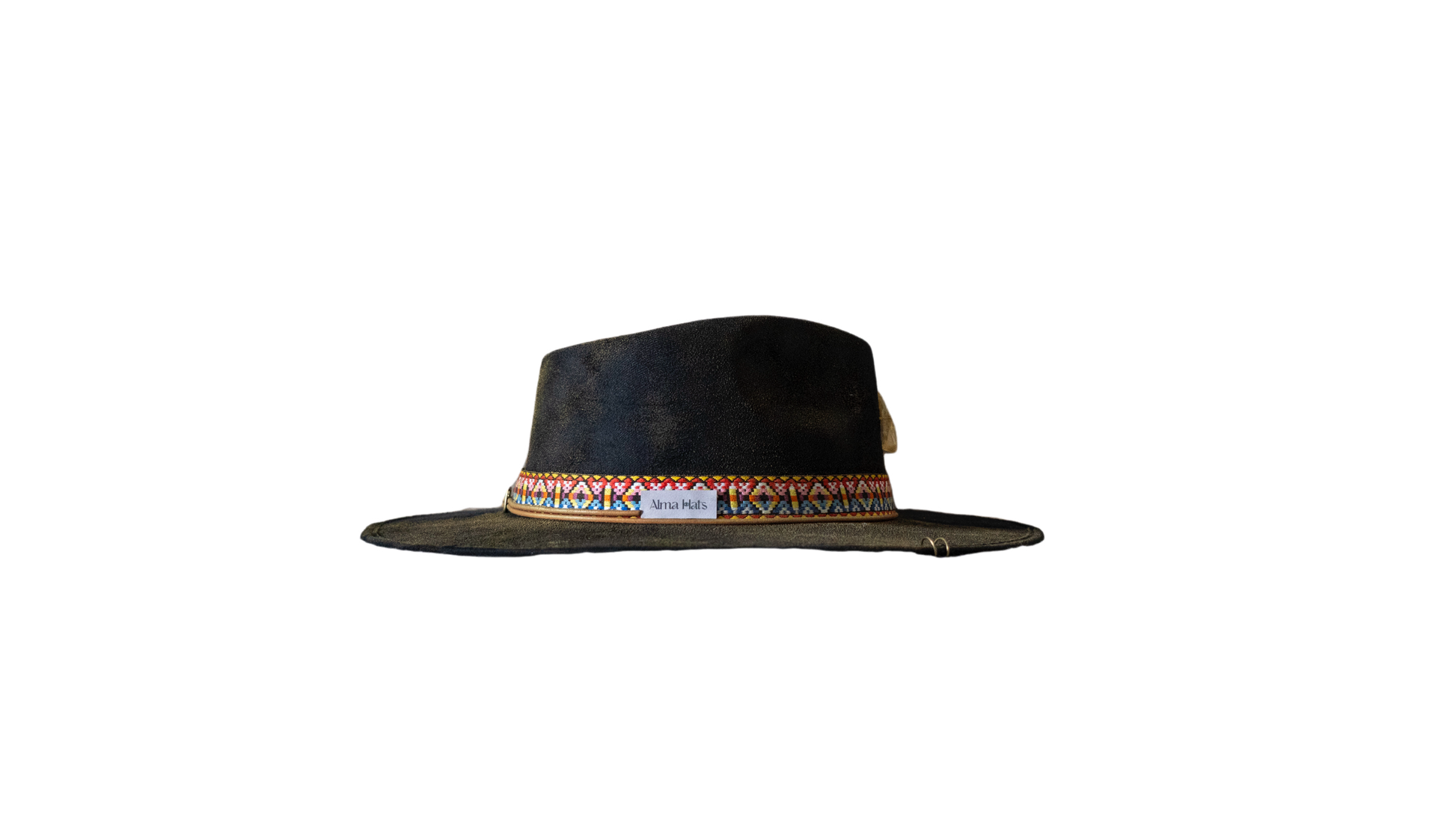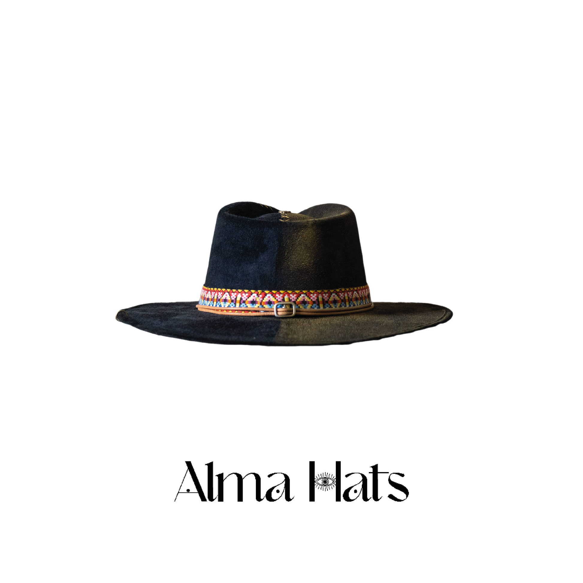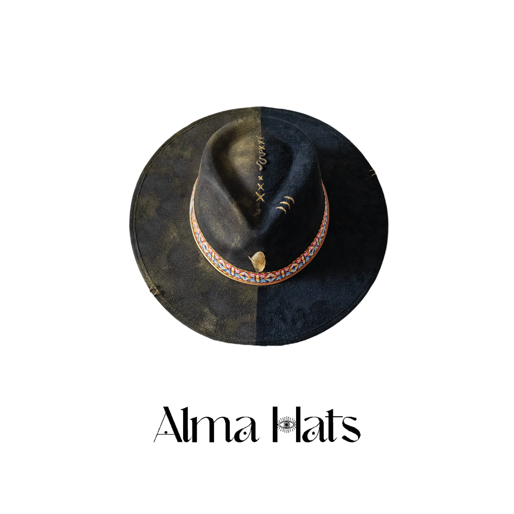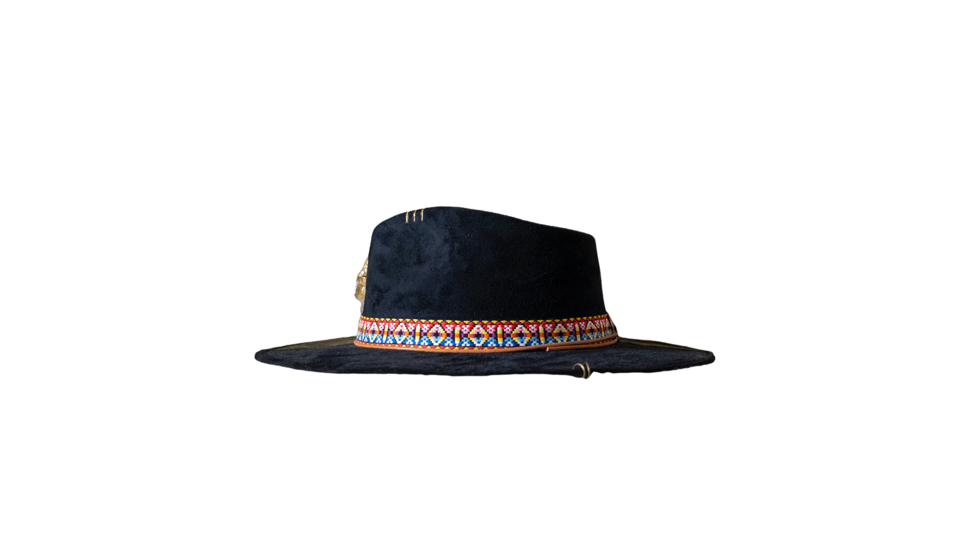 Adding to the hat's unique style are vintage rings, intricately arranged to complement the overall design. These rings, with their timeworn charm, evoke a sense of history and craftsmanship, bringing a touch of timeless elegance to the piece. At the top of the hat, a carefully placed snake medal in gold adds a bold statement. The snake, a symbol of transformation, wisdom, and rebirth, imbues the hat with deeper meaning, making it a powerful accessory.