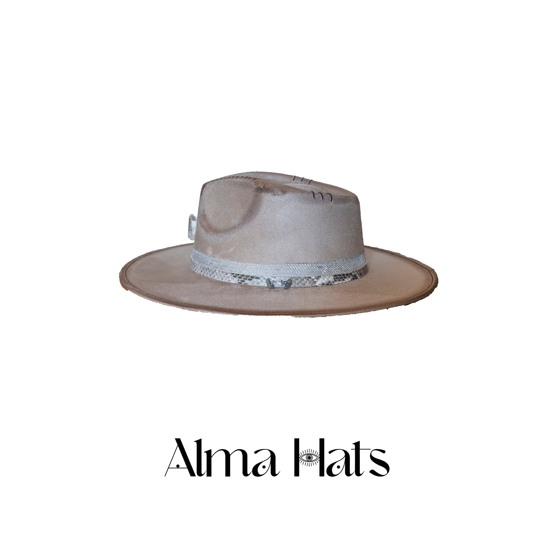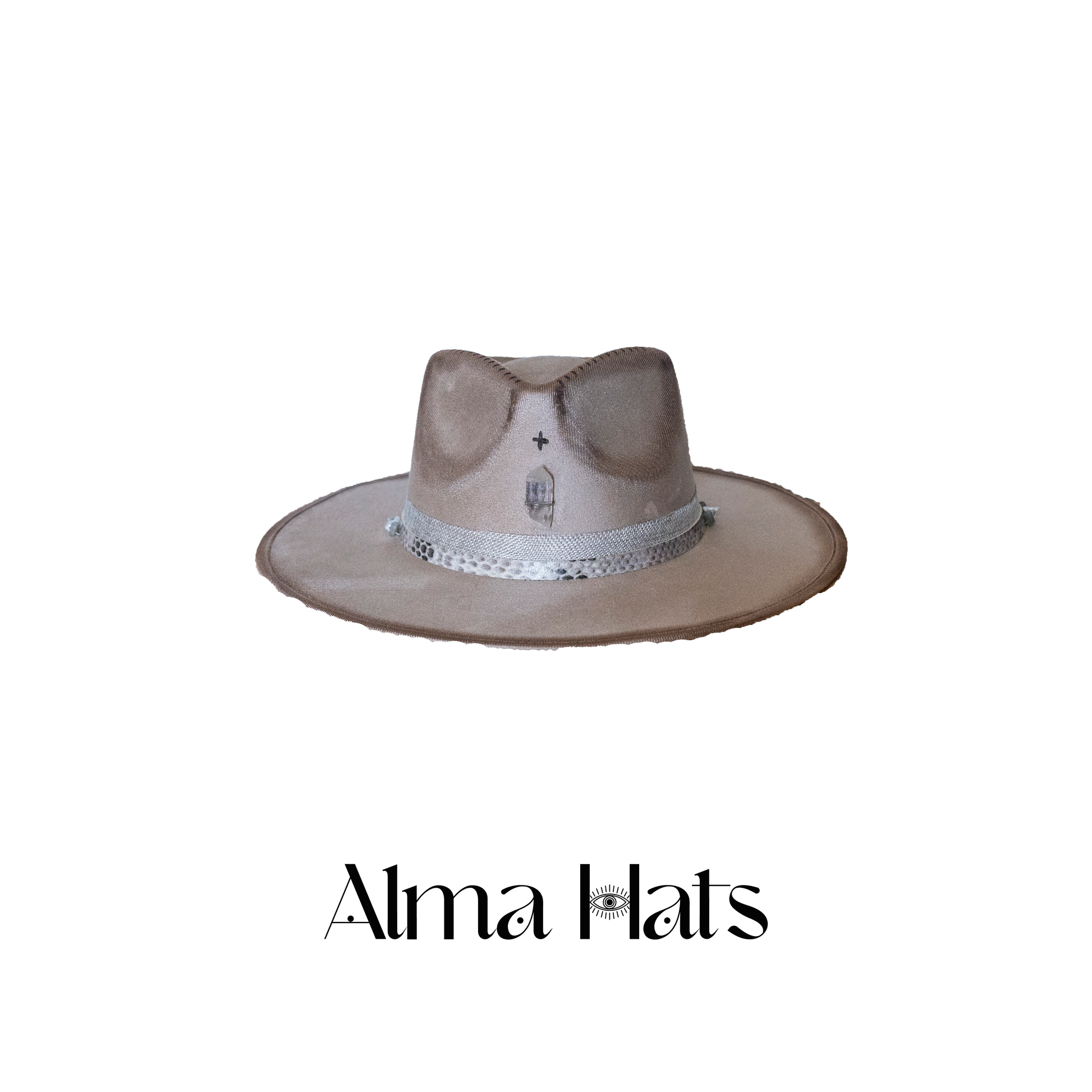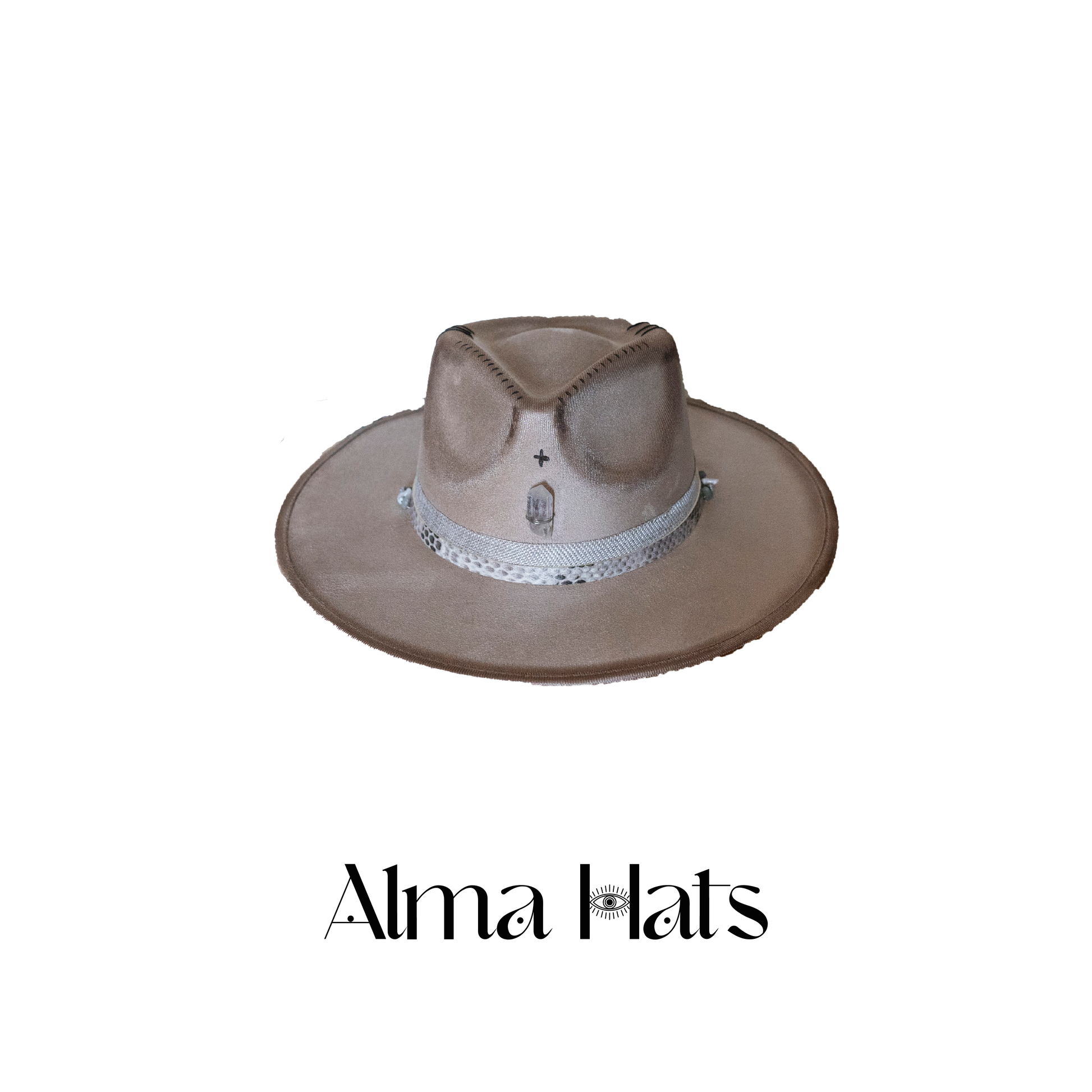 At the centerpiece lies a brilliant crystal stone, set with precision to reflect both light and intention. Surrounding it, delicate pyrography details are burned into the material with masterful finesse, adding depth, warmth, and an ancient whisper to the modern silhouette. On one side of the hat, a series of refined pearls are thoughtfully placed, harmonizing elegantly with a bold accent of authentic snake leather, creating a striking balance between raw edge and mystic elegance.