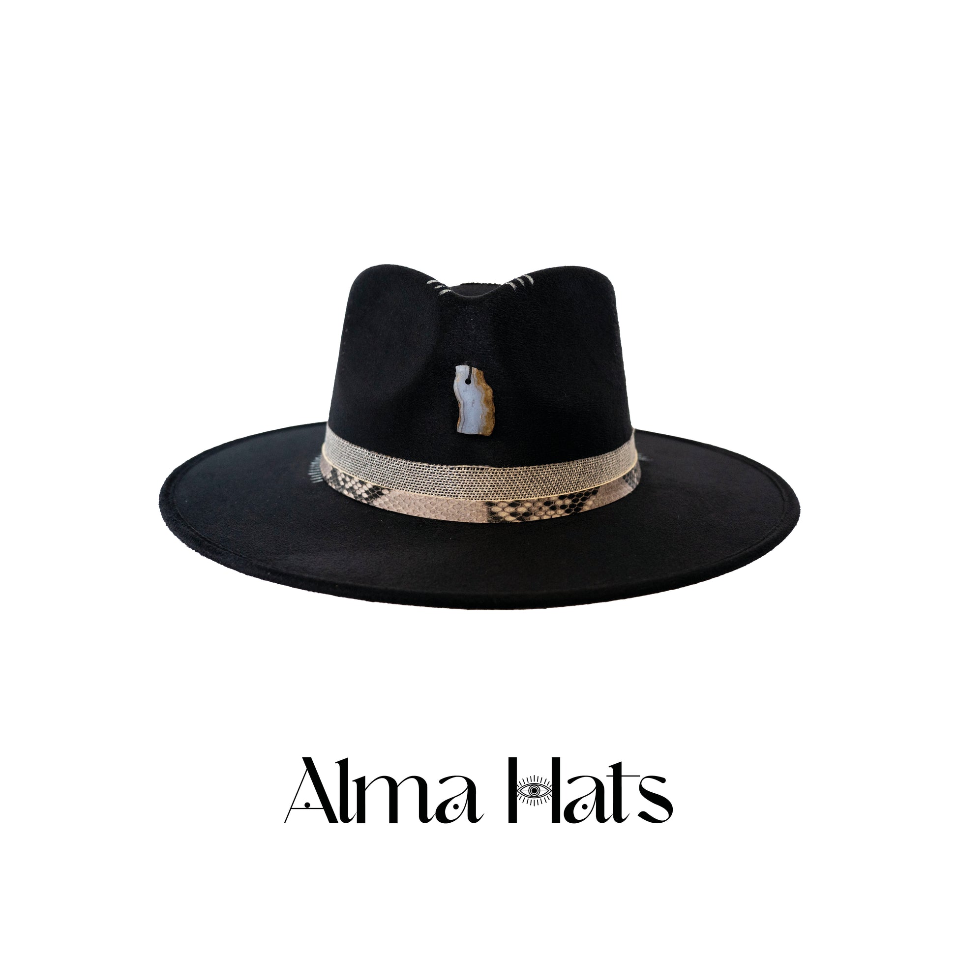Crafted for depth, strength, and soul, this handmade black fedora is a one-of-a-kind piece, where grounded elegance meets sacred symbolism. At its center, a natural agate stone anchors the design — a stone known for its stabilizing energy, inner strength, and connection to the earth.