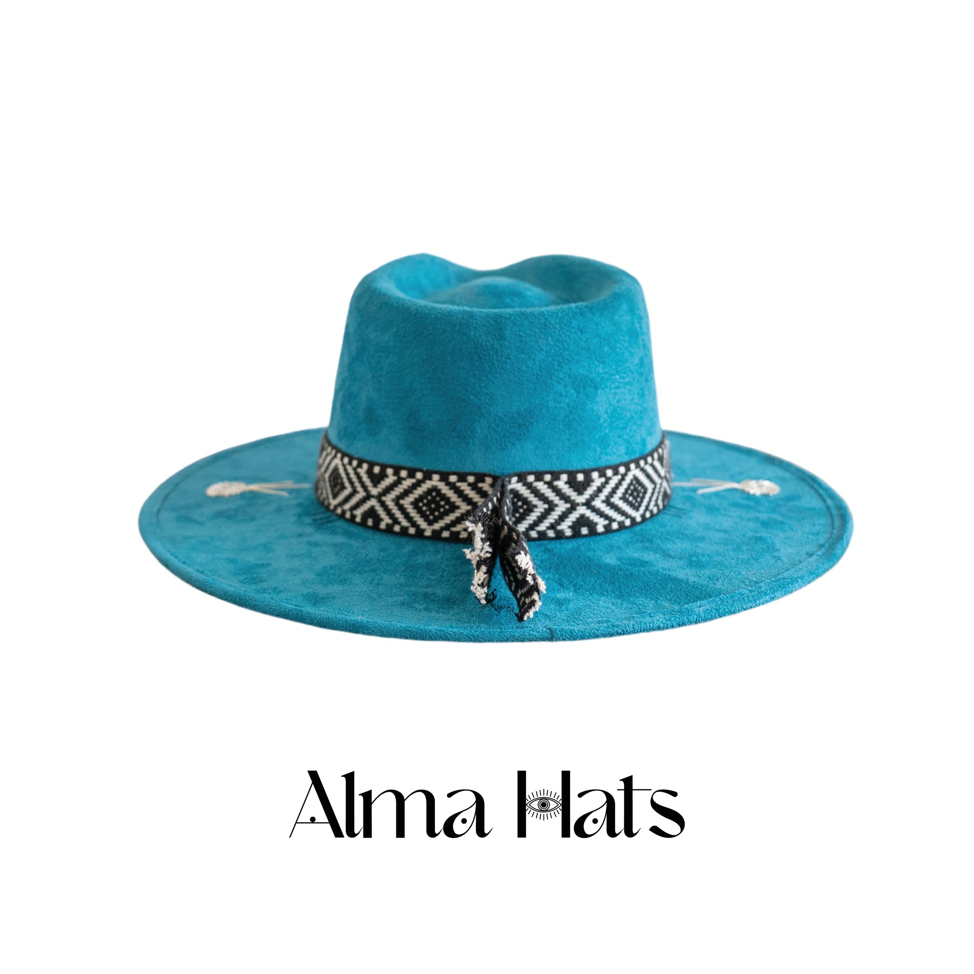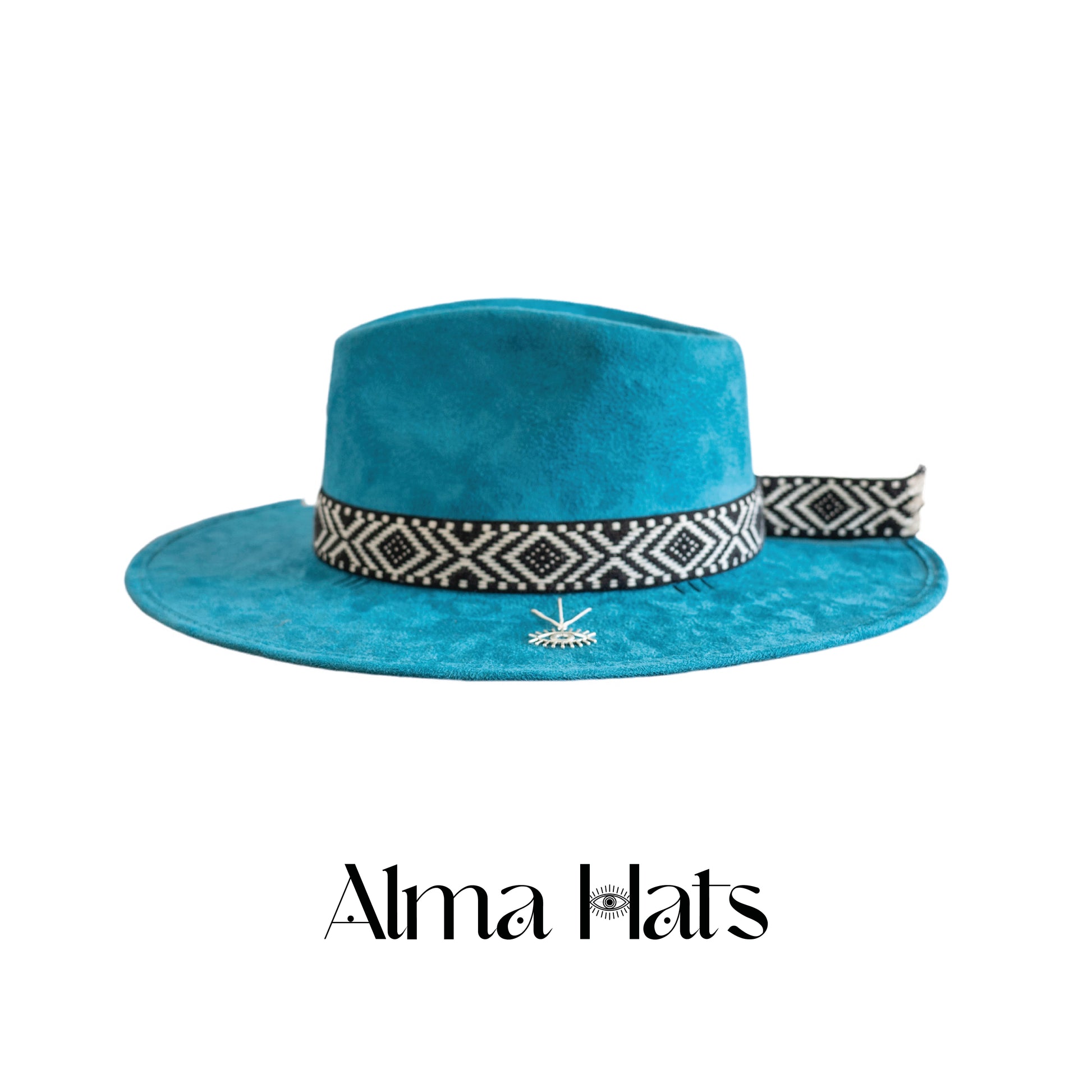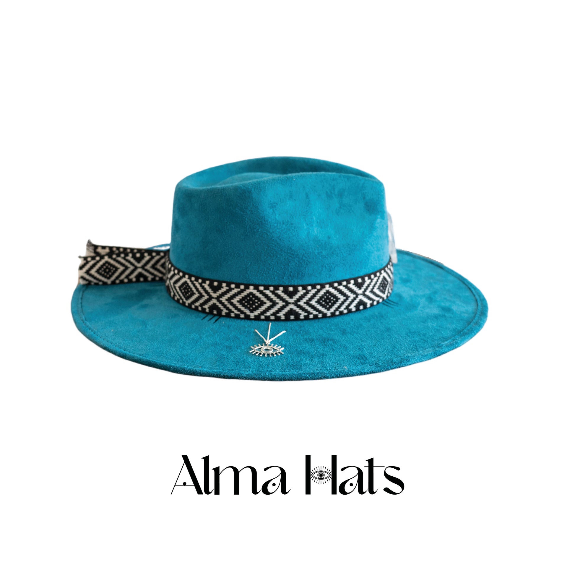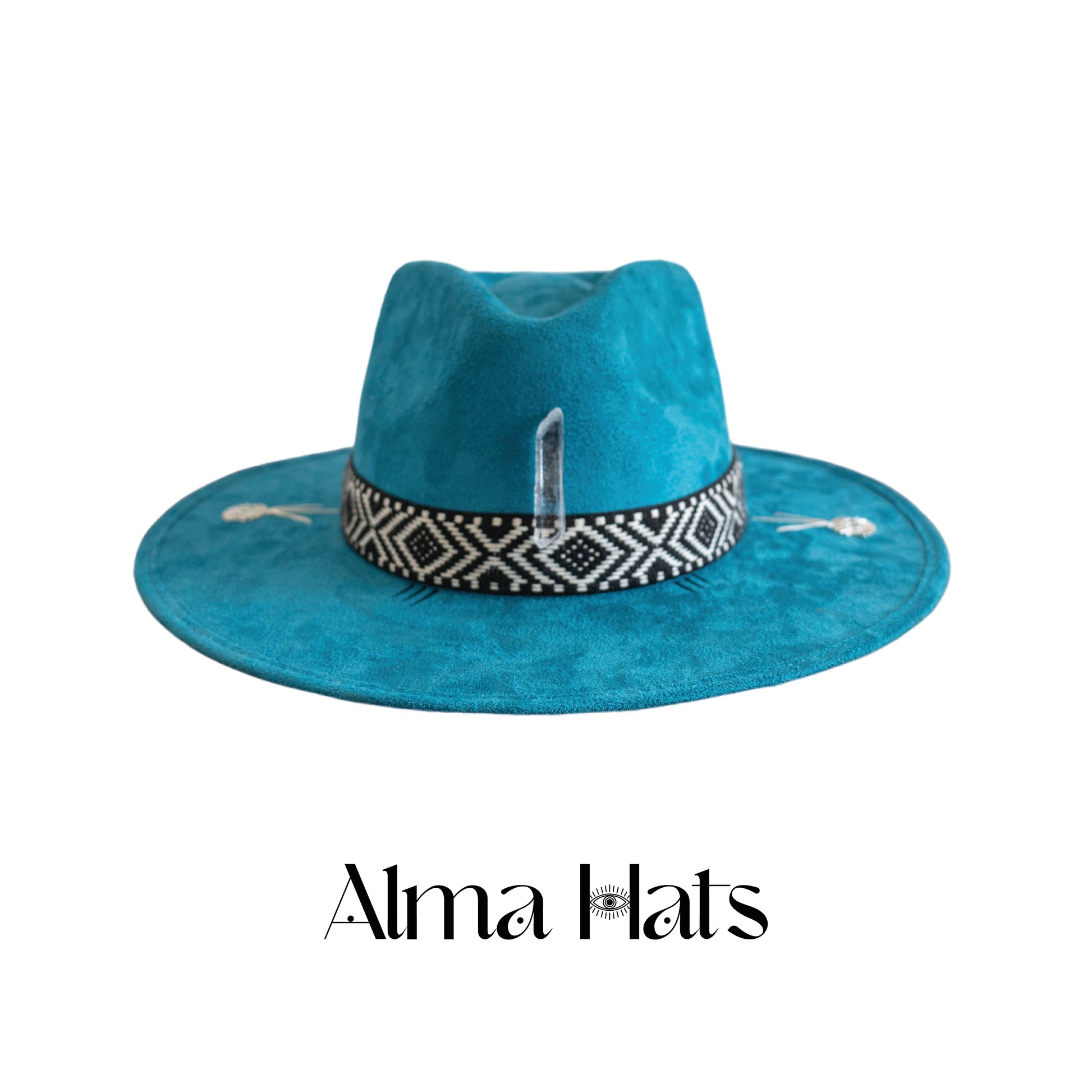 Introducing SEAL, an exquisite custom hat that captures the essence of the sea with its intense turquoise color and symbolic crystal stone centerpiece.