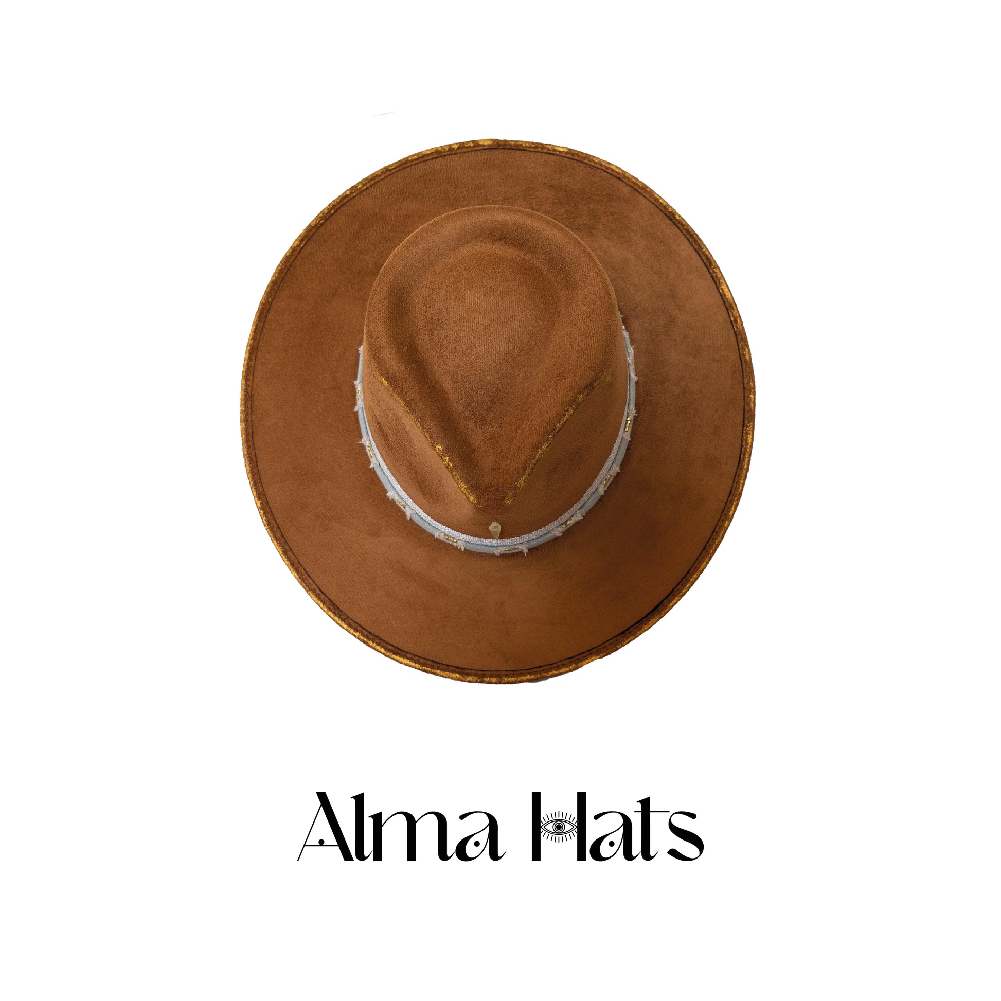 The hat’s soft camel tone is enhanced with delicate gold painting effects, subtly adding a touch of luxury and depth to its structure. The gold accents flow across the hat in organic patterns, giving the piece an artful, dynamic feel that shifts with the light — a perfect fusion of elegance and vitality.
