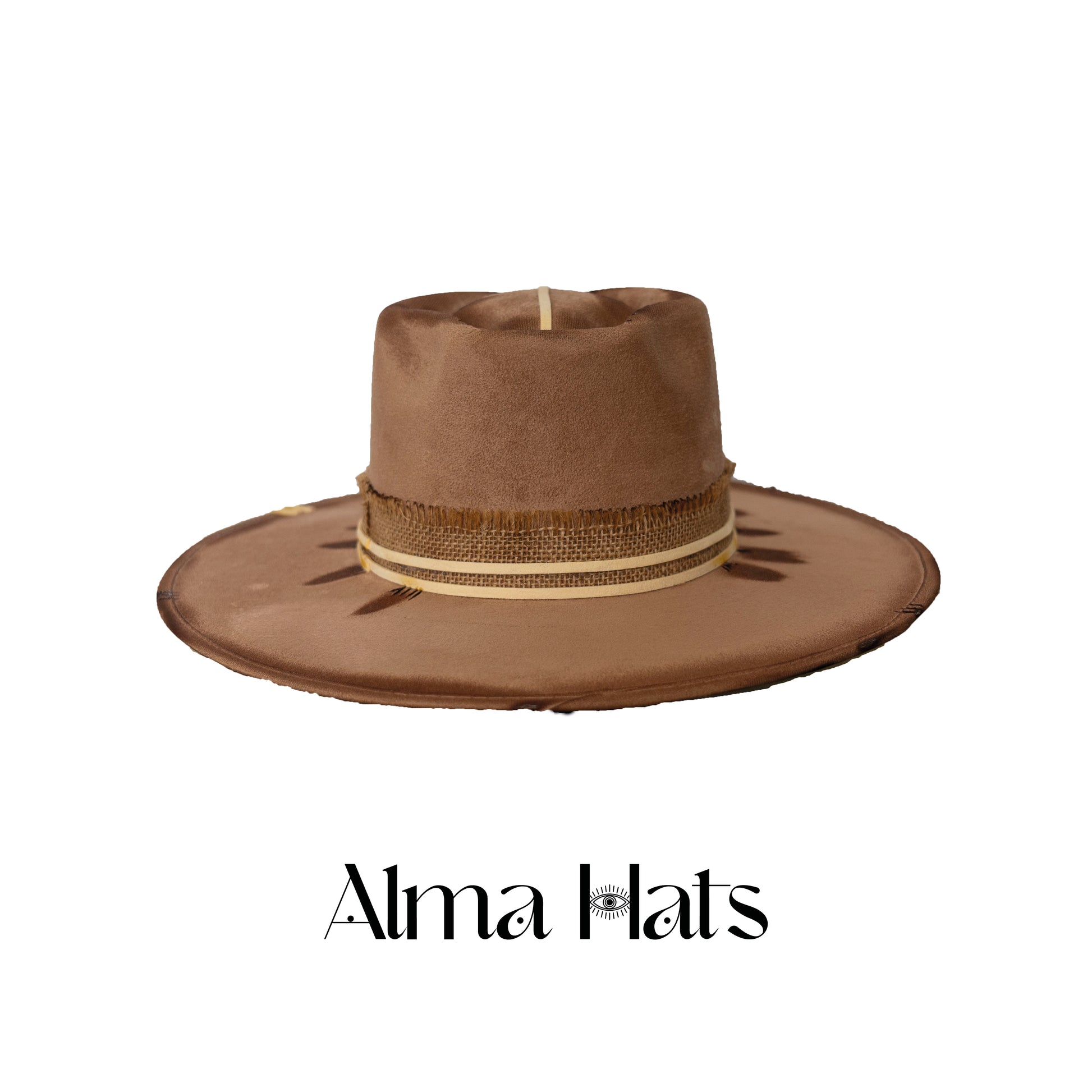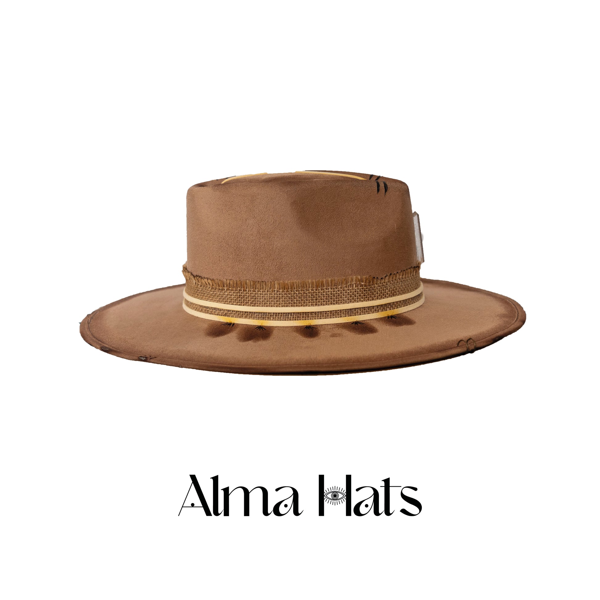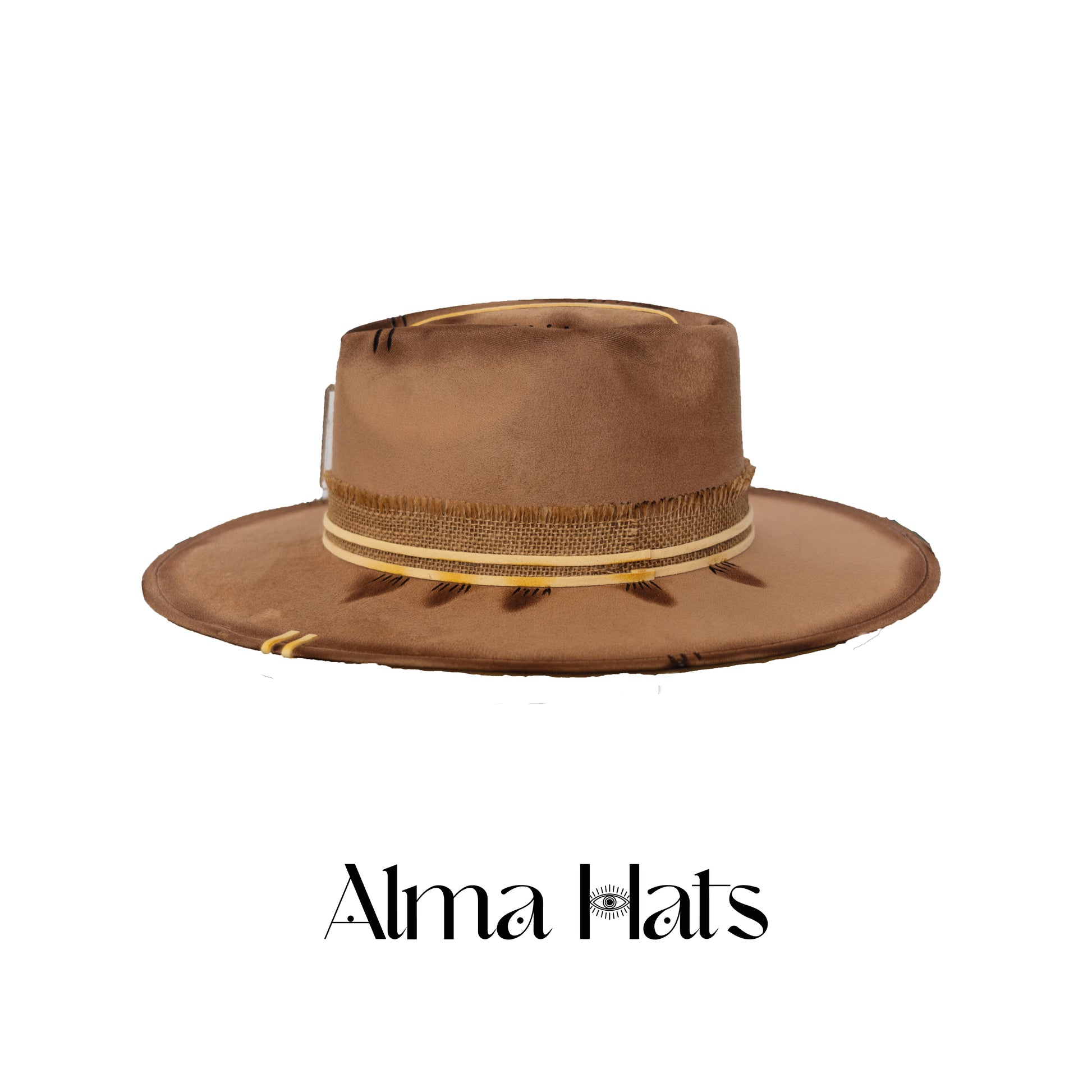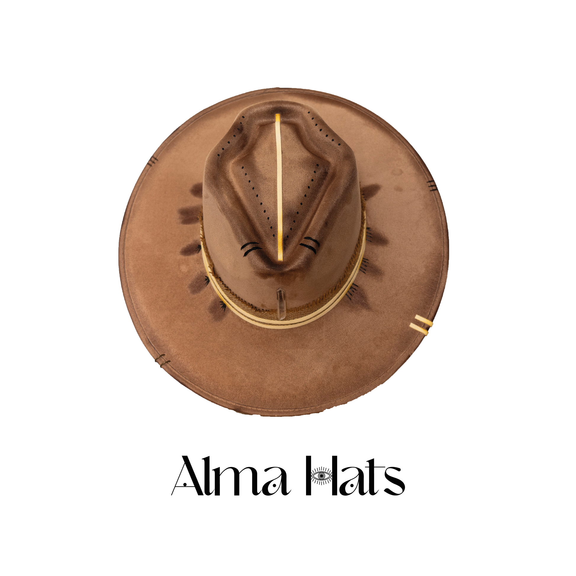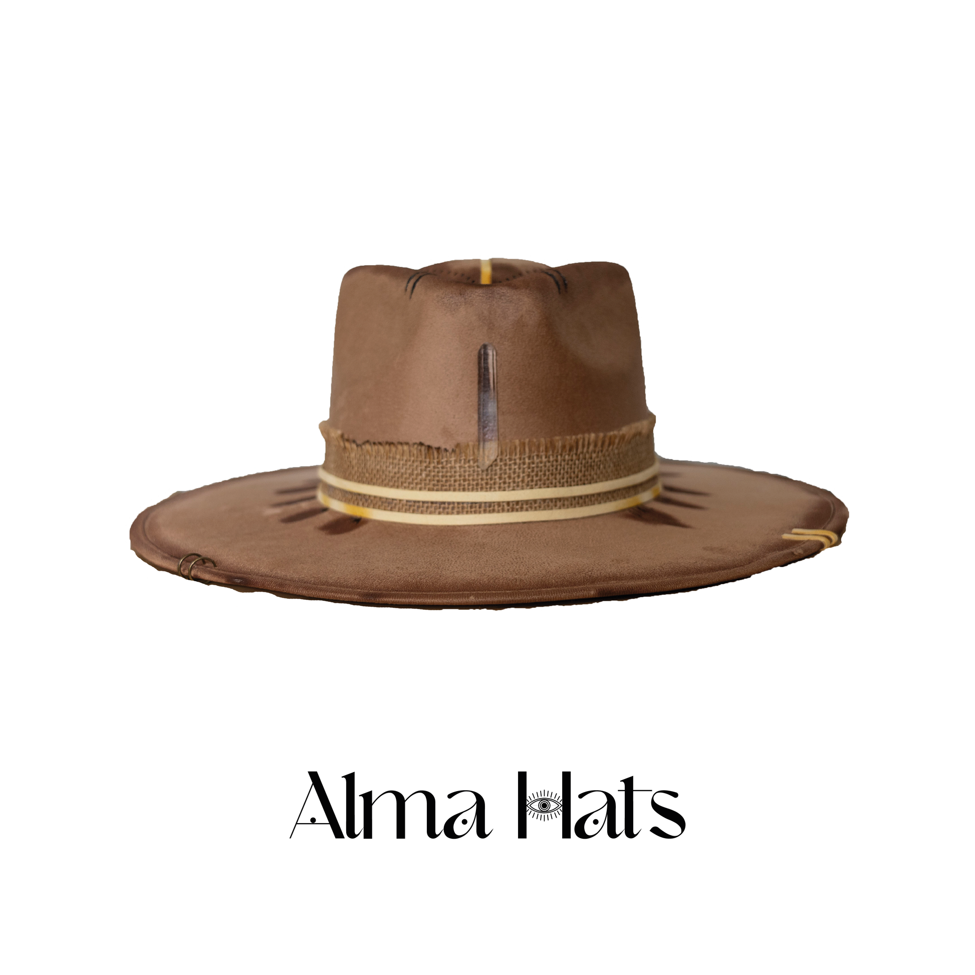 Encircling the crown are supple leather cords, hand-wrapped with intentional spacing to create texture and depth. These cords weave around the hat like nomadic trails, symbolizing the journey of the soul through ever-shifting terrain. Strategic burn effects char select areas of the brim and crown, lending each piece a unique, fire-kissed patina—an echo of transformation and the fierce beauty of controlled flames.