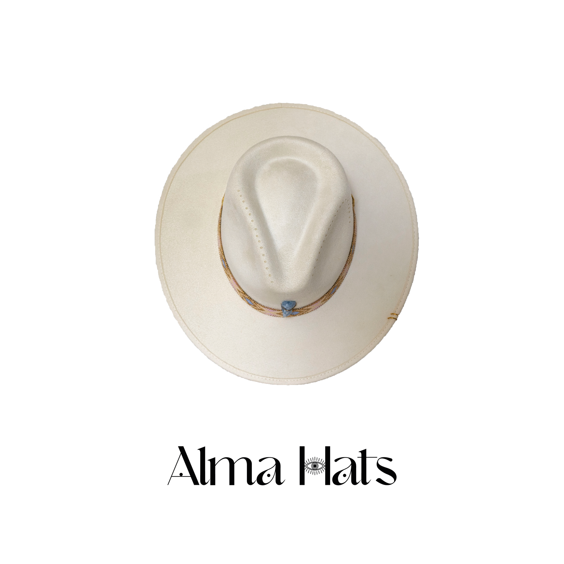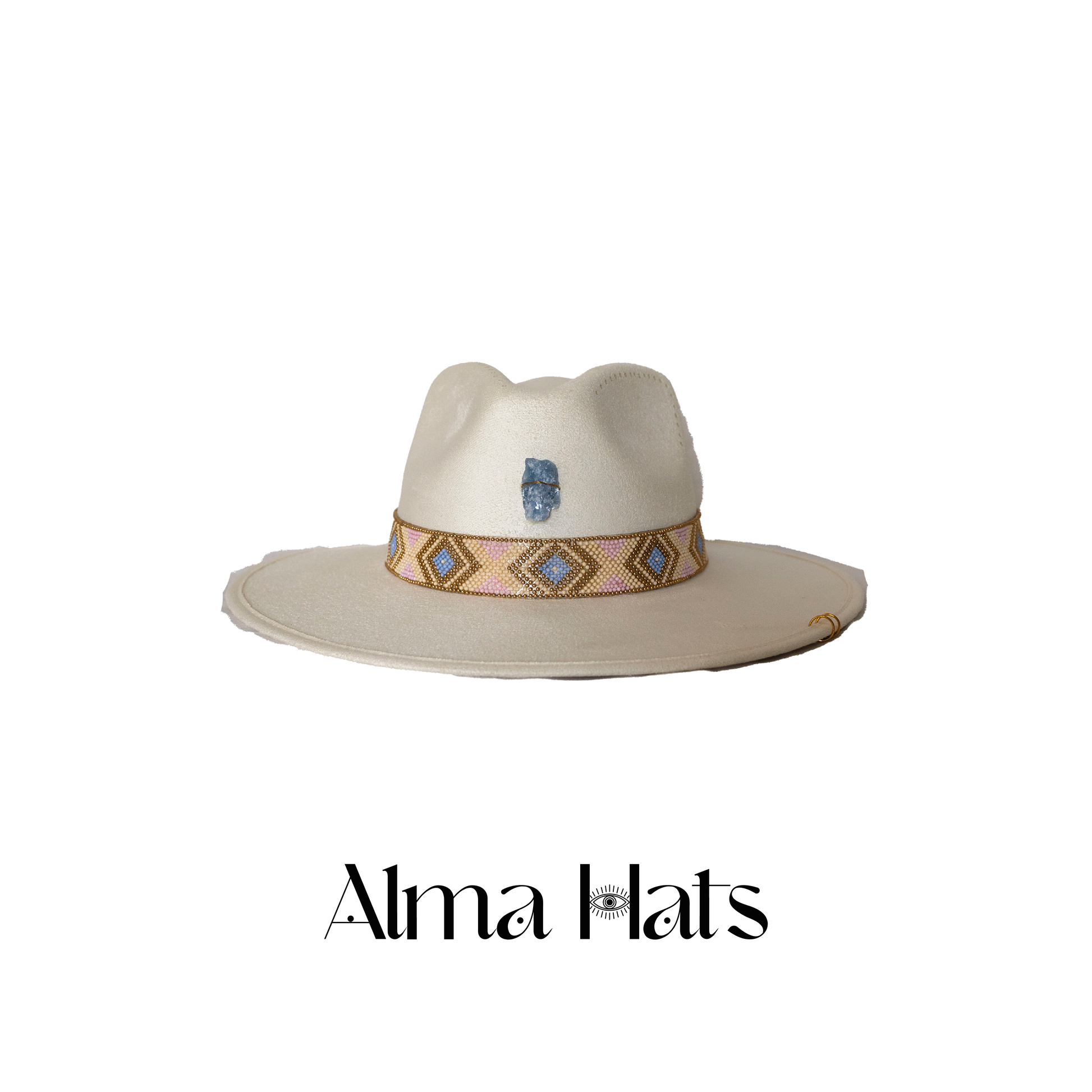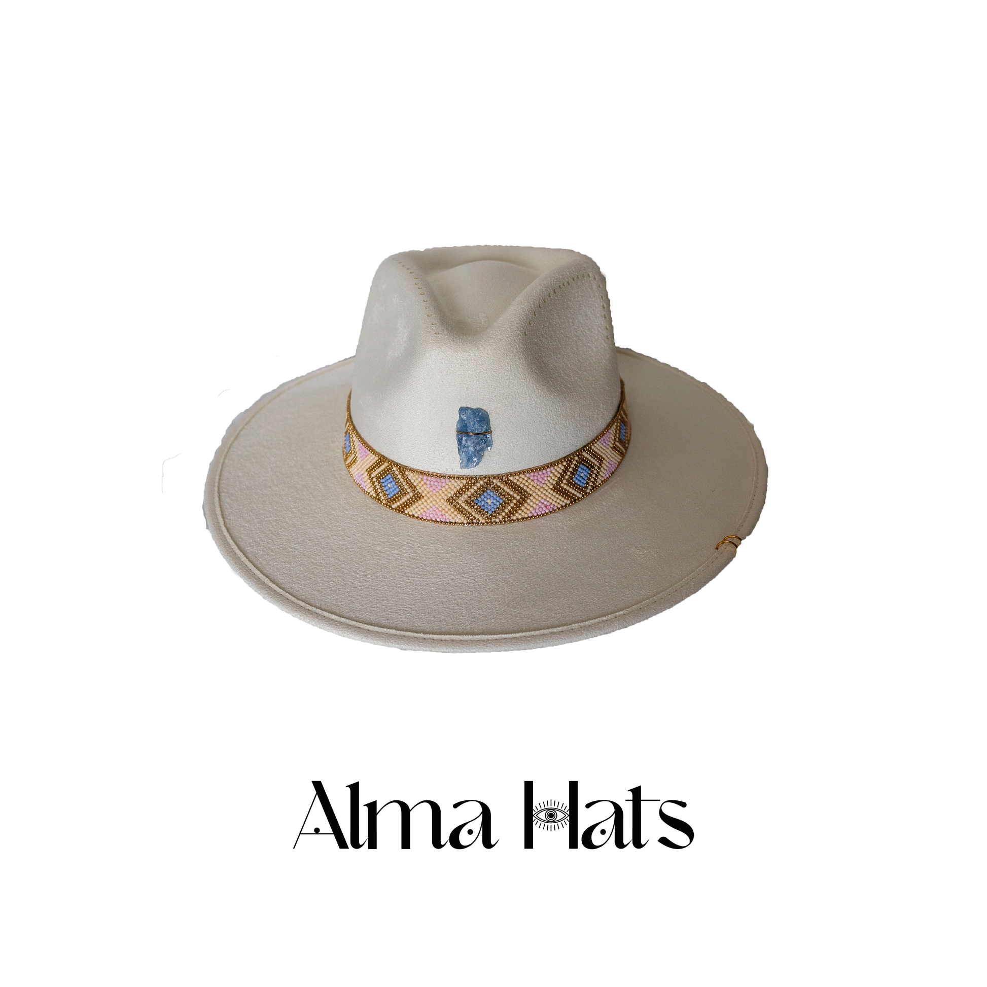 Bloom is a unique, feminine white fedora designed to celebrate elegance, color, and individuality. At its center rests a blue stone, radiating calm and harmony, while a vibrant fabric strip wraps the crown, infusing playful energy and personality. Delicate gold rings accent the design, adding a touch of sophistication and shine.