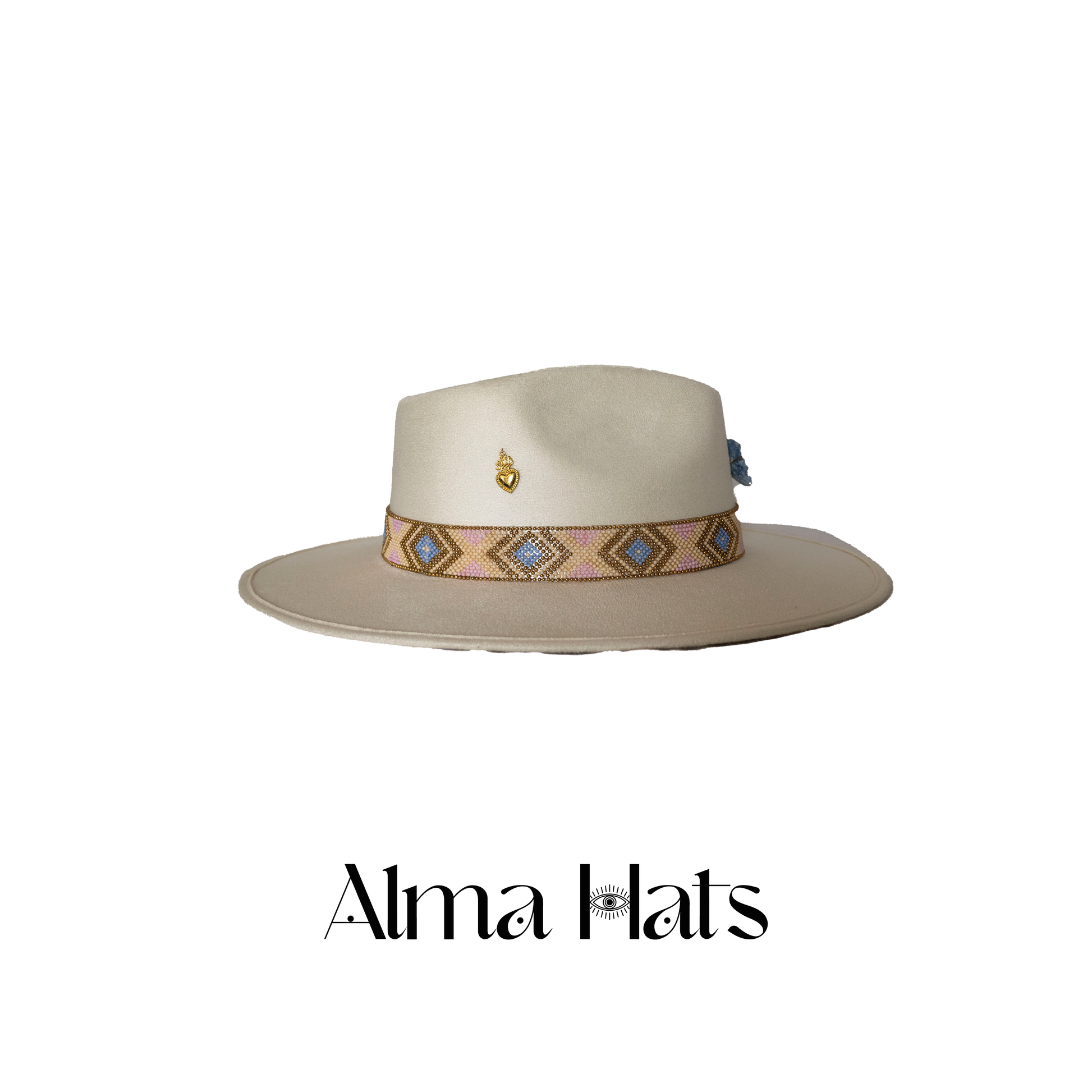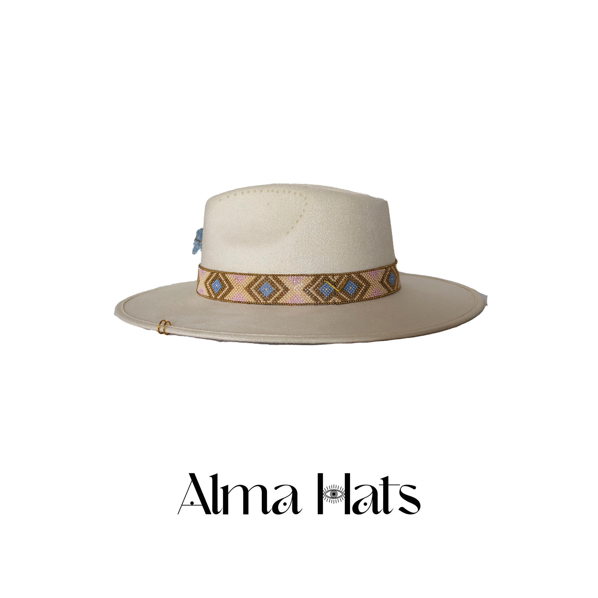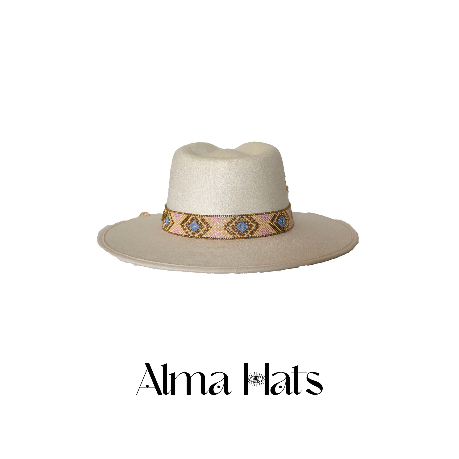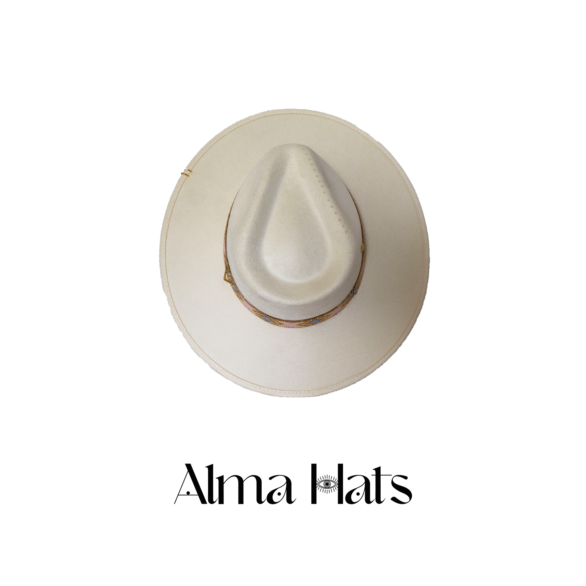 Bloom is a unique, feminine white fedora designed to celebrate elegance, color, and individuality. At its center rests a blue stone, radiating calm and harmony, while a vibrant fabric strip wraps the crown, infusing playful energy and personality. Delicate gold rings accent the design, adding a touch of sophistication and shine.